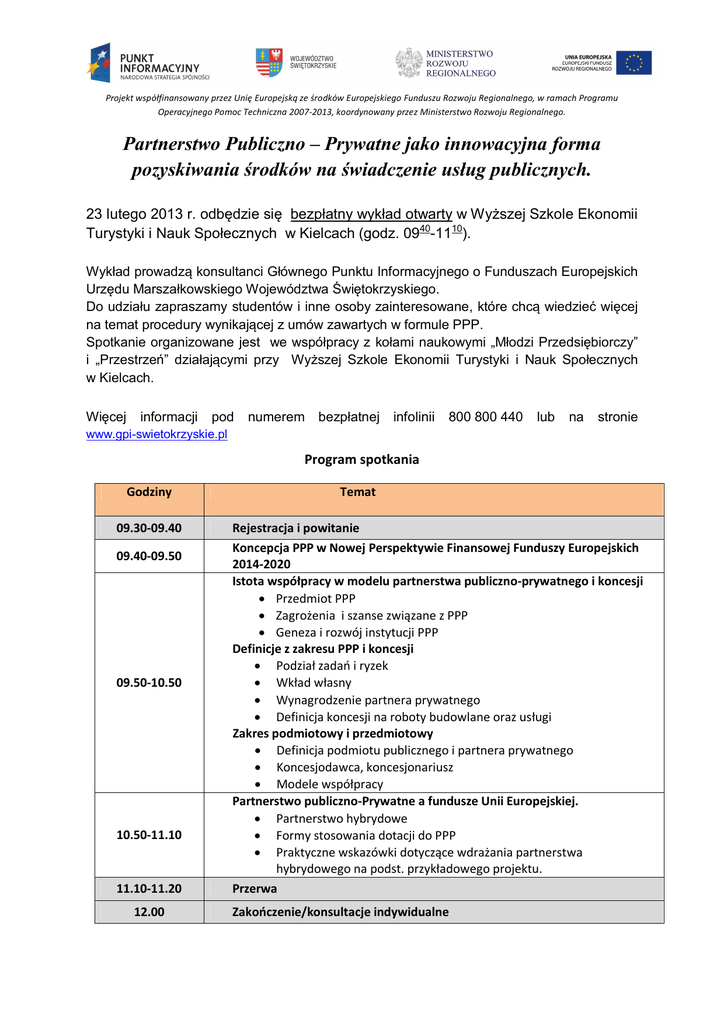 Projekt współfinansowany przez Unię Europejską ze środków Europejskiego Funduszu Rozwoju Regionalnego, w ramach Programu Operacyjnego Pomoc Techniczna 2007-2013, koordynowany przez Ministerstwo Rozwoju Regionalnego. Partnerstwo Publiczno – Prywatne jako innowacyjna forma pozyskiwania środków na świadczenie usług publicznych. 23 lutego 2013 r. odbędzie się bezpłatny wykład otwarty w Wyższej Szkole Ekonomii Turystyki i Nauk Społecznych w Kielcach (godz. 0940-1110). Wykład prowadzą konsultanci Głównego Punktu Informacyjnego o Funduszach Europejskich Urzędu Marszałkowskiego Województwa Świętokrzyskiego. Do udziału zapraszamy studentów i inne osoby zainteresowane, które chcą wiedzieć więcej na temat procedury wynikającej z umów zawartych w formule PPP. Spotkanie organizowane jest we współpracy z kołami naukowymi „Młodzi Przedsiębiorczy” i „Przestrzeń” działającymi przy Wyższej Szkole Ekonomii Turystyki i Nauk Społecznych w Kielcach. Więcej informacji pod numerem bezpłatnej infolinii 800 800 440 lub na stronie www.gpi-swietokrzyskie.pl Program spotkania Godziny 09.30-09.40 09.40-09.50 09.50-10.50 10.50-11.10 11.10-11.20 12.00 Temat Rejestracja i powitanie Koncepcja PPP w Nowej Perspektywie Finansowej Funduszy Europejskich 2014-2020 Istota współpracy w modelu partnerstwa publiczno-prywatnego i koncesji  Przedmiot PPP  Zagrożenia i szanse związane z PPP  Geneza i rozwój instytucji PPP Definicje z zakresu PPP i koncesji  Podział zadań i ryzek  Wkład własny  Wynagrodzenie partnera prywatnego  Definicja koncesji na roboty budowlane oraz usługi Zakres podmiotowy i przedmiotowy  Definicja podmiotu publicznego i partnera prywatnego  Koncesjodawca, koncesjonariusz  Modele współpracy Partnerstwo publiczno-Prywatne a fundusze Unii Europejskiej.  Partnerstwo hybrydowe  Formy stosowania dotacji do PPP  Praktyczne wskazówki dotyczące wdrażania partnerstwa hybrydowego na podst. przykładowego projektu. Przerwa Zakończenie/konsultacje indywidualne