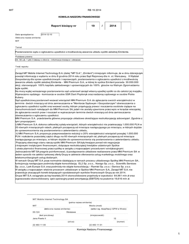 MIT RB 19 2014 KOMISJA NADZORU FINANSOWEGO Raport bieżący nr 19 / 2014 2014-12-10 Data sporządzenia: Skróc ona nazwa emitenta MIT Temat Postanowienie sądu o ogłoszeniu upadłości z możliwością zawarcia układu spółki zależnej Emitenta. Podstawa prawna Art. 56 ust. 1 pkt 2 Ustawy o oferc ie - informac je bieżąc e i okresowe Treść raportu: Zarząd MIT Mobile Internet Technology S.A. (dalej "MIT S.A.", „Emitent”) niniejszym informuje, że w dniu dzisiejszym powziął informację o wydaniu w dniu 8 grudnia 2014 roku przez Sąd Rejonowy dla m. st. Warszawy, X Wydział Gospodarczy dla spraw upadłościowych i naprawczych, postanowienia o ogłoszeniu upadłości z możliwością zawarcia układu spółki zależnej Emitenta - MNI Premium S.A., w której to spółce Emitent posiada 30.050.000 akcji, stanowiących 100% kapitału zakładowego i uprawniających do 100% głosów na Walnym Zgromadzeniu tejże spółki. Na mocy wyżej wskazanego postanowienia sąd ustanowił zarząd własny upadłej spółki co do całości jej majątku. Wyznaczono sędziego - komisarza w osobie SSR Darii Popłonyk oraz nadzorcę sądowego w osobie Piotra Kubery. Sąd upadłościowy postanowił wezwać wierzycieli MNI Premium S.A. do zgłaszania swoich wierzytelności w terminie dwóch miesięcy od dnia zamieszczenia w "Monitorze Sądowym i Gospodarczym" obwieszczenia o ogłoszeniu upadłości spółki oraz wezwać osoby, którym przysługują prawa i roszczenia osobiste ciążące na nieruchomościach należących do MNI Premium SA, jeżeli nie zostały ujawnione przez wpis w księdze wieczystej, do zgłoszenia swoich praw i roszczeń w wyznaczonym terminie dwóch miesięcy od dnia zamieszczenia obwieszczenia o ogłoszeniu upadłości. MNI Premium S.A. przedstawiła główne propozycje układowe określające restrukturyzację zobowiązań. Zgodnie z tymi propozycjami: i) MNI Premium S.A. dokona całkowitej spłaty wierzycieli, których wierzytelności nie przekraczają 1.000.000 PLN w 20 równych miesięcznych ratach, płatnych począwszy od miesiąca następującego po miesiącu, w których dojdzie do uprawomocnienia się postanowienia o zatwierdzeniu układu, ii) MNI Premium S.A. proponuje przeprowadzenie redukcji o 20% wierzytelności wierzycieli powyżej 1.000.000 PLN i rozłożenie pozostałej części długu na 60 równych miesięcznych rat, płatnych począwszy od miesiąca następującego po miesiącu, w którym dojdzie do uprawomocnienia się postanowienia o zatwierdzeniu układu. Przyczyną obecnego stanu rzeczy spółki MNI Premium SA były trwające ponad rok negocjacje z krajowymi instytucjami finansowymi, dotyczące restrukturyzacji kredytów udzielonych Spółce i utrata płynności finansowej przez spółkę w związku z rozpoczętymi procedurami windykacyjnymi. Jednocześnie MIT SA pragnie poinformować, iż postępowanie układowe realizowane przez MNI Premium SA w żaden sposób nie zakłóci rynkowej oferty Grupy w zakresie oferowania usług marketingu mobilnego oraz telekomunikacyjnych usług dodanych. W ramach Grupy MIT S.A. poza normalnie działającą w ramach procesu układowego Spółką MNI Premium SA , funkcjonują następujące podmioty objęte konsolidacją: EL2 Sp. z o.o., Navigo Sp. z o.o., Scientific Services Sp. z o.o., Lark Europe S.A. oraz podmioty nie objęte konsolidacją – Ramtel Sp. z o.o. i Senise Sp. z o.o. W związku z rozpoczętym właśnie procesem układowym w Spółce MNI Premium S.A., Zarząd MIT S.A. nie przewiduje znaczących korekt dotyczących spodziewanych wyników finansowych Grupy za rok 2014. Grupa MIT S.A. osiągnęła za trzy kwartały 2014 skonsolidowane przychody w wysokości 64,961 mln zł oraz wypracowała skonsolidowany zysk operacyjny przed amortyzacją (EBITDA) na poziomie 19,616 mln zł. MIT Mobile Internet Technology SA (pełna nazwa emitenta) Media (med) MIT (skróc ona nazwa emitenta) 00-124 (sektor wg. klasyfikac ji GPW w W-wie) Warszawa (kod poc ztowy) (miejscowość) Jana Pawła II 12 (ulica) 22 483 11 00 (numer) 22 483 11 01 Komisja Nadzoru Finansowego 1 MIT RB 19 2014 (telefon) (fax) [email protected] www.mitsa.pl (e-mail) (www) 526-021-09-84 011525843 (NIP) (REGON) PODPISY OSÓB REPREZENTUJĄCYCH SPÓŁKĘ Data Imię i Nazwisko Stanowisko/Funkc ja 2014-12-10 Leszek Kułak Prezes Zarządu Podpis Komisja Nadzoru Finansowego 2