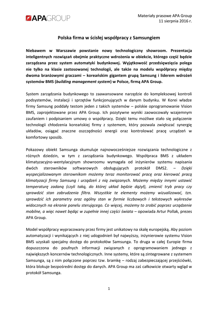 Materiały prasowe APA Group 11 sierpnia 2016 r. Polska firma w ścisłej współpracy z Samsungiem Niebawem w Warszawie powstanie nowy technologiczny showroom. Prezentacja inteligentnych rozwiązań obejmie praktyczne wdrożenia w obiekcie, którego część będzie zarządzana przez system automatyki budynkowej. Wyjątkowość przedsięwzięcia polega nie tylko na klasie zastosowanej technologii, ale także na modelu współpracy między dwoma branżowymi graczami – koreańskim gigantem grupą Samsung i liderem wdrożeń systemów BMS (building management system) w Polsce, firmą APA Group. System zarządzania budynkowego to zaawansowane narzędzie do kompleksowej kontroli podsystemów, instalacji i sprzętów funkcjonujących w danym budynku. W Korei władze firmy Samsung poddały testom jeden z takich systemów – polskie oprogramowanie Vision BMS, zaprojektowane przez APA Group. Ich pozytywne wyniki zaowocowały wzajemnym zaufaniem i podpisaniem umowy o współpracy. Dzięki temu możliwe stało się połączenie technologii chłodzenia koreańskiej firmy z systemem, który pozwala zwiększać synergię układów, osiągać znaczne oszczędności energii oraz kontrolować pracę urządzeń w komfortowy sposób. Pokazowy obiekt Samsunga skumuluje najnowocześniejsze rozwiązania technologiczne z różnych dziedzin, w tym z zarządzania budynkowego. Współpraca BMS z układem klimatyzacyjno-wentylacyjnym showroomu wymagała od inżynierów systemu napisania dwóch sterowników softwarowych obsługujących protokół DMS2. – Dzięki wyspecjalizowanym sterownikom możemy teraz monitorować pracę oraz kierować pracą klimatyzacji firmy Samsung i urządzeń z nią związanych. Możemy między innymi ustawić temperaturę zadaną (czyli taką, do której układ będzie dążył), zmienić tryb pracy czy sprawdzić stan zabrudzenia filtra. Wszystkie te elementy możemy wizualizować, tzn. sprawdzić ich parametry oraz ogólny stan w formie liczbowych i tekstowych wykresów widocznych na ekranie panelu sterującego. Co więcej, możemy to zrobić poprzez urządzenie mobilne, a więc nawet będąc w zupełnie innej części świata – opowiada Artur Pollak, prezes APA Group. Model współpracy wypracowany przez firmy jest unikatowy na skalę europejską. Aby poziom automatyzacji i wynikających z niej udogodnień był najwyższy, inżynierowie systemu Vision BMS uzyskali specjalny dostęp do protokołów Samsunga. To druga w całej Europie firma dopuszczona do poufnych informacji związanych z oprogramowaniem jednego z największych koncernów technologicznych. Inne systemy, które są zintegrowane z systemem Samsunga, są z nim połączone poprzez tzw. bramkę – rodzaj zabezpieczającej przejściówki, która blokuje bezpośredni dostęp do danych. APA Group ma zaś całkowicie otwarty wgląd w protokół Samsunga. 1 Materiały prasowe APA Group 11 sierpnia 2016 r. Aby mogło dojść do takiego rodzaju bliskiej współpracy, firmy musiały obdarzyć się dużym zaufaniem, która może przełożyć się na kolejne innowacje w świecie technologii. Obie grupy są liderami w swoich branżach. Połączenie doświadczeń i osiągnięć ich inżynierii otwiera przed inteligentnymi technologiami nowe możliwości rozwoju. Vision BMS jest systemem modułowym, co oznacza, że może być stopniowo rozbudowywany i etapami przejmować kontrolę nad nowymi podsystemami. Dalsze pogłębianie stosunków biznesowych bez przeszkód może więc przełożyć się na udoskonalanie technologii, jakimi dysponują firmy. *** Więcej informacji na: www.apagroup.info Kontakt dla mediów: Przemysław Kozera [email protected] mobile: +48 786 100 058 2