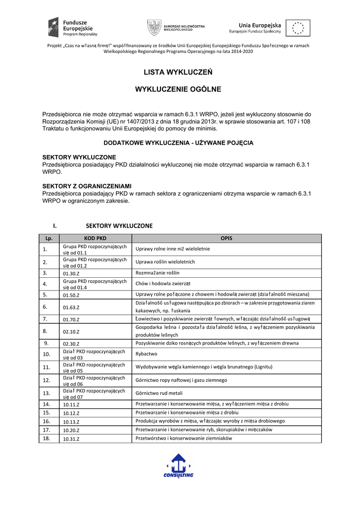 Projekt „Czas na własną firmę!” współfinansowany ze środków Unii Europejskiej Europejskiego Funduszu Społecznego w ramach Wielkopolskiego Regionalnego Programu Operacyjnego na lata 2014-2020 LISTA WYKLUCZEŃ WYKLUCZENIE OGÓLNE Przedsiębiorca nie może otrzymać wsparcia w ramach 6.3.1 WRPO, jeżeli jest wykluczony stosownie do Rozporządzenia Komisji (UE) nr 1407/2013 z dnia 18 grudnia 2013r. w sprawie stosowania art. 107 i 108 Traktatu o funkcjonowaniu Unii Europejskiej do pomocy de minimis. DODATKOWE WYKLUCZENIA - UŻYWANE POJĘCIA SEKTORY WYKLUCZONE Przedsiębiorca posiadający PKD działalności wykluczonej nie może otrzymać wsparcia w ramach 6.3.1 WRPO. SEKTORY Z OGRANICZENIAMI Przedsiębiorca posiadający PKD w ramach sektora z ograniczeniami otrzyma wsparcie w ramach 6.3.1 WRPO w ograniczonym zakresie. I. SEKTORY WYKLUCZONE Lp. KOD PKD 5. Grupa PKD rozpoczynających się od 01.1 Grupa PKD rozpoczynających się od 01.2 01.30.Z Grupa PKD rozpoczynających się od 01.4 01.50.Z 6. 01.63.Z 7. 01.70.Z 8. 02.10.Z 9. 02.30.Z Dział PKD rozpoczynających się od 03 Dział PKD rozpoczynających się od 05 Dział PKD rozpoczynających się od 06 Dział PKD rozpoczynających się od 07 10.11.Z 1. 2. 3. 4. 10. 11. 12. 13. 14. 15. 16. 17. 18. OPIS Uprawy rolne inne niż wieloletnie Uprawa roślin wieloletnich Rozmnażanie roślin Chów i hodowla zwierząt Uprawy rolne połączone z chowem i hodowlą zwierząt (działalność mieszana) Działalność usługowa następująca po zbiorach – w zakresie przygotowania ziaren kakaowych, np. łuskania Łowiectwo i pozyskiwanie zwierząt łownych, włączając działalność usługową Gospodarka leśna i pozostała działalność leśna, z wyłączeniem pozyskiwania produktów leśnych Pozyskiwanie dziko rosnących produktów leśnych, z wyłączeniem drewna Rybactwo Wydobywanie węgla kamiennego i węgla brunatnego (Lignitu) Górnictwo ropy naftowej i gazu ziemnego Górnictwo rud metali Przetwarzanie i konserwowanie mięsa, z wyłączeniem mięsa z drobiu 10.12.Z Przetwarzanie i konserwowanie mięsa z drobiu 10.13.Z Produkcja wyrobów z mięsa, włączając wyroby z mięsa drobiowego 10.20.Z Przetwarzanie i konserwowanie ryb, skorupiaków i mięczaków 10.31.Z Przetwórstwo i konserwowanie ziemniaków Projekt „Czas na własną firmę!” współfinansowany ze środków Unii Europejskiej Europejskiego Funduszu Społecznego w ramach Wielkopolskiego Regionalnego Programu Operacyjnego na lata 2014-2020 19. 20. 21. 22. 23. 24. 25. 10.32.Z Produkcja soków z owoców i warzyw 10.39.Z Pozostałe przetwarzanie i konserwowanie owoców i warzyw 10.41.Z Produkcja olejów i pozostało tłuszczów płynnych 10.42.Z Produkcja margaryny i podobnych tłuszczów jadalnych 10.51.Z Przetwórstwo mleka i wyrobów serów, z wyłączeniem produkcji masła 10.61.Z Wytwarzanie produktów przemiału zbóż 10.62.Z Wytwarzanie skrobi i produktów skrobiowych 26. 10.73.Z 27. 28. 10.81.Z Produkcja makaronów, klusek, kuskusu i podobnych wyrobów mącznych - tylko tych, które zawierają w masie ponad 20% ryb, skorupiaków, mięczaków lub innych bezkręgowców wodnych Produkcja cukru 10.84.Z Produkcja przypraw – w zakresie produkcji octu 29. 10.89.Z 30. 31. 32. 33. 34. 35. 10.91.Z Produkcja pozostałych artykułów spożywczych, gdzie indziej nieklasyfikowana dotyczy podmiotów zajmujących się działalnością – w zakresie produkcji wyrobów z jaj, miodu i karmelu Produkcja gotowej paszy dla zwierząt gospodarskich 10.92.Z Produkcja gotowej karmy dla zwierząt domowych 11.01.Z Destylowanie, rektyfikowanie i mieszanie alkoholi 11.02.Z Produkcja win gronowych 11.03.Z Produkcja cydru i pozostałych win owocowych 11.04.Z Produkcja pozostałych niedestylowanych napojów fermentowanych 36. 13.10.D 37. 20.14.Z 38. 46.21.Z 39. 40. 46.22.Z Produkcja przędzy z pozostałych włókien tekstylnych, włączając produkcję nici dotyczy podmiotów zajmujących się działalnością w zakresie wydobywania włókna ze słomy lnianej i konopnej Produkcja pozostałych podstawowych chemikaliów organicznych – w zakresie produkcji alkoholu etylowego Sprzedaż hurtowa zboża, nieprzetworzonego tytoniu, nasion i pasz dla zwierząt dotyczy podmiotów zajmujących się działalnością w zakresie sprzedaży hurtowej zboża, rzepaku lub wprowadzania do obrotu materiału siewnego roślin rolniczych i warzywnych Sprzedaż hurtowa kwiatów i roślin 46.31.Z Sprzedaż hurtowa owoców i warzyw 41. 46.33.Z 42. 52.10.B II. Sprzedaż hurtowa mleka, wyrobów mleczarskich, jaj, olejów i tłuszczów jadalnych - dotyczy podmiotów zajmujących się działalnością w zakresie sprzedaży hurtowej mleka i wyrobów mleczarskich Magazynowanie i przechowywanie pozostałych towarów - dotyczy podmiotów zajmujących się działalnością w zakresie usługowego zamrażania i przechowywania produktów rolnych SEKTORY Z OGRANICZENIAMI Lp. KOD PKD OPIS TRANSPORT - ZAKAZ FINANSOWANIA ZAKUPU ŚRODKA TRANSPORTU I URZĄDZEŃ TRANSPORTOWYCH 1. 49.41.Z 1. 49.41.Z Transport drogowy towarów TRANSPORT - PRÓG POMOCY DO 100 TYS. EURO (na cel inny niż zakup środka transportu i urządzeń transportowych) Transport drogowy towarów Projekt „Czas na własną firmę!” współfinansowany ze środków Unii Europejskiej Europejskiego Funduszu Społecznego w ramach Wielkopolskiego Regionalnego Programu Operacyjnego na lata 2014-2020