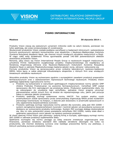 PISMO INFORMACYJNE Moskwa 30 stycznia 2014 r. Produkty Vision cieszą się zasłużonym uznaniem milionów osób na całym świecie, ponieważ nie tylko spełniają, ale wręcz przewyższają ich oczekiwania. Skuteczność produktów Vision została poddana weryfikacji w badaniach klinicznych i potwierdzona licznymi pozytywnymi opiniami konsumentów oraz ekspertów z Naukowo-Badawczego Instytutu Żywienia Rosyjskiej Akademii Nauk, jak również innych wiodących ośrodków medycznych w Rosji. W ciągu całej swej działalności Firma zgromadziła ponad 140 000 potwierdzonych efektów stosowania produktów Vision. Renoma, jaką cieszy się Vision International People Group w naukowych kręgach medycznych, umożliwia Firmie realizowanie wyjątkowego projektu międzynarodowego we współpracy ze Światową Organizacją Zdrowia oraz Naukowo-Badawczym Instytutem Żywienia Rosyjskiej Akademii Nauk w zakresie Międzykulturowego badania jakości życia, zdrowia i odżywiania się. Formuły produktów Vision są opracowywane przez unikalne laboratorium naukowo-badawcze DEM4, które łączy w sobie potencjał kilkudziesięciu ekspertów z różnych firm oraz wiodących światowych ośrodków naukowych. Wszystkie produkty Vision są wytwarzane zgodnie z europejskimi zasadami produkcji preparatów farmaceutycznych oraz z zastosowaniem najnowszych technologii naukowych. Produkty Vision spełniają najbardziej rygorystyczne normy: Produkty są wytwarzane w warunkach spełniających międzynarodowe normy jakości GMP (Dobra Praktyka Produkcyjna) na poziomie farmaceutycznym. Certyfikat GMP został opracowany dla firm zajmujących się produkcją leków. Producenci suplementów diety nie są zobowiązani do uzyskania tego certyfikatu, jednakże Vision pragnie utrzymać pierwszeństwo wśród innych firm na drodze do najważniejszego celu, jakim jest pozycja lidera w zakresie jakości produktów. Produkty spełniają wymogi systemowe normy HACCP. Ten system analizy ryzyk przemysłowych został opracowany przez amerykańską organizację NASA przed wysłaniem pierwszego kosmonauty na Księżyc, a obecnie jest stosowany w przemyśle spożywczych w celu zapewnienia bezpieczeństwa żywności. Produkty spełniają wymogi najwyższej normy jakości dla żywności, jaką jest ISO 22000 – system zarządzania bezpieczeństwem żywności i kontroli jakości od pozyskania surowca od dostawcy po wytworzenie produktu końcowego. System ISO wymaga stałego doskonalenia się. Aby co roku potwierdzić prawo posiadania certyfikatu ISO 22000, należy stale dbać o spełnianie najwyższych norm jakości na każdym poziomie produkcji. W chwili obecnej Firma Vision jest pierwszą i jedyną firmą w Europie, spełniającą wymogi normy ISO 22000 w zakresie produkcji suplementów diety. Spełnianie wymogów tej normy pociąga za sobą znaczne inwestycje organizacyjne oraz finansowe, ponieważ światowy standard ISO nakłada określone obowiązki nie tylko na producenta, ale również dostawcę surowca oraz każdego pracownika farmy czy plantacji, z których pochodzą surowce produktów Vision. Aby sprostać gwarancji jakości produktów, Vision stosuje zasady pełnej certyfikacji. Pełna certyfikacja zapewnia jakość produkcji na każdym etapie: poczynając od koncepcji, pozyskania surowca i materiałów oraz kontrolę produkcji aż po sprzedaż produktów. Praca według takich zasad oznacza, że zanim produkt trafi do rąk konsumenta jest poddawany około 20 000 różnych badań i analiz przy jednoczesnej surowej kontroli każdego procesu. Przykładowo, przed pozyskaniem odpowiedniego surowca, który miał stanowić podstawę preparatów Vision, firma przeprowadziła dokładny monitoring ekologicznie czystych i bezpiecznych regionów. W wyniku tej analizy wybrano 75 regionów, z których obecnie są dostarczane surowce na potrzeby całej produkcji Vision. Przy doborze surowca oceniana jest ilość zawartych w nim substancji aktywnych. Składniki roślinne preparatów są zbierane w określonych porach roku, kiedy zawartość substancji aktywnych jest najwyższa. Przy czym wszystkie farmy dostarczające surowiec posiadają certyfikat GACP (Dobra Praktyka Uprawy i Zbioru), którego zasady zostały opracowane przez Światową Organizację Zdrowia. Pełna certyfikacja jest stosowana wobec następujących etapów produkcji: Ustalenie optymalnych proporcji składników; Testy kliniczne w zakresie badania wzajemnego oddziaływania podstawowych składników produktu; Sprawdzenie bezpieczeństwa surowca przed jego początkową obróbką, wybór najskuteczniejszej technologii przetwarzania surowca; Walidacja (niezależna ocena ekspercka dotycząca zgodności) procesów produkcyjnych i stosowanego sprzętu; Monitoring warunków przechowywania i logistyki; Realizacja procesu sprzedaży zgodnie z ustanowionymi zasadami i wymogami. Z uwagi na powyższe, proces produkcji preparatów Vision wymaga dużego profesjonalizmu i twórczego podejścia. Każdy etap tego procesu jest potwierdzony wieloma badaniami oraz konsultacjami ekspertów i profesjonalistów. Dla każdego składnika dobierany jest surowiec najwyższej jakości, który pozwala uzyskać maksymalne efekty. Produkcja preparatów Vision nie tylko odpowiada najwyższym standardom, ale je wręcz przewyższa. Vision świadomie i celowo zobowiązuje się do podążania długą i kosztowną drogą zgodności z najwyższymi standardami, ponieważ celem Firmy jest oferowanie klientom produktów najlepszej jakości. Jest to nasza bezsporna przewaga konkurencyjna. Oferta Firmy Vision w zakresie poprawy jakości życia jest aktualna, pożądana i unikatowa. Z każdym dniem rośnie liczba osób pragnących i zdecydowanych zarządzać swoim zdrowiem oraz inwestować pieniądze w lepszą przyszłość. Statystyki zapytań w wyszukiwarkach internetowych mówią same za siebie: ponad 100 milionów zapytań dziennie związanych ze słowami „młodość’, „uroda”, „natura”, „miłość
