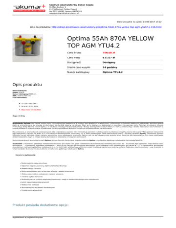 Centrum Akumulatorów Daniel Czajka Ul. Małe Garbary 1 61-756 Poznań, Polska; Poland Nip 7772301082, Regon 634536920 www.prostowniki-akumulatory.pl Dane aktualne na dzień: 03-03-2017 17:02 Link do produktu: http://sklep.prostowniki-akumulatory.pl/optima-55ah-870a-yellow-top-agm-ytu42-p-156.html Optima 55Ah 870A YELLOW TOP AGM YTU4.2 Cena brutto 759,00 zł Cena netto 617,07 zł Dostępność Dostępny Średni czas wysyłki 24 godziny Numer katalogowy Optima YTU4.2 Opis produktu Dane techniczne: Model: D34/78 Numer katalogowy: 8014-045 NSN: 6140 01 457 4341 Prąd rozruchowy: CCA (BCI 0°F) : 765 A MCA (BCI 32°F): 870 A Nasz test: 1016A / CCA Waga: 19.9 Kg Akumulatory Optima mają ciaśniej ułożone płytki, co zmniejsza opór wewnętrzny. A mniejszy opór wewnętrzny to więcej mocy, zmieszczonej na mniejszej powierzchni. Dodatkowo, wszystkie spiralne płytki są unieruchomione, co oznacza, że akumulator jest bardziej odporny na wibracje. Czyni go to idealnym do zastosowań w warunkach intensywnego ruchu. Poza tym zmniejszone wibracje minimalizują utratę aktywnej powłoki płytek, a w rezultacie oznaczają mniejsze straty energii i dłuższy okres żywotności akumulatora. I w końcu, niektóre stopy i dodatki stosowane w akumulatorach są bardziej podatne na przemieszczanie się elektronów, co skutkuje spadkiem wydajności i szybszym rozładowywaniem się akumulatora. Dla porównania, w akumulatorach zastosowany jest ołów o największej czystości, który minimalizuje samoistne rozładowywanie się. Zastosowanie płyty przeciw-wibracyjnej V-Tech podnosi maksymalnie jego efektywność i sprawia, że działa on 2-3 raz dłużej niż konwencjonalne akumulatory. Są w 100% bezobsługowe Dzięki odwracalności reakcji i szczelnej obudowie Optimy uzupełnianie poziomu elektrolitu nie jest potrzebne. Dzięki niskiemu wskaźnikowi samo rozładowania akumulator Optima, jeśli nie jest używany może pozostać przez ponad rok bez ładowania i po tym czasie nadal będzie działać niezawodnie. Czyni to z niego idealny akumulator do stosowania w maszynach sezonowych. Oprócz standardowych akumulatorów serii Optima, Johnson Controls oferuje także linię akumulatorów Optima z możliwością głębokiego rozładowania i technologią SpiralCell. Akumulator z możliwością głębokiego rozładowania stosowany jest zwykle tam, gdzie rozładowanie akumulatora przy normalnej pracy sięga 60 - 70 procent jego pojemności. Stąd właśnie nazwa akumulatora - " z możliwością głębokiego rozładowania ". Różni się on znacząco od normalnego akumulatora samochodowego, który rozładowywany jest zwykle w 1 - 3 %.Zastosowania, wymagające akumulatora z możliwością głębokiego rozładowania to m. in. silniki łodzi, wózki golfowe, elektryczne wózki inwalidzkie oraz domowe systemy zasilania. Radiowozy, karetki pogotowia i wozy strażackie to kolejni kandydaci do stosowania akumulatorów z możliwością głębokiego rozładowania Optima. Korzyści z użytkowania: Bardzo wysokie prądy rozruchowe. Odporność na pracę cykliczną. (Optima YellowTop i BlueTop ) Niewielka waga i wymiary. Bardzo wysoka odporność na wstrząsy, wibracje i wysoką temperaturę. Większa odporność na podwyższone napięcie ładowania. 3-krotnie szybsze ładowanie. Możliwość pracy w systemie eksploatacji sezonowej z uwagi na bardzo niskie tempo samo rozładowania. Jakość zapewniająca stałą sprawność Większa moc użytkowa Akumulatory bez-wyciekowe i bezobsługowe Ponadprzeciętna żywotność Produkt posiada dodatkowe opcje: wygenerowano w programie shopGold Centrum Akumulatorów Daniel Czajka Ul. Małe Garbary 1 61-756 Poznań, Polska; Poland Nip 7772301082, Regon 634536920 www.prostowniki-akumulatory.pl Napięcie [V]: 12V Pojemność [Ah]: 55Ah Prąd rozruchowy [A]: 765A Długość [mm]: 254mm Szerokość [mm]: 175mm Wysokość [mm]: 197mm Polaryzacja: Lewy plus - 1 Końcówki biegunowe: 1 - Normalne , Przód - wkręcane Technologia: AGM Dodatkowe informacje: Całkowicie bezobsługowy , Praca cykliczna Gwarancja: 24 miesiące wygenerowano w programie shopGold Powered by TCPDF (www.tcpdf.org)