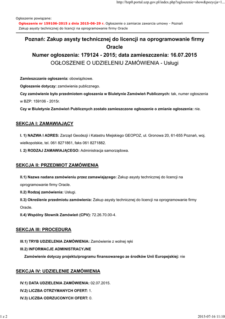 http://bzp0.portal.uzp.gov.pl/index.php?ogloszenie=show&pozycja=1... Ogłoszenie powiązane: Ogłoszenie nr 159106-2015 z dnia 2015-06-29 r. Ogłoszenie o zamiarze zawarcia umowy - Poznań Zakup asysty technicznej do licencji na oprogramowanie firmy Oracle Poznań: Zakup asysty technicznej do licencji na oprogramowanie firmy Oracle Numer ogłoszenia: 179124 - 2015; data zamieszczenia: 16.07.2015 OGŁOSZENIE O UDZIELENIU ZAMÓWIENIA - Usługi Zamieszczanie ogłoszenia: obowiązkowe. Ogłoszenie dotyczy: zamówienia publicznego. Czy zamówienie było przedmiotem ogłoszenia w Biuletynie Zamówień Publicznych: tak, numer ogłoszenia w BZP: 159106 - 2015r. Czy w Biuletynie Zamówień Publicznych zostało zamieszczone ogłoszenie o zmianie ogłoszenia: nie. SEKCJA I: ZAMAWIAJĄCY I. 1) NAZWA I ADRES: Zarząd Geodezji i Katastru Miejskiego GEOPOZ, ul. Gronowa 20, 61-655 Poznań, woj. wielkopolskie, tel. 061 8271861, faks 061 8271882. I. 2) RODZAJ ZAMAWIAJĄCEGO: Administracja samorządowa. SEKCJA II: PRZEDMIOT ZAMÓWIENIA II.1) Nazwa nadana zamówieniu przez zamawiającego: Zakup asysty technicznej do licencji na oprogramowanie firmy Oracle. II.2) Rodzaj zamówienia: Usługi. II.3) Określenie przedmiotu zamówienia: Zakup asysty technicznej do licencji na oprogramowanie firmy Oracle. II.4) Wspólny Słownik Zamówień (CPV): 72.26.70.00-4. SEKCJA III: PROCEDURA III.1) TRYB UDZIELENIA ZAMÓWIENIA: Zamówienie z wolnej ręki III.2) INFORMACJE ADMINISTRACYJNE Zamówienie dotyczy projektu/programu finansowanego ze środków Unii Europejskiej: nie SEKCJA IV: UDZIELENIE ZAMÓWIENIA IV.1) DATA UDZIELENIA ZAMÓWIENIA: 02.07.2015. IV.2) LICZBA OTRZYMANYCH OFERT: 1. IV.3) LICZBA ODRZUCONYCH OFERT: 0. 1z2 2015-07-16 11:10 http://bzp0.portal.uzp.gov.pl/index.php?ogloszenie=show&pozycja=1... IV.4) NAZWA I ADRES WYKONAWCY, KTÓREMU UDZIELONO ZAMÓWIENIA: Oracle Polska Sp. z o.o., ul. Przyokopowa 31, 01-208 Warszawa, kraj/woj. mazowieckie. IV.5) Szacunkowa wartość zamówienia (bez VAT): 225857,38 PLN. IV.6) INFORMACJA O CENIE WYBRANEJ OFERTY ORAZ O OFERTACH Z NAJNIŻSZĄ I NAJWYŻSZĄ CENĄ Cena wybranej oferty: 277804,58 Oferta z najniższą ceną: 277804,58 / Oferta z najwyższą ceną: 277804,58 Waluta: PLN. ZAŁĄCZNIK I Uzasadnienie udzielenia zamówienia w trybie negocjacji bez ogłoszenia, zamówienia z wolnej ręki albo zapytania o cenę 1. Podstawa prawna Postępowanie prowadzone jest w trybie zamówienie z wolnej ręki na podstawie art. 67 ust. 1 pkt 1 lit. b ustawy z dnia 29 stycznia 2004r. - Prawo zamówień publicznych. 2. Uzasadnienia wyboru trybu Należy podać uzasadnienie faktyczne i prawne wyboru trybu oraz wyjaśnić, dlaczego udzielenie zamówienia jest zgodne z przepisami. W niniejszym postępowaniu zachodzą okoliczności z art. 67 ust. 1 pkt 1 lit. b) ustawy Pzp, gdyż usługi mogą być świadczone tylko przez jednego wykonawcę z przyczyn związanych z ochroną praw wyłącznych, wynikających z odrębnych przepisów. Firma ORACLE Polska Sp. z o.o. jest jedynym podmiotem, który jest upoważniony do świadczenia usług asysty technicznej (Software updates license and suport) do oprogramowania ORACLE. Firma Oracle Polska sp. z o.o. zgodnie z oświadczeniem właściciela majątkowych praw autorskich jest podmiotem zależnym, którego 100% udziałowcem jest Oracle Nederland B.V. Zachodzą zatem przesłanki do udzielenia zamówienia z wolnej ręki. Zamawiający zweryfikował przed wszczęciem postępowania okoliczności faktyczne i prawne zamówienia pod względem wytycznych Urzędu Zamówień Publicznych przedstawionych w Rekomendacjach prezesa UZP w zakresie udzielenia zamówień publicznych na systemy informatyczne oraz dostawę zestawów komputerowych (UZP Rekomendacje Prezesa UZP Udzielanie zamówień publicznych na systemy informatyczne oraz dostawę zestawów komputerowych, Wydawnictwo Polska Agencja Rozwoju Przedsiębiorczości, W-wa 2011). 2z2 2015-07-16 11:10