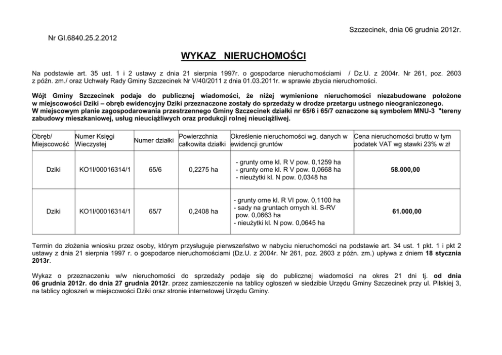Szczecinek, dnia 06 grudnia 2012r. Nr GI.6840.25.2.2012 WYKAZ NIERUCHOMOŚCI Na podstawie art. 35 ust. 1 i 2 ustawy z dnia 21 sierpnia 1997r. o gospodarce nieruchomościami / Dz.U. z 2004r. Nr 261, poz. 2603 z późn. zm./ oraz Uchwały Rady Gminy Szczecinek Nr V/40/2011 z dnia 01.03.2011r. w sprawie zbycia nieruchomości. Wójt Gminy Szczecinek podaje do publicznej wiadomości, że niżej wymienione nieruchomości niezabudowane położone w miejscowości Dziki – obręb ewidencyjny Dziki przeznaczone zostały do sprzedaży w drodze przetargu ustnego nieograniczonego. W miejscowym planie zagospodarowania przestrzennego Gminy Szczecinek działki nr 65/6 i 65/7 oznaczone są symbolem MNU-3 "tereny zabudowy mieszkaniowej, usług nieuciążliwych oraz produkcji rolnej nieuciążliwej. Obręb/ Numer Księgi Miejscowość Wieczystej Dziki Dziki KO1I/00016314/1 KO1I/00016314/1 Numer działki 65/6 65/7 Powierzchnia Określenie nieruchomości wg. danych w Cena nieruchomości brutto w tym całkowita działki ewidencji gruntów podatek VAT wg stawki 23% w zł 0,2275 ha - grunty orne kl. R V pow. 0,1259 ha - grunty orne kl. R V pow. 0,0668 ha - nieużytki kl. N pow. 0,0348 ha 58.000,00 0,2408 ha - grunty orne kl. R VI pow. 0,1100 ha - sady na gruntach ornych kl. S-RV pow. 0,0663 ha - nieużytki kl. N pow. 0,0645 ha 61.000,00 Termin do złożenia wniosku przez osoby, którym przysługuje pierwszeństwo w nabyciu nieruchomości na podstawie art. 34 ust. 1 pkt. 1 i pkt 2 ustawy z dnia 21 sierpnia 1997 r. o gospodarce nieruchomościami (Dz.U. z 2004r. Nr 261, poz. 2603 z późn. zm.) upływa z dniem 18 stycznia 2013r. Wykaz o przeznaczeniu w/w nieruchomości do sprzedaży podaje się do publicznej wiadomości na okres 21 dni tj. od dnia 06 grudnia 2012r. do dnia 27 grudnia 2012r. przez zamieszczenie na tablicy ogłoszeń w siedzibie Urzędu Gminy Szczecinek przy ul. Pilskiej 3, na tablicy ogłoszeń w miejscowości Dziki oraz stronie internetowej Urzędu Gminy.