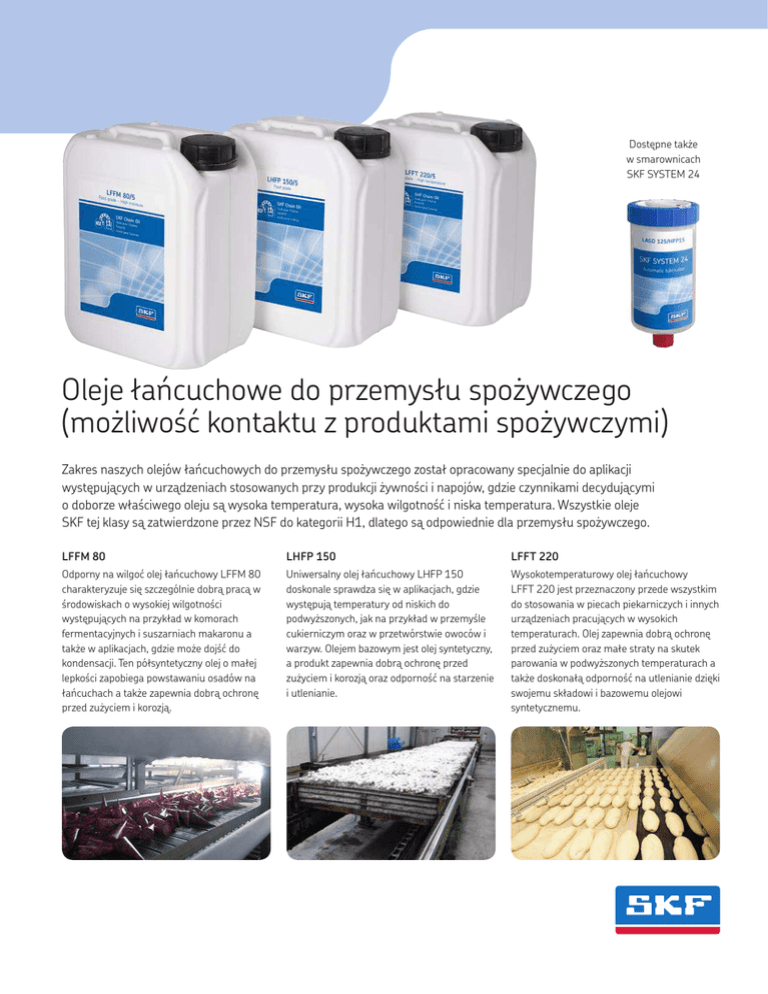Dostępne także w smarownicach SKF SYSTEM 24 Oleje łańcuchowe do przemysłu spożywczego (możliwość kontaktu z produktami spożywczymi) Zakres naszych olejów łańcuchowych do przemysłu spożywczego został opracowany specjalnie do aplikacji występujących w urządzeniach stosowanych przy produkcji żywności i napojów, gdzie czynnikami decydującymi o doborze właściwego oleju są wysoka temperatura, wysoka wilgotność i niska temperatura. Wszystkie oleje SKF tej klasy są zatwierdzone przez NSF do kategorii H1, dlatego są odpowiednie dla przemysłu spożywczego. LFFM 80 LHFP 150 LFFT 220 Odporny na wilgoć olej łańcuchowy LFFM 80 charakteryzuje się szczególnie dobrą pracą w środowiskach o wysokiej wilgotności występujących na przykład w komorach fermentacyjnych i suszarniach makaronu a także w aplikacjach, gdzie może dojść do kondensacji. Ten półsyntetyczny olej o małej lepkości zapobiega powstawaniu osadów na łańcuchach a także zapewnia dobrą ochronę przed zużyciem i korozją. Uniwersalny olej łańcuchowy LHFP 150 doskonale sprawdza się w aplikacjach, gdzie występują temperatury od niskich do podwyższonych, jak na przykład w przemyśle cukierniczym oraz w przetwórstwie owoców i warzyw. Olejem bazowym jest olej syntetyczny, a produkt zapewnia dobrą ochronę przed zużyciem i korozją oraz odporność na starzenie i utlenianie. Wysokotemperaturowy olej łańcuchowy LFFT 220 jest przeznaczony przede wszystkim do stosowania w piecach piekarniczych i innych urządzeniach pracujących w wysokich temperaturach. Olej zapewnia dobrą ochronę przed zużyciem oraz małe straty na skutek parowania w podwyższonych temperaturach a także doskonałą odporność na utlenianie dzięki swojemu składowi i bazowemu olejowi syntetycznemu. Dane techniczne Oznaczenie LFFM 80 LHFP 150 LFFT 220 Opis Olej dopuszczony do stosowania w przemyśle spożywczym (NSF H1) Olej dopuszczony do stosowania w przemyśle spożywczym (NSF H1) Olej dopuszczony do stosowania w przemyśle spożywczym (NSF H1) Ciężar właściwy 0.89 0.85 0.95 Kolor Biały Bezbarwny Żółty Typ oleju bazowego Półsyntetyczny (mineralny/estrowy) Syntetyczny estrowy Syntetyczny estrowy Zakres temperatury pracy –30 do +120 °C (–22 do +248 °F) –30 do +120 °C (–22 do +248 °F) 0 do 250 °C (32 do +482 °F) Lepkość oleju bazowego: 40 °C (104 °F), mm²/s 100 °C (212 °F), mm²/s około 80 około 10 ISO VG 150 około 19 ISO VG 220 około 17 Temperatura zapłonu >200 °C (>392 °F) >200 °C (>392 °F) >250 °C (>482 °F) Zatwierdzenie NSF H1 (No: 146767) H1 (No: 136858) H1 (No: 146768) Sposób zamawiania Wielkość opakowania LFFM 80 LHFP 150 LFFT 220 Kanister 5 litrów LFFM80/5 LHFP150/5 LFFT220/5 SKF SYSTEM 24 / LAGD 125 ml LAGD 125/FFM80* LAGD 125/HFP15* LAGD 125/FFT22* * Zawiera zawór zwrotny Korzyści Typowe zastosowania Zastosowanie właściwego oleju w Twojej aplikacji może dać wiele korzyści dla całego procesu: Typowe zastosowania w przemyśle spożywczym obejmują: • Wszystkie oleje łańcuchowe SKF charakteryzują się wysoką odpornością na utlenianie i starzenie, co prowadzi do wydłużenia trwałości eksploatacyjnej łańcucha. • Okresy pracy oleju do wymiany są dłuższe a zużycie oleju jest mniejsze, co z kolei powoduje redukcję zużycia energii, polepszenie wydajności procesu, wydłużenie trwałości łańcucha i zmniejszenie kosztów utrzymania ruchu. • Bezwonne i bez smaku oleje łańcuchowe do przemysłu spożywczego spełniają wymagania dotyczące kontaktu z żywnością i zapewniają wysoki poziom bezpieczeństwa i łatwość obsługi. • Łańcuchy przenośników • Łańcuchy napędowe • Łańcuchy dźwigów W przypadku łańcuchów o małej prędkości zazwyczaj stosowane jest smarowanie z użyciem szczotek, natomiast do smarowania łańcuchów o średniej prędkości wymagane jest smarowanie metodą kropelkową. Łańcuchy o dużej prędkości muszą być smarowane natryskowo (poprzez system smarowania), aby zapewnić smarowanie ciągłe. Oleje łańcuchowe SKF są dostępne w kanistrach pięciolitrowych oraz jako wypełnienie jednopunktowych smarownic automatycznych SKF SYSTEM 24. ® SKF jest zarejestrowanym znakiem handlowym Grupy SKF. © Grupa SKF 2014 Zawartość niniejszej publikacji jest chroniona prawem autorskim i nie może być powielana (również we fragmentach) bez uprzedniego uzyskania pisemnego pozwolenia. Wydawca podjął wszelkie starania, aby informacje zawarte w publikacji były dokładne i prawdziwe, jednak nie ponosi żadnej odpowiedzialności za jakiekolwiek straty lub szkody, zarówno bezpośrednie, pośrednie, jak i wtórne, powstałe w wyniku korzystania z informacji zawartych w niniejszej publikacji. PUB MP/P8 13212 PL · Styczeń 2014 www.mapro.skf.com · skf.com/mount · skf.com/lubrication