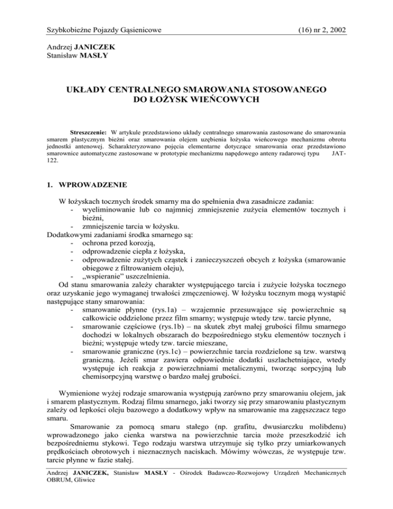 Szybkobieżne Pojazdy Gąsienicowe (16) nr 2, 2002 Andrzej JANICZEK Stanisław MASŁY UKŁADY CENTRALNEGO SMAROWANIA STOSOWANEGO DO ŁOŻYSK WIEŃCOWYCH Streszczenie: W artykule przedstawiono układy centralnego smarowania zastosowane do smarowania smarem plastycznym bieżni oraz smarowania olejem uzębienia łożyska wieńcowego mechanizmu obrotu jednostki antenowej. Scharakteryzowano pojęcia elementarne dotyczące smarowania oraz przedstawiono smarownice automatyczne zastosowane w prototypie mechanizmu napędowego anteny radarowej typu JAT122. 1. WPROWADZENIE W łożyskach tocznych środek smarny ma do spełnienia dwa zasadnicze zadania: - wyeliminowanie lub co najmniej zmniejszenie zużycia elementów tocznych i bieżni, - zmniejszenie tarcia w łożysku. Dodatkowymi zadaniami środka smarnego są: - ochrona przed korozją, - odprowadzenie ciepła z łożyska, - odprowadzenie zużytych cząstek i zanieczyszczeń obcych z łożyska (smarowanie obiegowe z filtrowaniem oleju), - „wspieranie” uszczelnienia. Od stanu smarowania zależy charakter występującego tarcia i zużycie łożyska tocznego oraz uzyskanie jego wymaganej trwałości zmęczeniowej. W łożysku tocznym mogą wystąpić następujące stany smarowania: - smarowanie płynne (rys.1a) – wzajemnie przesuwające się powierzchnie są całkowicie oddzielone przez film smarny; występuje wtedy tzw. tarcie płynne, - smarowanie częściowe (rys.1b) – na skutek zbyt małej grubości filmu smarnego dochodzi w lokalnych obszarach do bezpośredniego styku elementów tocznych i bieżni; występuje wtedy tzw. tarcie mieszane, - smarowanie graniczne (rys.1c) – powierzchnie tarcia rozdzielone są tzw. warstwą graniczną. Jeżeli smar zawiera odpowiednie dodatki uszlachetniające, wtedy występuje ich reakcja z powierzchniami metalicznymi, tworząc sorpcyjną lub chemisorpcyjną warstwę o bardzo małej grubości. Wymienione wyżej rodzaje smarowania występują zarówno przy smarowaniu olejem, jak i smarem plastycznym. Rodzaj filmu smarnego, jaki tworzy się przy smarowaniu plastycznym zależy od lepkości oleju bazowego a dodatkowy wpływ na smarowanie ma zagęszczacz tego smaru. Smarowanie za pomocą smaru stałego (np. grafitu, dwusiarczku molibdenu) wprowadzonego jako cienka warstwa na powierzchnie tarcia może przeszkodzić ich bezpośredniemu stykowi. Tego rodzaju warstwa utrzymuje się tylko przy umiarkowanych prędkościach obrotowych i nieznacznych naciskach. Mówimy wówczas, że występuje tzw. tarcie płynne w fazie stałej. Andrzej JANICZEK, Stanisław MASŁY - Ośrodek Badawczo-Rozwojowy Urządzeń Mechanicznych OBRUM, Gliwice Andrzej JANICZEK, Stanisław MASŁY a. b. Rys.1. Rodzaje smarowania [4]: a. smarowanie płynne, b. smarowanie częściowe, c. smarowanie graniczne. c. Przy konstruowaniu maszyn czy urządzeń należy między innymi ustalić sposób smarowania węzłów łożyskowych. Dokonując wyboru sposobu smarowania należy wziąć pod uwagę następujące uwarunkowania: - konieczność zapewnienia wymaganej żywotności, - warunki eksploatacji, - wymagania ze względu na zachowanie stabilności ruchu, zminimalizowania hałasu, tarcia i temperatury łożysk, - wymagania ze względu na bezpieczeństwo eksploatacji, - koszty związane z instalacją systemu smarowania oraz jego utrzymania podczas eksploatacji. Przy doborze środka smarowego należy wziąć pod uwagę warunki eksploatacji tzn. obciążenie, prędkość obrotową i temperaturę pracy łożyska, jak również wymagania klimatyczno – środowiskowe. Dalszymi kryteriami mogą być wymagania stawiane ze względu na stabilność ruchu oraz ze względu na wymianę czy uzupełnianie smaru. Urządzenia do smarowania ze względu na sposób smarowania możemy podzielić na: - urządzenia do smarowania centralnego, - urządzenia do olejowego smarowania, - urządzenia do smarowania mgłą olejową, - urządzenia do smarowania olejowo – powietrznego. 2. ZAGADNIENIE SMAROWANIA WIELKOGABARYTOWYCH ŁOŻYSK TOCZNYCH Za wielkogabarytowe łożyska toczne uważa się takie łożyska, których średnica wewnętrzna jest większa od 300 mm. Ze względu na wymiary i konstrukcję pierścieni możemy je podzielić na dwie grupy: - łożyska typowe o dużych średnicach, - łożyska wieńcowe. Podział i konstrukcja pierwszych jest na ogół taka jak łożysk powszechnie stosowanych w budowie maszyn. Zasadniczą cechą łożysk wieńcowych poza dużymi wymiarami średnic i kształtem pierścieni jest występowanie uzębienia na pierścieniu zewnętrznym lub na pierścieniu wewnętrznym (co uzależnione jest od usytuowania zębnika napędowego). Łożyska wieńcowe znalazły zastosowanie w mechanizmach obrotu koparek, żurawi oraz urządzeń o przeznaczeniu specjalnym – wyrobach wojskowych. Obciążenie Układy centralnego smarowania stosowane do łożysk wieńcowych. łożysk wieńcowych cechuje się nierównomiernością, dlatego warstewka smaru znajdująca się między elementami tocznymi a bieżniami – poza wymienionymi w punkcie 1 głównymi cechami użytkowymi – jest istotnym czynnikiem amortyzującym uderzenia i tłumiącym drgania. Należy tu stwierdzić, że środek smarny spełnia swoje zadania w łożysku tylko wtedy, gdy w obszarze styku tarciowego znajduje się jego dostateczna ilość. Ze względu na małą prędkość obrotową łożysk wielkogabarytowych przestrzeń między pierścieniem ruchomym i stałym łożyska powinna być wypełniona całkowicie smarem a rodzaj środka smarowego oraz częstotliwość dosmarowywania łożyska winna być przedmiotem szczegółowej analizy [1]. Rozwojowi techniki towarzyszy charakterystyczna cecha – rosnąca prędkość obrotowa maszyn i urządzeń [3]. Tendencja ta zmusza do doskonalenia i rozwijania systemów smarowania. Na przestrzeni dziesięcioleci od najprostszych rozwiązań konstrukcyjnych doszliśmy do układów automatycznego centralnego smarowania obsługującego jednocześnie wiele punktów