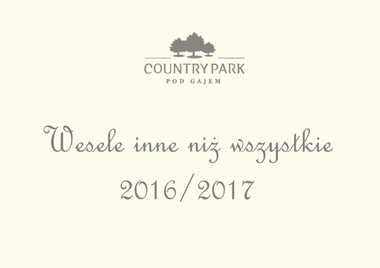 . niz Wesele inne wszystkie 2016/2017 W sród zieleni, w przepięknym otoczeniu staropolskiej posiadłości, z dala od zgiełku miasta, otwieramy bramy Country Parku „Pod Gajem” dla Państwa Młodych oraz ich Gości. Country Park „Pod Gajem” to malownicza posiadłość, położona na pograniczu Gaju Wielkiego i Ceradza Kościelnego, zaledwie 20 minut drogi na zachód od Poznania. Stylowe budynki w otoczeniu zieleni, stawów oraz wzgórza widokowego stwarzają niepowtarzalne warunki dla przyjęć weselnych i innych uroczystości okolicznościowych. Restauracja Gospoda „Pod Gajem” z przyjemnością zorganizuje wesela dla grup od 10 do 300 osób. Hotel oferuje 80 miejsc noclegowych oraz apartament dla Państwa Młodych w prezencie. Z przyjemnością przygotujemy wyborne menu zgodnie z Państwa oczekiwaniami. Zawsze zapewniamy kompleksową obsługę, a wszystko to w pięknej, naturalnej scenerii, doskonale nadającej się na romantyczną sesję zdjęciową. , …Inne niz. wszystkie • Tradycyjne powitanie Młodej Pary chlebem i solą • Toast lampką wina musującego dla Gości Weselnych w cenie menu • Wykwintne menu weselne – kompozycja dan serwowanych i bufetowych, w różnych wariantach cenowych • Napoje – kawa, herbata, woda mineralna gazowana i niegazowana, soki, napoje gazowane – bez ograniczeń • Możliwość dostarczania własnego alkoholu bez opłaty korkowej • Miejsce parkingowe dla wszystkich Gości • Apartament na noc poślubną dla Młodej Pary w prezencie • Preferencje stawki na pokoje dla Gości weselnych • Późne śniadanie dla Gości nocujących • Poprawiny w stylu Country …Twój wyjatkowy dzien ‚ . ‚ Zapraszamy do skorzystania z kompleksowej oferty weselnej. Udzielimy wielu cennych wskazówek, pomożemy zaplanować i zorganizować scenariusz przyjęcia weselnego. Nie będziecie się Państwo musieli martwić o swoją uroczystość, gdyż nasz koordynator będzie czuwał nad przebiegiem wesela. Pomożemy w odpowiednim dobraniu osób odpowiadających za przygotowania i realizację ceremonii. Polecamy naszych partnerów • • • • • • • • • • • • • • konferansjer oprawa muzyczna: zespół lub DJ fotograf kamerzysta salon fryzjersko-kosmetyczny salon sukien ślubnych salon mody męskiej usługi florystyczne i dekoracyjne upominki dla gości pracownia cukiernicza animator dla dzieci atrakcje dla weselników pracownica cukiernicza Cappuccina Urząd Stanu Cywilnego Tarnowo Podgórne . …Zadbamy o kazdy szczegól~ Atrakcje podczas uroczystości: • • • • • • • • • Fotobudka Karykaturzysta Candy bar Pokaz tańca towarzyskiego Świecące balony z helem Projekcje multimedialne Obsługa barmańska z pokazem Fontanna czekolady Organizacja czasu wolnego: Piłka nożna, tenis, siatkówka plażowa, koszykówka, jaccuzzi, sauny fińskie, ruska bania. …Wszystko o czym marzysz Menu PROPOZYCJA MENU 1 Zupa do wyboru przez Gości Domowy rosół z kury z makaronem Chłodnik z młodej botwiny z ogórkiem i aromatycznym koprem Danie Główne (2,5 porcji/os.) Staropolskie zrazy wołowe Klasyczny kotlet de volaille Rolada wieprzowa faszerowana szpinakiem Grillowany stek z łososia w świeżych ziołach Dodatki (3 porcje/os.) Młode ziemniaczki z masełkiem i koperkiem Poznańskie pyzy Kluseczki półfrancuskie Wybór warzyw sezonowych gotowanych na parze (kalafior, brokuł, marchew, szparagi, groszek zielony, fasolka szparagowa) Buraczki na ciepło lub zimno Surówka z młodej marchewki Deser Lody z owocami i bitą śmietaną̨ Ciasta (2 porcje/os.) Kruszon, jabłecznik, sernik Zimny Bufet (3 porcje/os.) Schab pieczony z suszoną morelą Roladka drobiowa z musem pieczarkowym Śledź na trzy sposoby (w śmietanie, oliwie lub po grecku) Wybór polskich ryb wędzonych Tradycyjne nóżki na zimno Sałatka z serem feta Wybór sałat i świeżych warzyw Dania serwowane po północy / bufet (1,5 porcji/os.) Barszcz z pasztecikiem Pikantne flaczki wieprzowe Wybór świeżego pieczywa Masła z ziołami i czosnkiem Napoje Woda mineralna niegazowana Napoje gazowane Soki owocowe Herbata Kawa Cena: 195,00 PLN brutto/osobę PROPOZYCJA MENU 2 Zupa do wyboru przez Gości Domowy rosół z kury z makaronem Chłodnik z młodej botwiny z ogórkiem i aromatycznym koprem Danie Główne (2,5 porcji/os.) Pieczone żeberka w sosie miodowo- śliwkowym Polędwiczki wieprzowe w sosie kurkowym Zrazy wołowe z boczkiem i ogórkiem Tradycyjny kotlet de volaille Dodatki (3 porcje/os.) Poznańskie pyzy Ryż z warzywami Kluseczki półfrancuskie Ziemniaki z masełkiem i pietruszką Kapusta włoska zasmażana z boczkiem i cebulką Mix warzyw gotowanych na parze Deser Trio czekoladowe z sosem waniliowym Ciasto (2 porcje/os.) Kruszon, jabłecznik, sernik Zimny Bufet (3 porcje/os.) Pasztet wieprzowy i pasztet drobiowy z sosem żurawinowo- chrzanowym Roladka drobiowa z musem pieczarkowym Wybór polskich ryb wędzonych Tradycyjne nóżki na zimno Szparagi w szynce Sałatka grecka Sałatka ziemniaczana Sałatka brokułowa z sosem majonezowym Wybór sałat z suszonymi pomidorami i parmezanem Sosy: czosnkowy, majonezowy z kolendrą, winegret Masła z ziołami i czosnkiem Wybór świeżego pieczywa Dania serwowane po północy (1,5porcji/os.) Barszcz z pasztecikiem lub bigos myśliwski Masła z ziołami i czosnkiem Wybór świeżego pieczywa Napoje Woda mineralna niegazowana Napoje gazowane Soki owocowe Herbata Kawa Cena: 195,00 PLN brutto/osobę̨ PROPOZYCJA MENU 3 Zupa do wyboru przez Gości Krem z białych szparag z oliwą truflową (w sezonie) Krem borowikowy Danie Główne (2,5 porcje/os.) Schab panierowany z pieczarkami Udo kacze faszerowane wątróbką̨ drobiową i suszoną śliwką̨ Pieczony stek z łososia z bazylią i masłem czosnkowym Staropolskie zrazy wołowe Dodatki (3 porcje/os.) Ziemniaki opiekane ze świeżymi ziołami Kopytka ziemniaczane Frytki Wybór sałat i świeżych warzyw Surówka z białej kapusty Ćwikła z chrzanem Młoda kapu