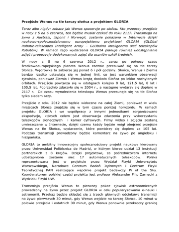 Przejście Wenus na tle tarczy słońca z projektem GLORIA Teraz albo nigdy: zobacz jak Wenus spaceruje po słońcu. Kto przeoczy przejście w nocy z 5 na 6 czerwca, ten będzie musiał czekać do roku 2117. Transmisja na żywo z Australii, Japonii i Norwegii, zostanie pokazana w Internecie dzięki naukowo-społecznościowemu europejskiemu projektowi GLORIA (GLObal Robotic-telescopes Intelligent Array – GLObalna inteligentna sieć teleskopów Robotów). W ramach tego wydarzenia GLORIA planuje również udostępnianie zdjęć i propozycje dedykowanych zajęć dla uczniów szkół średnich. W nocy z 5 na 6 czerwca 2012 r., zaraz po północy czasu środkowoeuropejskiego planeta Wenus zacznie przesuwać się na tle tarczy Słońca. Wędrówka ta zabierze jej ponad 6 i pół godziny. Słońce, Wenus i Ziemia bardzo rzadko ustawiają się w jednej linii, co jest warunkiem obserwacji zjawiska, ponieważ Ziemia i Wenus krążą dookoła Słońca po lekko nachylonych orbitach. Przejście powtarza się w odstępach kolejno 8 lat, 121,5 lat, 8 lat i 105,5 lat. Poprzednio zdarzyło się w 2004 r., a następne wydarzy się dopiero w 2117 r. Od czasu wynalezienia teleskopu Wenus przesunęła się na tle Słońca tylko siedem razy. Przejście z roku 2012 nie będzie widoczne na całej Ziemi, ponieważ w wielu miejscach Słońce znajdzie się w tym czasie poniżej horyzontu. W ramach projektu GLORIA i we współpracy z innymi jednostkami zorganizowano ekspedycje, których celem jest obserwacja zdarzenia przy wykorzystaniu teleskopów słonecznych i kamer cyfrowych. Filmy wideo i zdjęcia zostaną umieszczane w Internecie, dzięki czemu każdy będzie mógł obejrzeć przejście Wenus na tle Słońca, wydarzenie, które powtórzy się dopiero za 105 lat. Podczas transmisji prowadzony będzie komentarz na żywo po angielsku i hiszpańsku. GLORIA to ambitny innowacyjny społecznościowy projekt naukowy kierowany przez Universidad Politécnica de Madrid, w którym bierze udział 13 instytucji partnerskich z 8 krajów. Dzięki projektowi, za pośrednictwem internetu udostępniona zostanie sieć 17 automatycznych teleskopów. Polska reprezentowana jest w projekcie przez Wydział Fizyki Uniwersytetu Warszawskiego, Narodowe Centrum Badań Jądrowych i Centrum Fizyki Teoretycznej PAN realizujące wspólnie projekt badawczy Pi of the Sky. Koordynatorem polskiej części projektu jest profesor Aleksander Filip Żarnecki z Wydziału Fizyki UW. Transmisja przejścia Wenus to pierwszy pokaz zjawisk astronomicznych prowadzony na żywo przez projekt GLORIA w celu popularyzowania e-nauki i astronomii. Przekaz będzie składać się z trzech głównych odcinków: transmisji na żywo pierwszych 30 minut, gdy Wenus wejdzie na tarczę Słońca, 10 minut w połowie przejścia i ostatnich 30 minut, gdy Wenus ponownie przekroczy granicę tarczy słonecznej. W pozostałym czasie obrazy będą uaktualniane co 5 minut. Wszystkie obrazy będą od razu dostępne dla celów dydaktycznych. Dodatkowo przygotowano interesujące materiały dydaktyczne dla uczniów szkół średnich. Obserwując przejście Wenus na tle tarczy Słońca, uczniowie będą mogli wyznaczyć odległość między Ziemią a Słońcem, wykorzystując fotografie wykonane w trakcie przejścia w ramach projektu GLORIA. Organizatorzy projektu GLORIA zapraszają również wszystkich chętnych z całego świata do przesyłania i udostępniania wykonanych przez siebie zdjęć przejścia. Dla wielu ludzi na Ziemi to jest jedyna okazja, aby zobaczyć przejście Wenus. Co opowiemy tym, którzy będą mogli zobaczyć następne przejście – za 105 lat? Co będzie się działo w nocy z 5 na 6 czerwca 2012 na tle tego wspaniałego kosmicznego tańca? Zapraszamy wszystkich do wspólnego dokumentowania tego historycznego wydarzenia: zwróćcie wasze aparaty i kamery ku Ziemi i uwiecznijcie samych siebie, Waszych bliskich i Wasze życie w magiczną noc z 5 na 6 czerwca 2012 r. Jednocześnie chcielibyśmy aby ta szczególna noc i oczekiwanie na to wyjątkowe zjawisko astronomiczne stało się pretekstem do szerszego otwarcia nauki na sztukę, spotkania artystów z naukowcami, twórczego dialogu i współtworzenia. Nauka i sztuka mogą być dla siebie wzajemną inspiracją, a inspiracja początkiem interdyscyplinarnych działań zwieńczonych wspólnymi wydarzeniami, artystyczno-naukową twórczością i nowatorską wizją otaczającego nas świata. Pierwsze Spotkanie Nauki i Sztuki odbędzie się w wieczór poprzedzający przejście Wenus, 5 czerwca 2012 o godz. 18:30 w Muzeum Sztuki Nowoczesnej przy ul. Pańskiej 3 w Warszawie. Spotkanie będą moderować Lech Mankiewicz (fizyk, Centrum Fizyki Teoretycznej PAN), Patrycja Dołowy (artystka wizualna i popularyzatorka nauki), Konrad Smoliński (pasjonat astronomii, analytical designer, popularyzator nauki), Krzysztof Renes (rzeźbiarz, socjolog) i Emilia Sitarz (pianistka). Więcej informacji o przejściu i pierwszym eksperymencie projektu GLORIA www.gloria-project.eu (strona dostępne jest na hep.fuw.edu.pl/gloria oraz angielska). Pomoce dydaktyczne i inne materiały związane z przejściem Wenus można hep.fuw.edu.pl/gloria/downloads.html (oraz na: znaleźć na stronie: www.gloria-project.eu/didactic-activities/ ). O wyprawach, organizowanych przez Glorię, dowiesz się więcej na stronie: www.gloria-project.eu/expeditions/