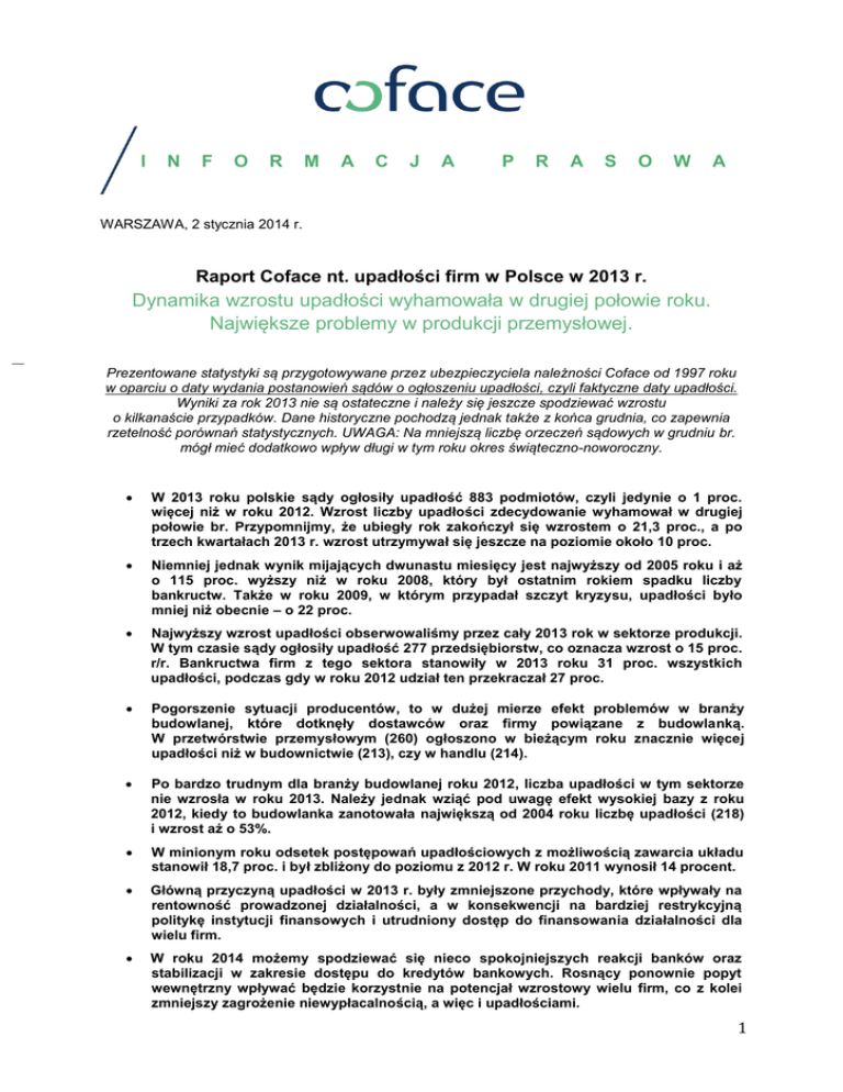 I N F O R M A C J A P R A S O W A WARSZAWA, 2 stycznia 2014 r. Raport Coface nt. upadłości firm w Polsce w 2013 r. Dynamika wzrostu upadłości wyhamowała w drugiej połowie roku. Największe problemy w produkcji przemysłowej. Prezentowane statystyki są przygotowywane przez ubezpieczyciela należności Coface od 1997 roku w oparciu o daty wydania postanowień sądów o ogłoszeniu upadłości, czyli faktyczne daty upadłości. Wyniki za rok 2013 nie są ostateczne i należy się jeszcze spodziewać wzrostu o kilkanaście przypadków. Dane historyczne pochodzą jednak także z końca grudnia, co zapewnia rzetelność porównań statystycznych. UWAGA: Na mniejszą liczbę orzeczeń sądowych w grudniu br. mógł mieć dodatkowo wpływ długi w tym roku okres świąteczno-noworoczny. W 2013 roku polskie sądy ogłosiły upadłość 883 podmiotów, czyli jedynie o 1 proc. więcej niż w roku 2012. Wzrost liczby upadłości zdecydowanie wyhamował w drugiej połowie br. Przypomnijmy, że ubiegły rok zakończył się wzrostem o 21,3 proc., a po trzech kwartałach 2013 r. wzrost utrzymywał się jeszcze na poziomie około 10 proc. Niemniej jednak wynik mijających dwunastu miesięcy jest najwyższy od 2005 roku i aż o 115 proc. wyższy niż w roku 2008, który był ostatnim rokiem spadku liczby bankructw. Także w roku 2009, w którym przypadał szczyt kryzysu, upadłości było mniej niż obecnie – o 22 proc. Najwyższy wzrost upadłości obserwowaliśmy przez cały 2013 rok w sektorze produkcji. W tym czasie sądy ogłosiły upadłość 277 przedsiębiorstw, co oznacza wzrost o 15 proc. r/r. Bankructwa firm z tego sektora stanowiły w 2013 roku 31 proc. wszystkich upadłości, podczas gdy w roku 2012 udział ten przekraczał 27 proc. Pogorszenie sytuacji producentów, to w dużej mierze efekt problemów w branży budowlanej, które dotknęły dostawców oraz firmy powiązane z budowlanką. W przetwórstwie przemysłowym (260) ogłoszono w bieżącym roku znacznie więcej upadłości niż w budownictwie (213), czy w handlu (214). Po bardzo trudnym dla branży budowlanej roku 2012, liczba upadłości w tym sektorze nie wzrosła w roku 2013. Należy jednak wziąć pod uwagę efekt wysokiej bazy z roku 2012, kiedy to budowlanka zanotowała największą od 2004 roku liczbę upadłości (218) i wzrost aż o 53%. W minionym roku odsetek postępowań upadłościowych z możliwością zawarcia układu stanowił 18,7 proc. i był zbliżony do poziomu z 2012 r. W roku 2011 wynosił 14 procent. Główną przyczyną upadłości w 2013 r. były zmniejszone przychody, które wpływały na rentowność prowadzonej działalności, a w konsekwencji na bardziej restrykcyjną politykę instytucji finansowych i utrudniony dostęp do finansowania działalności dla wielu firm. W roku 2014 możemy spodziewać się nieco spokojniejszych reakcji banków oraz stabilizacji w zakresie dostępu do kredytów bankowych. Rosnący ponownie popyt wewnętrzny wpływać będzie korzystnie na potencjał wzrostowy wielu firm, co z kolei zmniejszy zagrożenie niewypłacalnością, a więc i upadłościami. 1 rodzaj postępowania upadłościowego Upadłości w celu likwidacji majątku Upadłości z możliwością zawarcia układu ogółem 2000 2009 2010 2011 348 572 538 620 63 119 117 103 411 691 655 723 1863 1674 1500 1000 2008 zmiana 2012/11 2012 zmiana 2013/12 711 718 166 21,3% 877 2013 165 +1% 883 Postanowienia upadłościowe w Polsce w latach 1997-2013 wg Ogólnopolskiego Informatora Upadłościowego Coface 1798 1289 1116 1017 794 864 877 793 691 655 576 883 723 447 411 500 0 1997 1999 2001 2003 2005 2007 2009 2011 2013 Komentuje Grzegorz Sielewicz, główny ekonomista Coface w Polsce Rok 2013 nie był sprzyjający dla większości polskich przedsiębiorstw. Ich wyniki finansowe zostały osłabione przez znaczny spadek konsumpcji prywatnej, osiągający punkt kulminacyjny w pierwszym kwartale 2013 r. Wiele firm zostało zmuszonych do ograniczenia planowanych inwestycji, a niektóre także do redukcji zatrudnienia. Publikowane wskaźniki makroekonomiczne potwierdzają, że polska gospodarka najgorsze ma już za sobą i od drugiej połowy 2013 roku powraca na ścieżkę wzrostu, którą możemy zdefiniować jako ożywienie, ale jak na razie niestety stopniowe i skromne. Interpretacja danych pozwala wnioskować, że obecna sytuacja to produkowane dopiero paliwo do silnika wzrostu gospodarczego, który zacznie pracować na odpowiednich obrotach w ciągu 2014 roku. Tym samym jest jeszcze zdecydowanie za wcześnie, aby popadać w huraoptymizm, ale zupełnie uzasadnione jest, aby dostrzegać pozytywne perspektywy i rosnący potencjał polskiej gospodarki. Sytuacja makroekonomiczna znajduje odzwierciedlenie w kondycji sektora przedsiębiorstw. O ile pierwsza połowa 2013 roku charakteryzowała się znaczną liczbą upadłości polskich firm, o tyle dynamika bankructw uległa wyhamowaniu pod koniec roku. Niemniej jednak 883 przedsiębiorstwa, wobec których orzeczono upadłość na przestrzeni roku to najwyższa liczba od 9 lat. Najbardziej odporne na spowolnienie pozostawały duże firmy o obrotach powyżej 50 mln zł, ze względu na większą elastyczność finansową w przypadku problemów płynnościowych. Tym samym małe i średnie przedsiębiorstwa stanowiły aż 88% łącznej liczby upadających firm. 2 W 2014 roku polskie firmy – w obliczu powracającego wzrostu konsumpcji prywatnej i przy utrzymujących się rekordowo niskich stopach procentowych – będą czuły się pewniej i wiele z nich ponownie będzie inwestowało w środki trwałe. Jeśli nie wystąpią negatywne czynniki egzogeniczne, zwłaszcza napływające ze strony głównych partnerów handlowych, polska gospodarka będzie sukcesywnie notować wyższy wzrost gospodarczy, wciąż wspierany przez eksport netto oraz stopniowo dołączający popyt krajowy. Niemniej jednak, trudności płynnościowe przedsiębiorstw nie kończą się z nadejściem 2014 roku