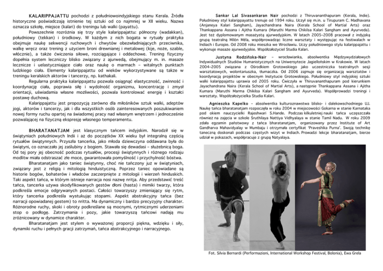 KALARIPPAJATTU pochodzi z południowoindyjskiego stanu Kerala. Źródła historyczne poświadczają istnienie tej sztuki od co najmniej w XII wieku. Nazwa oznacza szkołę, miejsce (kalari) do treningu lub walki (payattu). Powszechnie rozróżnia się trzy style kalarippajattu: północny (wadakkan), południowy (tekkan) i środkowy. W każdym z nich bogata w rytuały praktyka obejmuje naukę sekwencji ruchowych i chwytów obezwładniających przeciwnika, walkę wręcz oraz trening z użyciem broni drewnianej i metalowej (kije, noże, szable, włócznie), a także ćwiczenia siłowe, rozciągające i oddechowe. Trening fizyczny dopełnia system leczniczy blisko związany z ajurwedą, obejmujący m. in. masaże lecznicze i uelastyczniające ciało oraz naukę o marmach – witalnych punktach ludzkiego ciała. Elementy kalarippajattu od wieków wykorzystywane są także w treningu keralskich aktorów i tancerzy, np. kathakali. Regularna praktyka kalarippajattu pozwala osiągnąć elastyczność, zwinność i koordynację ciała, poprawia siłę i wydolność organizmu, koncentrację i zmysł orientacji, uświadamia własne możliwości, pozwala kontrolować energię i kształci postawę duchową. Kalarippajattu jest propozycją zarówno dla miłośników sztuk walki, adeptów jogi, aktorów i tancerzy, jak i dla wszystkich osób zainteresowanych poszukiwaniem nowej formy ruchu opartej na świadomej pracy nad własnym wnętrzem i jednocześnie pozwalającej na fizyczną ekspresję własnego temperamentu. BHARATANATJAM jest klasycznym tańcem indyjskim. Narodził się w świątyniach południowych Indii i aż do początków XX wieku był integralną częścią rytuałów świątynnych. Przyszła tancerka, jako młoda dziewczyna oddawana była do świątyni, co oznaczało jej zaślubiny z bogiem. Stawała się dewadasi – służebnicą boga. Od tej pory jej obecność podczas rytuałów, procesji świątynnych i różnego rodzaju modlitw miała odstraszać złe moce, gwarantowała pomyślność i przychylność bóstwa. Bharatanatjam jako taniec świątynny, choć nie tańczony już w świątyniach, związany jest z religią i mitologią hinduistyczną. Poprzez taniec opowiadane są historie bogów, bohaterów i władców zaczerpnięte z mitologii i wierzeń hinduskich. Taki aspekt tańca, w którym istnieje narracja nosi nazwę nritja. Aby przedstawić treść tańca, tancerka używa skodyfikowanych gestów dłoni (hasta) i mimiki twarzy, która podkreśla emocje odgrywanych postaci. Całości towarzyszy zmieniający się rytm, który tancerka podkreśla wystukując stopami. Aspekt abstrakcyjny tańca (bez narracji opowiadanej gestem) to nritta. Ma dynamiczny i bardzo precyzyjny charakter. Różnorodne ruchy, skoki i obroty podkreślane są mocnymi, rytmicznymi uderzeniami stop o podłogę. Zatrzymania i pozy, jakie towarzyszą tańcowi nadają mu zróżnicowany w dynamice charakter. Bharatanatjam jest stylem o wyważonej proporcji piękna, wdzięku i siły, dynamiki ruchu i pełnych gracji zatrzymań, tańca abstrakcyjnego i narracyjnego. Sankar Lal Sivasankaran Nair pochodzi z Thiruvananthapuram (Kerala, Indie). Południowy styl kalarippayattu trenuje od 1994 roku. Uczył się m.in. u Tirupuram C. Madhavana (Anjaneya Kalari Sangham), Jayachandrana Naira (Kerala School of Martial Arts) oraz Thankappana Assana i Ajitha Kumara (Maruthi Marma Chikilsa Kalari Sangham and Ayurveda). Jest też dyplomowanym masażystą ajurwedyjskim. W latach 2005–2008 pracował z indyjską grupą teatralną Milón Méla, współprowadząc liczne warsztaty i występując na festiwalach w Indiach i Europie. Od 2008 roku mieszka we Wrocławiu. Uczy południowego stylu kalarippajattu i wykonuje masaże ajurwedyjskie. Współzałożyciel Studia Kalari. Justyna Rodzińska-Nair – wrocławianka, absolwentka Międzywydziałowych Indywidualnych Studiów Humanistycznych na Uniwersytecie Jagiellońskim w Krakowie. W latach 2004–2005 związana z Ośrodkiem Grotowskiego jako uczestniczka teatralnych sesji warsztatowych, wolontariuszka, tłumaczka. Od 2006 zajmuje się organizacją warsztatów i koordynacją projektów w obecnym Instytucie Grotowskiego. Południowy styl indyjskiej sztuki walki kalarippajattu uprawia od 2005 roku. Ćwiczyła w Thiruvananthapuram pod kierunkiem Jayachandrana Naira (Kerala School of Martial Arts), a następnie Thankappana Assana i Ajitha Kumara (Maruthi Marma Chikilsa Kalari Sangham and Ayurveda). Współprowadzi treningi i warsztaty. Współzałożycielka Studia Kalari. Agnieszka Kapelko – absolwentka kulturoznawstwa blisko- i dalekowschodniego UJ. Naukę tańca bharatanatjam rozpoczęła w roku 2004 w miejscowości Gokarna w stanie Karnataka pod okiem nauczycielki Rajeshwari S.Hande. Podczas kilkuletniej nauki tańca uczęszczała również na zajęcia w szkole Sruthilaya Nattiya Vidhyalaya w stanie Tamil Nadu. W roku 2009 zdała egzamin państwowy z tańca bharatanatjam, organizowany przez Institute of Art Gandharva Mahavidyalay w Mumbaju i otrzymała certyfikat ‘Praveshika Purna’. Swoją technikę taneczną doskonali podczas częstych wizyt w Indiach. Prowadzi lekcje bharatanatjam, bierze udział w pokazach, współpracuje z grupą Natyalaya. Fot. Silvia Bernardi (Performazioni, International Workshop Festival, Bolonia), Ewa Grela