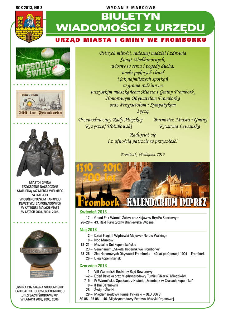 ROK 2013, NR 3 WYDANIE MARCOWE BIULETYN WIADOMOŚCI Z URZĘDU URZĄD MIASTA I GMINY WE FROMBORKU Pełnych miłości, radosnej nadziei i zdrowia Świąt Wielkanocnych, wiosny w sercu i pogody ducha, wielu pięknych chwil i jak najmilszych spotkań w gronie rodzinnym wszystkim mieszkańcom Miasta i Gminy Frombork, Honorowym Obywatelom Fromborka oraz Przyjaciołom i Sympatykom życzą Przewodniczący Rady Miejskiej Krzysztof Hołubowski Burmistrz Miasta i Gminy Krystyna Lewańska Radujcież się i z ufnością patrzcie w przyszłość! Frombork, Wielkanoc 2013 MIASTO I GMINA TRZYKROTNIE NAGRODZONE STATUETKĄ KAZIMIERZA WIELKIEGO ZA I MIEJSCE W OGÓLNOPOLSKIM RANKINGU INWESTYCJI SAMORZĄDOWYCH W KATEGORII MAŁYCH MIAST W LATACH 2003, 2004 i 2005. KALENDARIUM IMPREZ Kwiecień 2013 17 – Grand Prix Warmii, Żuław oraz Kujaw w Brydżu Sportowym 26–28 – 43. Rajd Turystyczny Braniewska Wiosna Maj 2013 2 – Dzień Flagi. II Wędrówki Majowe (Nordic Walking) 18 – Noc Muzeów 18–21 – Muzealne Dni Kopernikańskie 23 – Seminarium „Mikołaj Kopernik we Fromborku” 23–26 – Zlot Honorowych Obywateli Fromborka – 40 lat po Operacji 1001 – Frombork 26 – Bieg Kopernikański Czerwiec 2013 „GMINA PRZYJAZNA ŚRODOWISKU” LAUREAT NARODOWEGO KONKURSU „PRZYJAŹNI ŚRODOWISKU” W LATACH 2003, 2005, 2006. 1 – VIII Warmiński Rodzinny Rajd Rowerowy 1–2 – Dzień Dziecka oraz Międzynarodowy Turniej Piłkarski Młodzików 7–9 – IV Warmińskie Spotkania z Historią „Frombork w Czasach Kopernika” 8 – II Dni Baranówki 28 – Święto Śledzia 29 – Międzynarodowy Turniej Piłkarski – OLD BOYS 30.06.–25.08. – 46. Międzynarodowy Festiwal Muzyki Organowej SPRAWOZDANIE Z PRACY BURMISTRZA W OKRESIE MIĘDZY SESJAMI RADY MIEJSKIEJ WE FROMBORKU od 1 lutego do 21 marca 2013 r li Pan Zbigniew Pietkiewicz, zamieszkały w Roninie i Pani Aleksandra Koźlikowska-Szymborska, zamieszkała w miejscowości Wyrzysk za cenę nabycia w kwocie 5004,00 złotych brutto; 2.najmu budynku użytkowego numer 5 (obora) w miejscowości Nowe Sadłuki. Dzierżawcą budynku został Pan Damian Brewczak, zamieszkały w Wielkim Wierznie za cenę czynszu najmu w wysokości 354,24 złotych brutto w stosunku miesięcznym. 3.administrowania miejskiego basenu kąpielowego we Fromborku. Administratorem ustalono Przedsiębiorstwo Produkcyjno-Usługowe „Copernicus” Sp. z o.o. we Fromborku. Pozostałe dwa: 1.na sprzedaż 10 nieruchomości gruntowych z przeznaczeniem na zabudowę garażową położonych we Fromborku przy ulicy Osiedle Słoneczne oraz 2.na sprzedaż 6 nieruchomości gruntowych z przeznaczeniem na zabudowę garażową położonych we Fromborku przy ulicy Basztowej nie przyniosły rezultatów. 14 marca 2013 roku Komisja w składzie: Panie Marta Chmarycz i Ewa Maliszewska z Urzędu Marszałkowskiego w Olsztynie z Departamentu Turystyki przeprowadziły kontrolę dokumentów związanych z projektem „Modernizacja Centrum Informacji Turystycznej” we Fromborku oraz wizytację obiektu Centrum. Komisja nie wniosła uwag. Stwierdziła, że nasz projekt jest wręcz modelowym rozwiązaniem. Panie Przewodniczący Rady Miejskiej! Panie i Panowie Radni! Panie i Panowie Sołtysi! Szanowni Państwo! Sprawozdanie, które przedkładam Radzie Miejskiej obejmuje okres od 1 lutego do 21 marca 2013 roku. W tym czasie wprowadzonych zostało 8 zarządzeń burmistrza w następujących sprawach: • Nr 8/2013 z 1 lutego 2013 r. w sprawie odwołania członka Zespołu Interdyscyplinarnego oraz powołania nowego członka Zespołu Interdyscyplinarnego. • Nr 9/2013 z 9 lutego 2013 r. w sprawie zatwierdzenia planu kontroli na rok 2013; • Nr 10/2013 z 13 lutego 2013 r. w sprawie powołania na 2013 rok Komisji Konkursowej do przeprowadzenia konkursów ofert na realizację zadań publicznych Gminy Frombork przez organizacje pozarządowe oraz podmioty, o których mowa w art. 3 ust. 3 ustawy z dnia 24 kwietnia 2003 r. o działalności pożytku publicznego i o wolontariacie; • Nr 11/2013 z 26 lutego 2013 r. w sprawie zmian w budżecie na 2013 r.; • Nr 12/2013 z 27 lutego 2013 r. w sprawie zmian w budżecie na 2013 r.; • Nr 13/2013 z 4 marca 2013 r. w sprawie powołania nowego członka Zespołu Interdyscyplinarnego; • Nr 14/2013 z dnia 4 marca 2013 r. w sprawie rozstrzygnięcia przyjętych zasad rachunkowości w Urzędzie Miasta i Gminy Frombork; • Nr 15/2013 z 4 marca 2013 r. w sprawie rozstrzygnięcia otwartego konkursu ofert na realizację zadań publicznych Gminy Frombork na 2013 r. W okresie sprawozdawczym zostały podpisane 4 umowy notarialne, w tym na: 1.sprzedaż lokalu mieszkalnego numer 1 znajdującego się w budynku nr 12 w mieście Fromborku przy ulicy Osiedle Słoneczne na rzecz Pani Jolanty Ciach-Symonowicz i Pana Roberta Symonowicza, zamieszkałych we Fromborku; 2.sprzedaż lokalu mieszkalnego numer 2 znajdującego się w budynku nr 1 w mieście Fromborku przy ulicy Młynarskiej na rzecz Pani Janiny Piotrowskiej, zamieszkałej w tym mieszkaniu; 3.nieodpłatne nabycie od PKP S.A. w Warszawie na rzecz Gminy Frombork w użytkowanie wieczyste nieruchomości oznaczonej jako działka o numerze 8/7 o powierzchni 1033 m2, obręb nr 6 Frombork przy ulicy Dworcowej oraz prawa własności budynku użytkowego – dworca PKP znajdującego się na tej nieruchomości; 4.nieodpłatne ustanowienie na rzecz PKP S.A. w Warszawie prawa przesyłu urządzeń elektroenergetycznych na nieruchomości oznaczonej jako działka nr 8/6, obręb nr 6 miasta Fromborka przy ulicy Dworcowej. Zostało przeprowadzonych pięć przetargów. Trzy z nich zostały rozstrzygnięte. Dotyczyły one: 1.sprzedaży nieruchomości gruntowej o powierzchni 300 m2 w miejscowości Ronin. Nabywcami nieruchomości zosta- Przypomnę Państwu Radnym, że całość wcześniej przeprowadzonych prac remontowych pomieszczeń Centrum wyniosła: 38 445,46 złotych przy dofinansowaniu z Europejskiego Funduszu Rozwoju Regionalnego 85% kosztów kwalifikowalnyc