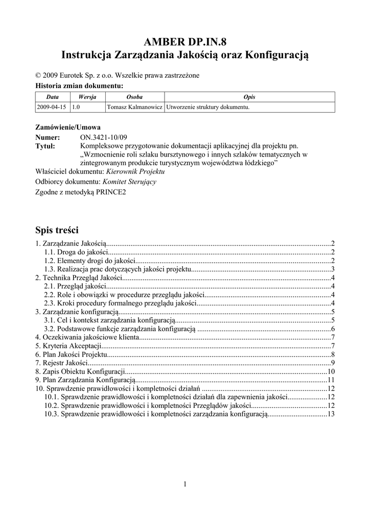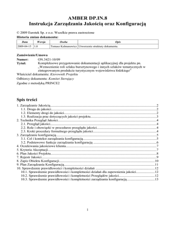 AMBER DP.IN.8 Instrukcja Zarządzania Jakością oraz Konfiguracją © 2009 Eurotek Sp. z o.o. Wszelkie prawa zastrzeżone Historia zmian dokumentu: Data Wersja 2009-04-15 1.0 Osoba Opis Tomasz Kalmanowicz Utworzenie struktury dokumentu. Zamówienie/Umowa ON.3421-10/09 Numer: Kompleksowe przygotowanie dokumentacji aplikacyjnej dla projektu pn. Tytuł: „Wzmocnienie roli szlaku bursztynowego i innych szlaków tematycznych w zintegrowanym produkcie turystycznym województwa łódzkiego” Właściciel dokumentu: Kierownik Projektu Odbiorcy dokumentu: Komitet Sterujący Zgodne z metodyką PRINCE2 Spis treści 1. Zarządzanie Jakością........................................................................................................................2 1.1. Droga do jakości.......................................................................................................................2 1.2. Elementy drogi do jakości........................................................................................................2 1.3. Realizacja prac dotyczących jakości projektu...........................................................................3 2. Technika Przegląd Jakości................................................................................................................4 2.1. Przegląd jakości........................................................................................................................4 2.2. Role i obowiązki w procedurze przeglądu jakości...................................................................4 2.3. Kroki procedury formalnego przeglądu jakości........................................................................4 3. Zarządzanie konfiguracją..................................................................................................................5 3.1. Cel i kontekst zarządzania konfiguracją...................................................................................5 3.2. Podstawowe funkcje zarządzania konfiguracją .......................................................................6 4. Oczekiwania jakościowe klienta......................................................................................................7 5. Kryteria Akceptacji...........................................................................................................................7 6. Plan Jakości Projektu........................................................................................................................8 7. Rejestr Jakości..................................................................................................................................9 8. Zapis Obiektu Konfiguracji............................................................................................................10 9. Plan Zarządzania Konfiguracją.......................................................................................................11 10. Sprawdzenie prawidłowości i kompletności działań ...................................................................12 10.1. Sprawdzenie prawidłowości i kompletności działań dla zapewnienia jakości.....................12 10.2. Sprawdzenie prawidłowości i kompletności Przeglądów jakości........................................12 10.3. Sprawdzenie prawidłowości i kompletności zarządzania konfiguracją................................13 1 AMBER DP.IN.8 - Instrukcja Zarządzania Jakością oraz Konfiguracją 1. Zarządzanie Jakością 1.1. Droga do jakości Kwestie dotyczące jakości należy zaczynać od stwierdzenia, jakie są Kryteria Akceptacji oraz Oczekiwania jakościowe klienta. Powinno to być wykonane w podprocesie Przygotowanie Założeń Projektu (PP4). Żaden realistyczny plan dostarczenia klientowi produktu o określonej jakości nie może powstać, dopóki obie strony, klient i dostawca, nie opiszą i nie uzgodnią, jaka ma być ta jakość. Klient i dostawca potrzebują wspólnego zrozumienia związku między jakością, kosztami i czasem, i muszą je równoważyć zapewniając, że produkt końcowy odpowiada swemu przeznaczeniu i został wykonany w ramach innych ograniczeń. Zgodnie z Podręcznikiem PRINCE2: Jakość w projektach to kwestia identyfikowania tego, co sprawia, że produkty projektu lub usługi odpowiadają swemu przeznaczeniu, jakim jest zaspokojenie wyspecyfikowanych potrzeb. 1.2. Elementy drogi do jakości 1. Oczekiwania Jakościowe Klienta 2. Kryteria Akceptacji 3. ISO 4. Polityka jakości 5. System zarządzania jakością (SZJ) 6. Formuła Realizacji Projektu 7. Nadzór Projektu 8. Plan Jakości Projektu 9. Plan jakości etapu lub plan jakości zespołu 10. Opisy Produktów i kryteria jakości 11. Przegląd jakości 12. Rejestr Jakości 13. Zagadnienia Projektowe ISO ISO publikuje szereg międzynarodowych standardów, łącznie ze standardami dla systemów zarządzania jakością. Istnieje specjalny standard obejmujący wymagania dla systemów zarządzania jakością w zakresie projektowania lub konstruowania, wytwarzania, uruchamiania i serwisowania produktu wraz z zarządzaniem projektem. Standard ten stosowany jest przez wiele organizacji jako podstawa ich systemów zarządzania jakością (SZJ). Firma może stosować standard jakości ISO: 1. ustanawiając funkcję zarządzania jakością; 2. sprawdzając systemy nadzoru jakości dostawcy. Polityka jakości Klient i/lub dostawca mogą posiadać określoną politykę jakości, formułującą stanowisko firmy w odniesieniu do jakości wszystkiego, co firma robi lub stosuje. Powinna ona ukierunkowywać i wpływać na nastawienie dostawcy przy konstruowaniu, testowaniu i reagowaniu na wszelkie zażalenia klienta dotyczące jakości. Jeśli zarówno klient, jak i dostawca mają politykę jakości, sensowne jest sprawdzić, czy są one 2 AMBER DP.IN.8 - Instrukcja Zarządzania Jakością oraz Konfiguracją zharmonizowane. Jeśli nie, powstanie potrzeba wypracowania kompromi