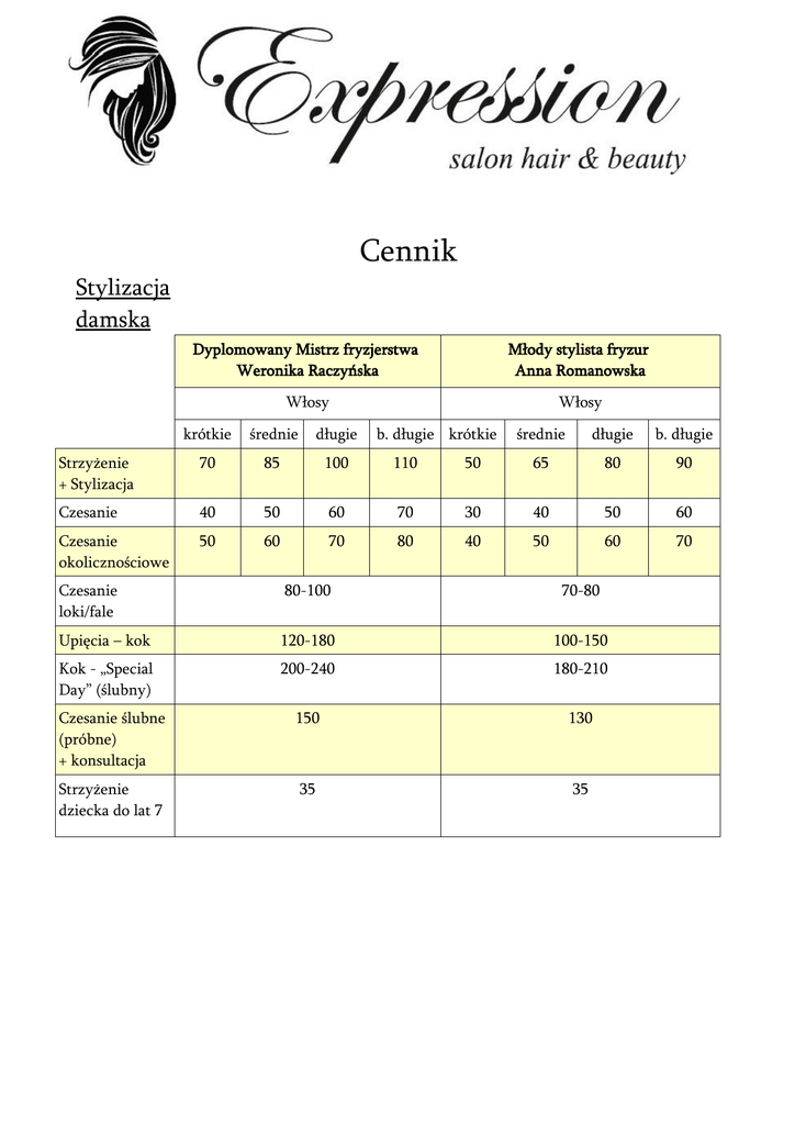 Cennik Stylizacja damska Dyplomowany Mistrz fryzjerstwa Weronika Raczyńska Młody stylista fryzur Anna Romanowska Włosy Włosy krótkie średnie długie b. długie krótkie średnie długie b. długie Strzyżenie + Stylizacja 70 85 100 110 50 65 80 90 Czesanie 40 50 60 70 30 40 50 60 Czesanie okolicznościowe 50 60 70 80 40 50 60 70 Czesanie loki/fale 80-100 70-80 Upięcia – kok 120-180 100-150 Kok - „Special Day” (ślubny) 200-240 180-210 Czesanie ślubne (próbne) + konsultacja 150 130 Strzyżenie dziecka do lat 7 35 35 Koloryzacja Dyplomowany Mistrz fryzjerstwa Weronika Raczyńska Młody stylista fryzur Anna Romanowska Włosy Włosy krótkie średnie długie b. długie krótkie średnie długie b. długie Farba + Stylizacja 180 210 240 260 155 185 215 235 Farba+Refleks +Stylizacja 210 250 270 290 185 225 245 265 Farba+Baleyage +Stylizacja 240 270 290 310 215 245 265 285 Baleyage 1kolor+ Stylizacja 190 220 250 270 165 195 225 245 **Baleyage +Tonowanie +Stylizacja 220 250 280 300 195 225 255 275 **Rozjaśnianie +Tonowanie +Stylizacja 210 240 270 290 185 215 245 265 Dekoloryzacja +Farba+Stylizacja 270 320 370 420 245 295 345 395 dodatkowe zużycie produktu 35 55 75 95 35 55 75 95 Refleksy +Stylizacja 145 165 185 200 120 140 160 175 Koloryzacja Elumen 220 250 280 300 200 230 260 280 *Przy dużym zużyciu materiału dodatkowa dopłata do produkty bez względu na długość włosów- 20zł. **Do usługi baleyage/rozjaśnianie koloryzacja Elumen + 40 zł Usługa bez strzyżenia -20zł. Silk Lift/New anti-yellow System Ammonia-Free +20zł.do usługi Dyplomowany Mistrz fryzjerstwa Weronika Raczyńska Młody stylista fryzur Anna Romanowska Strzyżenie+masaż +czesanie 50 40 Strzyżenie maszynką +masaż 20 15 Czesanie + masaż 30 20 50 50 Koloryzacja męskablendowanie siwizny Trwała ondulacja Dyplomowany Mistrz fryzjerstwa Weronika Raczyńska Młody stylista fryzur Anna Romanowska Włosy Włosy krótkie średnie długie b. długie krótkie średnie długie b. długie Trwała + stylizacja 160 190 220 - 155 165 195 - Trwały styling + stylizacja (TexturizelGoldw ell) 170 200 - - 145 175 - - Keratyna Dyplomowany Mistrz fryzjerstwa Weronika Raczyńska Młody stylista fryzur Anna Romanowska Włosy Włosy krótkie średnie długie b. długie krótkie średnie długie b. długie Bio-Keratin 250 300 400 500 225 275 375 475 Sense-Keratin 300 350 450 550 275 325 425 525 Pakiet kosmetyków szampon+odżywka VITAKER podtrzymujący zabieg organicznej Bio-Keratyny - 120zł Regeneracja Dyplomowany Mistrz fryzjerstwa Weronika Raczyńska Młody stylista fryzur Anna Romanowska Włosy Włosy krótkie średnie Sauna+maska /ampułka 25 Ampułka Goldwell (bez spłukiwania) Brazylijska odnowa włosa (maska keratynowa NOVEX + sauna) 35 długie b. długie krótkie 45 55 25 35zł/szt. 30 40 50 średnie 35 długie b. długie 45 55 35zł/szt. 60 30 40 50 60 Przedłużanie i zagęszczanie włosów naturalnych Dyplomowany Mistrz fryzjerstwa Weronika Raczyńska Młody stylista fryzur Anna Romanowska Metoda keratynowa na ciepło 9zł/ pasemko 8zł/pasemko Metoda keratynowa na zimno (ultradźwięki) 10zł/ pasemko 9zł/ pasemko Zdjęcie włosów 120zł / godz. 120zł/ godz.