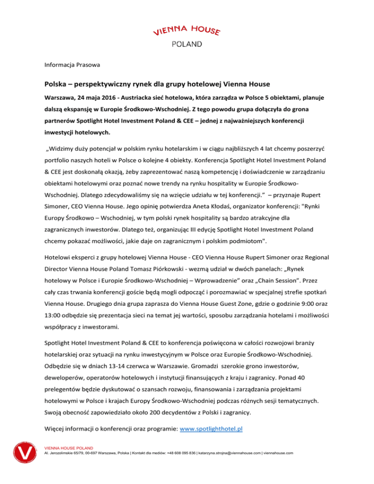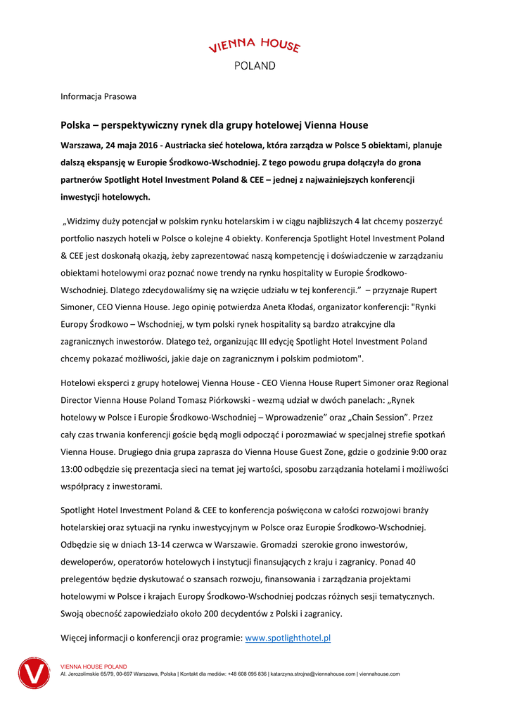 Informacja Prasowa Polska – perspektywiczny rynek dla grupy hotelowej Vienna House Warszawa, 24 maja 2016 - Austriacka sieć hotelowa, która zarządza w Polsce 5 obiektami, planuje dalszą ekspansję w Europie Środkowo-Wschodniej. Z tego powodu grupa dołączyła do grona partnerów Spotlight Hotel Investment Poland & CEE – jednej z najważniejszych konferencji inwestycji hotelowych. „Widzimy duży potencjał w polskim rynku hotelarskim i w ciągu najbliższych 4 lat chcemy poszerzyć portfolio naszych hoteli w Polsce o kolejne 4 obiekty. Konferencja Spotlight Hotel Investment Poland & CEE jest doskonałą okazją, żeby zaprezentować naszą kompetencję i doświadczenie w zarządzaniu obiektami hotelowymi oraz poznać nowe trendy na rynku hospitality w Europie ŚrodkowoWschodniej. Dlatego zdecydowaliśmy się na wzięcie udziału w tej konferencji.” – przyznaje Rupert Simoner, CEO Vienna House. Jego opinię potwierdza Aneta Kłodaś, organizator konferencji: "Rynki Europy Środkowo – Wschodniej, w tym polski rynek hospitality są bardzo atrakcyjne dla zagranicznych inwestorów. Dlatego też, organizując III edycję Spotlight Hotel Investment Poland chcemy pokazać możliwości, jakie daje on zagranicznym i polskim podmiotom". Hotelowi eksperci z grupy hotelowej Vienna House - CEO Vienna House Rupert Simoner oraz Regional Director Vienna House Poland Tomasz Piórkowski - wezmą udział w dwóch panelach: „Rynek hotelowy w Polsce i Europie Środkowo-Wschodniej – Wprowadzenie” oraz „Chain Session”. Przez cały czas trwania konferencji goście będą mogli odpocząć i porozmawiać w specjalnej strefie spotkań Vienna House. Drugiego dnia grupa zaprasza do Vienna House Guest Zone, gdzie o godzinie 9:00 oraz 13:00 odbędzie się prezentacja sieci na temat jej wartości, sposobu zarządzania hotelami i możliwości współpracy z inwestorami. Spotlight Hotel Investment Poland & CEE to konferencja poświęcona w całości rozwojowi branży hotelarskiej oraz sytuacji na rynku inwestycyjnym w Polsce oraz Europie Środkowo-Wschodniej. Odbędzie się w dniach 13-14 czerwca w Warszawie. Gromadzi szerokie grono inwestorów, deweloperów, operatorów hotelowych i instytucji finansujących z kraju i zagranicy. Ponad 40 prelegentów będzie dyskutować o szansach rozwoju, finansowania i zarządzania projektami hotelowymi w Polsce i krajach Europy Środkowo-Wschodniej podczas różnych sesji tematycznych. Swoją obecność zapowiedziało około 200 decydentów z Polski i zagranicy. Więcej informacji o konferencji oraz programie: www.spotlighthotel.pl VIENNA HOUSE POLAND Al. Jerozolimskie 65/79, 00-697 Warszawa, Polska | Kontakt dla mediów: +48 608 095 836 | [email protected] | viennahouse.com O Vienna House W Vienna House najważniejsza jest radość podróżowania, zdobywanie nowych doświadczeń i odkrywanie. Motto sieci to „nie ma nic bardziej wyrafinowanego w życiu niż proste przyjemności”. Vienna House reprezentuje cztery marki hoteli – każda ma swój indywidualny charakter, ale łączą je te same wartości I jeden cel: inspirowanie gości. Największa austriacka grupa hotelowa – od 2016 roku pod wspólną marką „Vienna House” – posiada i zarządza indywidualnymi hotelami miejskimi oraz resortami, designerskimi obiektami „andel's by Vienna House“, tętniącymi życiem hotelami koncepcyjnymi „angelo by Vienna House“, jak również stawiającymi na naturalność „Vienna House Easy“. Firma zatrudnia obecnie 2200 pracowników w dziesięciu krajach: od Francji po Rosję, od Polski po Austrię. Hotele znajdują się m.in. w Berlinie, Bratysławie, Bukareszcie, Coburgu, Karlsbadzie, Krakowie, Łodzi, Monachium, Neckarsulm, Trewirze, Paryżu i Pradze. Vienna House jest znakiem towarowym firmy Vienna International Hotelmanagement AG. www.viennahouse.com Kontakt dla mediów: Katarzyna Strojna-Szwaj Regional Communication & Marketing Manager Vienna House Poland [email protected] Tel. +48 608 095 836 Zdjęcia do pobrania (ctrl + klik otwiera zdjęcie w dużej rozdzielczości, które można pobrać) Zdjęcie 1 – Logo Vienna House Zdjęcie 2 – Logo konferencji Spotlight Hotel Investment Poland & CEE Zdjęcie 3 – Hotel andel’s by Vienna House Lodz, flagowy obiekt grupy Zdjęcie 4 – Lobby angelo by Vienna House Katowice, koncepcyjnego hotelu biznesowego Zdjęcie 5 – Zdrowa przerwa kawowa w Vienna House Easy Chopin Cracow Zdjęcie 6 – Wszystkie pokoje z widokiem na morze w Vienna House Amber Baltic Miedzyzdroje VIENNA HOUSE POLAND Al. Jerozolimskie 65/79, 00-697 Warszawa, Polska | Kontakt dla mediów: +48 608 095 836 | [email protected] | viennahouse.com