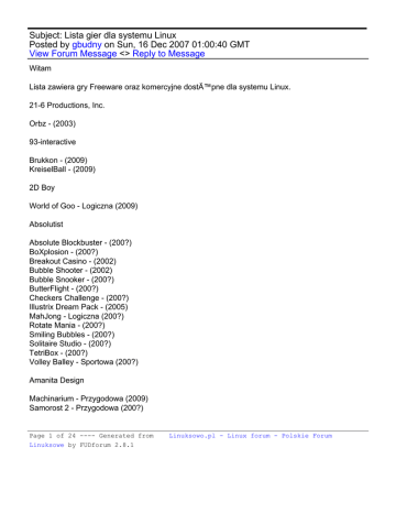 Subject: Lista gier dla systemu Linux Posted by gbudny on Sun, 16 Dec 2007 01:00:40 GMT View Forum Message <> Reply to Message Witam Lista zawiera gry Freeware oraz komercyjne dostępne dla systemu Linux. 21-6 Productions, Inc. Orbz - (2003) 93-interactive Brukkon - (2009) KreiselBall - (2009) 2D Boy World of Goo - Logiczna (2009) Absolutist Absolute Blockbuster - (200?) BoXplosion - (200?) Breakout Casino - (2002) Bubble Shooter - (2002) Bubble Snooker - (200?) ButterFlight - (200?) Checkers Challenge - (200?) Illustrix Dream Pack - (2005) MahJong - Logiczna (200?) Rotate Mania - (200?) Smiling Bubbles - (200?) Solitaire Studio - (200?) TetriBox - (200?) Volley Balley - Sportowa (200?) Amanita Design Machinarium - Przygodowa (2009) Samorost 2 - Przygodowa (200?) Page 1 of 24 ---- Generated from Linuksowe by FUDforum 2.8.1 Linuksowo.pl - Linux forum - Polskie Forum Anawiki Games Dress-Up Pups - Logiczna (2011) Path of Magic - Logiczna (2007) Runes of Avalon - Logiczna (2007) Runes of Avalon 2 - Logiczna (2008) Soccer Cup Solitaire - Logiczna (2010) The Perfect Tree - Logiczna (2010) Ankama Games Dofus - RPG (2005) Dofus-Arena - RPG (20??) Applied Systems Ltd. Between the Worlds - (2009) Arctic Paint Number Drill - Edukacyjna (2009) Basilisk Games Eschalon: Book I - RPG (2007) Eschalon: Book II - RPG (2010) Big Fat Alien Beep - Platformowa (2011) Bit Blot Aquaria - Przygodowa (2010) Bioware Neverwinter Nights - RPG (2003) Blendo Games Page 2 of 24 ---- Generated from Linuksowe by FUDforum 2.8.1 Linuksowo.pl - Linux forum - Polskie Forum Air Forte - (2010) Atom Zombie Smasher - Strategia (2011) Broken Rules And Yet It Moves - Platformowa (2010) Caravel Games Deadly Rooms of Death: Journey to Rooted Hold - (2005) Deadly Rooms Of Death: King Dugan's Dungeon - (2005) Deadly Rooms Of Death: Tendry's Tale - (2008) Deadly Rooms Of Death: The City Beneath - (2007) Charlie's Games Bullet Candy - Strzelanka (2011) Bullet Candy Perfect - Strzelanka (2010) Irukandji - Strzelanka (2009) Scoregasm - Strzelanka (2011) Space Phallus - Strzelanka (2009) Freeware CipSoft Tibia - RPG (2006) Chronic Logic Bridge Construction Set - Symulacja (2002) Gish - Platformowa (2004) Triptych - Logiczna (2002) Zatikon - Strategia (2008) Freeware Zatikon:Crusades - Strategia (200?) Zatikon: Legions - Strategia (20??) ColorCube Studio ColorCube - (2010) Color It By Numbers Color by Numbers Animals - Edukacyjna (2011) Page 3 of 24 ---- Generated from Linuksowe by FUDforum 2.8.1 Linuksowo.pl - Linux forum - Polskie Forum Color by Numbers - Flowers - Edukacyjna (2011) Color by Numbers Princesses - Edukacyjna (2011) Color by Numbers Vehicles - Edukacyjna (2011) Cronk Software Cronk - (20??) Curious Media Blokt - (200?) Cyberjoueurs Graal Online - RPG (200?) Days of Wonder Memoir '44 Online - Strategia (2011) Darrell Johnson Project LRNJ: Slime Forest - RPG (200?) Devilish Games Nuts & Scrap - (2006) Dmytry Lavrov The Polynomial: Space of the music - (2010) EDITEL snc BOH - (2009) eGenesis A Tale in the Desert - RPG (2010) Dragon's Tale - RPG (20??) Elecorn Page 4 of 24 ---- Generated from Linuksowe by FUDforum 2.8.1 Linuksowo.pl - Linux forum - Polskie Forum Caster - TPS (2009) Entourev LLC Voltley - (2009) Epic Games Unreal Tournament - FPS (1999) Unreal Tournament 2003 - FPS (2002) Unreal Tournament 2004 - FPS (2004) Esoteric Software SingSong - (2008) Exosyphen studios Hacker Evolution: Untold - Symulacja (2010) Hacker Evolution Duality - Symulacja (2011) Frictional Games Amnesia: The Dark Descent - Przygodowa (2010) Penumbra Collection - Przygodowa (2009) FrozenSand Urban Terror - FPS (2007) Freeware Gabob LLC Now Boarding - Strategia (2008) GameDruid Tile Digger - (200?) Gamerizon Studio Inc QuantZ - (2010) Page 5 of 24 ---- Generated from Linuksowe by FUDforum 2.8.1 Linuksowo.pl - Linux forum - Polskie Forum Glamus GmbH Mobility - Symulacja (200?) Garnet Games Puzzle Moppet - (2011) Guild Software Vendetta Online - RPG (2004) Hammerware Family Farm - Strategia (2011) PL Hanako Games Cute Knight Deluxe - Symulacja (2008) Cute Knight Kingdom - (2010) Hanako Games/Spiky Caterpillar Date Warp - Visual Novel (2010) Magical Diary: Horse Hall - (2011) Science Girls! - RPG (2009) Hanako Game/Tycoon Games Summer Session - (2008) Hazardous Software Achron - Strategia Hemisphere Games Osmos - (2010) Hothead Games Page 6 of 24 ---- Generated from Linuksowe by FUDforum 2.8.1 Linuksowo.pl - Linux forum - Polskie Forum Penny Arcade Adventures: On the Rain-Slick Precipice of Darkness - Episode One - Przygodowa (2008) Penny Arcade Adventures: On the Rain-Slick Precipice of Darkness - Episode Two - Przygodowa (2008) Human Head Studios Prey - FPS (2008) PL HunoPPC 1941 DX Dual Players - (2011) Hyperion entertainment Shogo - Mobile Armor Division - FPS (2001) Sin - FPS ([/b] 2001) ICON Games Detetive Carioca - (20??) Fruzzle - (20??) Puzzle Trip:Rio - (20??) id Software Doom - FPS - (1994) Doom 2 - FPS (1994) Doom 3 - FPS (2004) PL Enemy Territory: Quake Wars - FPS (2007) PL Quake - FPS (1996) Quake II - FPS (1998) Quake III Arena - FPS (1999) Quake 4 - FPS (2005) PL Quake Live - FPS (2010) Return to Castle Wolfenstein - FPS (2002) Wolfenstein Enemy Territory - FPS (2003) Freeware Illwinter Game Design Conquest of Elysium II - Strategia (2001) Freeware Dominions: Priests, Prophets & Pretenders - Strategia (2001) Page 7 of 24 ---- Generated from Linuksowe by FUDforum 2.8.1 Linuksowo.pl - Linux forum - Polskie Forum Dominions II: The Ascension Wars - Strategia (2003) Dominions 3: The Awakening - Strategia (2006) Imitation pickles Classic Galcon - Strategia (2006) Galcon Fusion - Strategia (2010) iBLOBS - (2011) Freeware Indefini Starry - (2011) Industry Entertainment Master Kick - Symulacja (2008) PL Inferi Games Cube Combat - (2009) InterAction studios Chicken Invaders 2: The Next Wave - Strzelanka (2009) Chicken Invaders 2: The Next Wave Christmas Edition - Strzelanka (2009) Chicken Invaders 3: Revenge of the Yolk - Strzelanka (2009) Chic