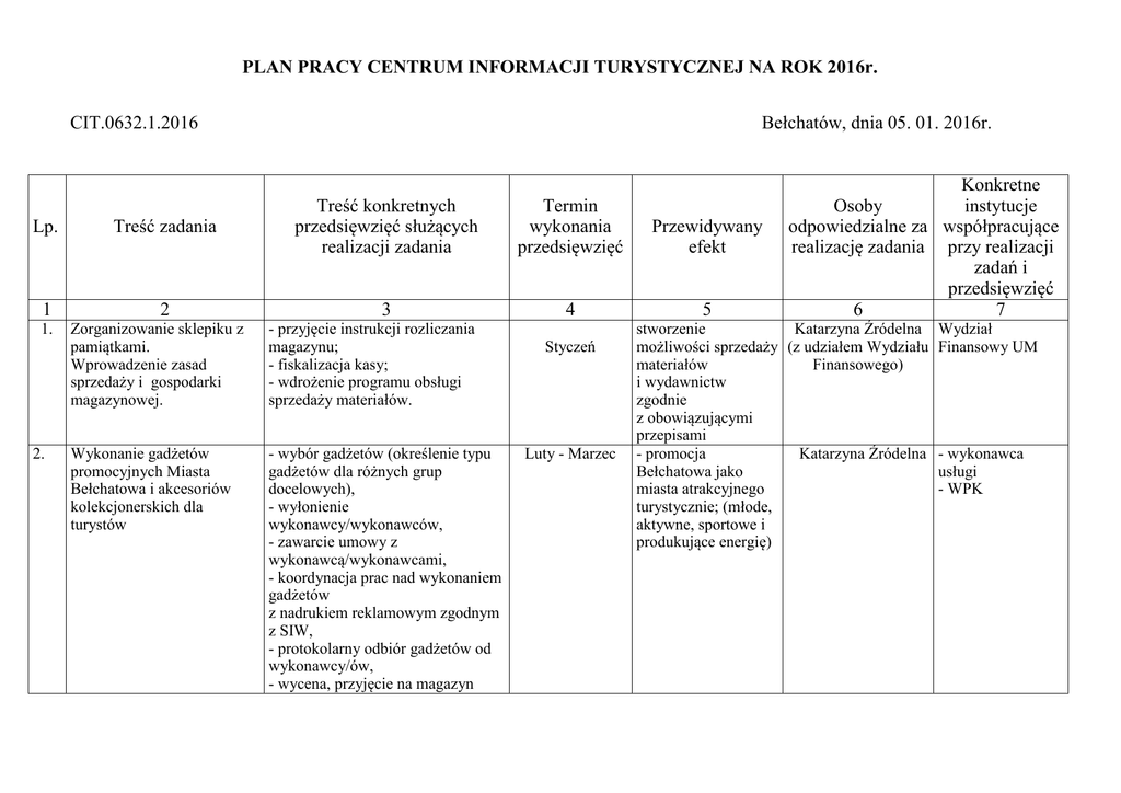 PLAN PRACY CENTRUM INFORMACJI TURYSTYCZNEJ NA ROK 2016r. CIT.0632.1.2016 Lp. 1 1. 2. Treść zadania 2 Bełchatów, dnia 05. 01. 2016r. Treść konkretnych przedsięwzięć służących realizacji zadania Termin wykonania przedsięwzięć 3 4 Zorganizowanie sklepiku z pamiątkami. Wprowadzenie zasad sprzedaży i gospodarki magazynowej. - przyjęcie instrukcji rozliczania magazynu; - fiskalizacja kasy; - wdrożenie programu obsługi sprzedaży materiałów. Wykonanie gadżetów promocyjnych Miasta Bełchatowa i akcesoriów kolekcjonerskich dla turystów - wybór gadżetów (określenie typu gadżetów dla różnych grup docelowych), - wyłonienie wykonawcy/wykonawców, - zawarcie umowy z wykonawcą/wykonawcami, - koordynacja prac nad wykonaniem gadżetów z nadrukiem reklamowym zgodnym z SIW, - protokolarny odbiór gadżetów od wykonawcy/ów, - wycena, przyjęcie na magazyn Styczeń Luty - Marzec Przewidywany efekt 5 Konkretne Osoby instytucje odpowiedzialne za współpracujące realizację zadania przy realizacji zadań i przedsięwzięć 6 7 stworzenie Katarzyna Źródelna możliwości sprzedaży (z udziałem Wydziału materiałów Finansowego) i wydawnictw zgodnie z obowiązującymi przepisami - promocja Katarzyna Źródelna Bełchatowa jako miasta atrakcyjnego turystycznie; (młode, aktywne, sportowe i produkujące energię) Wydział Finansowy UM - wykonawca usługi - WPK 3. Zaktualizowanie bazy turystycznej miasta. - zaktualizowanie bazy noclegowej; - zaktualizowanie bazy gastronomicznej; - zaktualizowanie bazy firm św. usł. turystyczne. 4. Opracowanie i wydruk folderu promującego Miasto Bełchatów oraz projekt i wydruk ulotek dedykowanych: dla seniora, dla rodziny, dla sportowców - opracowanie i aktualizacja materiałów tekstowych do folderu, - przeprowadzenie rozpoznania rynku na druk folderu, - zawarcie umów na druk ulotek, - przygotowanie projektu graficznego folderu i ulotek oraz przedłożenie do akceptacji Prezydenta, - druk folderu i ulotek - wycena, przyjęcie na magazyn 5. Założenie i opracowanie strony www. Turystyka Bełchatów - utworzenie subdomeny - projekt graficzny - zamieszczenie danych wraz z możliwością aktualizacji - możliwość wysłania elektronicznej pocztówki 6. Zaktualizowanie kart gminnej ewidencji innych obiektów, w których są świadczone usługi hotelarskie - przegląd i weryfikacja kart ewidencyjnych; - aktualizacja danych w papierowych i elektronicznych bazach danych. Luty Marzec Kwiecień Maj- Czerwiec Maj dysponowanie aktualnymi kontaktami bazy turystycznej miasta firmy świadczące Aleksandra usługi turystyczne Drzewosz, Arkadiusz Bełchatowa Cendrowski i okolic - wzmocnienie Katarzyna Źródelna, firma poligraficzna wizerunku miasta Aleksandra drukarnia; Bełchatowa Drzewosz, Arkadiusz firmy/instytucje; (dynamizm, pełne Cendrowski organizacje energii) zewnętrzne, wśród - ulotki dedykowane których zostanie pozwolą na dotarcie przeprowadzony do szerszego grona kolportaż folderu odbiorców i promocję oferty miasta - upowszechnianie wiedzy i informacji o atrakcjach w Bełchatowie w sieci Katarzyna Źródelna webmaster WPK aktualna ewidencja Pracownicy CIT WRM 7. Zaktualizowanie kart - przegląd kart ewidencyjnych gminnej ewidencji zabytków i korekta danych zgodnie nieruchomych z informacją Wojew. Konserwatora Zabytków i stanem faktycznym. 8. Opracowanie i wydanie mapy tras rowerowych miasta i powiatu 8. Utworzenie bloku - zgromadzenie danych informacyjnego o atrakcjach, - publikacja danych ciekawych miejscach, bazie turystycznej miast partnerskich. 9. Wydanie aktualnego Planu Miasta Bełchatowa w wersji kieszonkowej i książkowej (do wydzierania kart) - wybór firmy wydawniczej; - pozyskanie sponsorów; - opracowanie akt. planu z uwidocznionymi podmiotami turystycznymi. 10. Promocja miasta i turystyki poprzez sprzedaż i rozdawnictwo towarów i materiałów promocyjnych; informacyjnych. - pozyskiwanie atrakcyjnych towarów i materiałów promocyjnych; - sprzedaż i zorganizowane rozdawnictwo - aktualizacja tras rowerowych - projekt przewodnika - wydruk - wprowadzenie do sprzedaży Czerwiec Maj - czerwiec dysponowanie aktualnymi kontaktami bazy turystycznej miasta wypełnienie postanowień ustawy o ochronie zabytków promowanie turystyki rowerowej Pracownicy CIT Woj. Urząd Ochrony Zabytków Pracownicy CIT WIM, Starostwo Powiatowe Pracownicy CIT WPK wprowadzenie do obrotu aktualnego planu miasta Pracownicy CIT wybrana firma wydawnicza oraz właściwe wydziały UM i Starostwa poprawa wiedzy o tematyce turystycznej, społecznej, historycznej, gospodarczej o mieście i okolicach. Pracownicy CIT WPK; instytucje wydawnicze i pamiątkarskie. Lipiec - sierpień promowanie miast partnerskich i ich zasobów turystycznych Wrzesień StyczeńGrudzień