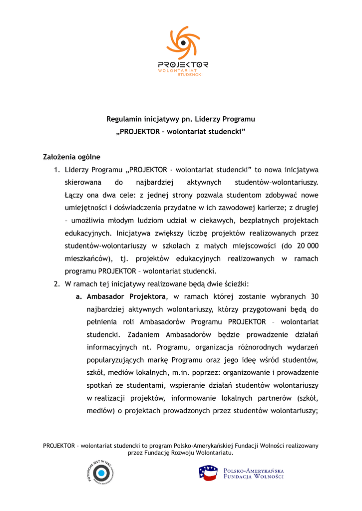 Regulamin inicjatywy pn. Liderzy Programu „PROJEKTOR