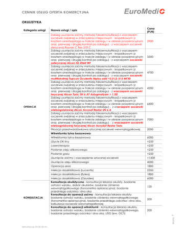 CENNIK USŁUG OFERTA KOMERCYJNA OKULISTYKA Kategoria usługi OPERACJE Nazwa usługi / opis Zabieg usunięcia zaćmy metodą fakoemulsyfikacji z wszczepem soczewki zwijalnej w znieczuleniu miejscowym - kropelkowym (z kosztem anestezjologa w trakcie zabiegu i w okresie pooperacyjnym oraz pierwszej i drugiej kontroli po zabiegu) - z wszczepem soczewki sferycznej Rayner C flex 570 C Zabieg usunięcia zaćmy metodą fakoemulsyfikacji z wszczepem soczewki zwijalnej w znieczuleniu miejscowym - kropelkowym (z kosztem anestezjologa w trakcie zabiegu i w okresie pooperacyjnym oraz pierwszej i drugiej kontroli po zabiegu) - z wszczepem soczewki asferycznej Alcon IQ SN60 WF Zabieg usunięcia zaćmy metodą fakoemulsyfikacji z wszczepem soczewki zwijalnej w znieczuleniu miejscowym - kropelkowym (z kosztem anestezjologa w trakcie zabiegu i w okresie pooperacyjnym oraz pierwszej i drugiej kontroli po zabiegu) - z wszczepem soczewki multifokalnej Topcon Oculentis Mplus add +3,0 LS-313 MF30 Zabieg usunięcia zaćmy metodą fakoemulsyfikacji z wszczepem soczewki zwijalnej w znieczuleniu miejscowym - kropelkowym (z kosztem anestezjologa w trakcie zabiegu i w okresie pooperacyjnym oraz pierwszej i drugiej kontroli po zabiegu) - z wszczepem soczewki torycznej Alcon Toric SN 6 AT Astygmatyzm > 1,5D Zabieg usunięcia zaćmy metodą fakoemulsyfikacji z wszczepem soczewki zwijalnej w znieczuleniu miejscowym - kropelkowym (z kosztem anestezjologa w trakcie zabiegu i w okresie pooperacyjnym oraz pierwszej i drugiej kontroli po zabiegu) - z wszczepem soczewki wieloogniskowej Alcon Acrysof Restor SN 6 A Zabieg usunięcia zaćmy metodą fakoemulsyfikacji z wszczepem soczewki zwijalnej w znieczuleniu miejscowym - kropelkowym (z kosztem anestezjologa w trakcie zabiegu i w okresie pooperacyjnym oraz pierwszej i drugiej kontroli po zabiegu) - z wszczepem soczewki wieloogniskowej torycznej Alcon Acrydof Restor Toric Fiksacja przeztwardówkowa sztucznej soczewki wewnątrzgałkowej Cena (PLN) 2900 3350 4700 4200 6400 7000 2000 Witrektomia tylna bezszwowa: 6000 Użycie DK-liny +250 Laseroterapia +250 Podanie oleju silikonowego +250 Podanie gazu +250 Usunięcie zaćmy i wszczepienie sztucznej soczewki +1500 Usunięcie oleju silikonowego 4000 Operacja zeza 1800 Iniekcja doszklistkowa (Lucentis) 2350 Iniekcja doszklistkowa (Eylea) 1800 Iniekcja doszklistkowa (Ozurdex) Konsultacja okulistyczna - konsultacja lekarza okulisty, badanie ostrości wzroku, dobór okularów, badanie ciśnienia wewnątrzgałkowego (tonometria aplanacyjna), badanie przedniego odcinka i dna oka Konsultacja do operacji zaćmy - konsultacja lekarza okulisty, badanie ostrości wzroku, badanie ciśnienia wewnątrzgałkowego (tonometria aplanacyjna), badanie przedniego odcinka i dna oka, kalkulacja soczewki wewnątrzgałkowej Konsultacja do operacji witrektomii - konsultacja lekarza okulisty, badanie ostrości wzroku, badanie ciśnienia wewnątrzgałkowego, badanie przedniego odcinka i dna oka, USG (ew. OCT) 6000 120 200 7 200 strona KONSULTACJA Witrektomia tylna bezszwowa aktualizacja 03.09.2014 r. CENNIK USŁUG OFERTA KOMERCYJNA Kategoria usługi Nazwa usługi / opis Cena (PLN) Konsultacja do iniekcji doszklistkowej - konsultacja lekarza okulisty, badanie ostrości wzroku, badanie ciśnienia wewnątrzgałkowego, badanie przedniego odcinka i dna oka, OCT, angiografia fluoresceinowa 200 Konsultacja do operacji p/jaskrowej - konsultacja lekarza okulisty , OCT N2 (OCT tarczy), badanie ciśnienia wewnątrzgałkowego, badania przedniego odcinka i dna oka, pole widzenia 200 Kontrola okulistyczna po iniekcji doszklistkowej - badanie kontrolne okulistyczne - konsultacja lekarza okulisty, badanie ostrości wzroku, ciśnienie wewnątrzgałkowe, badanie przedniego odcinka i dna oka, OCT Angiografia fluoresceinowa BADANIA DIAGNOSTYCZNE 180 OCT z opisem 1 oko/ 2 oczu 100 / 150 UBM 1 oko/ 2 oczu 100 / 150 Pole widzenia (perymetria) 1 oko/ 2 oczu 50 / 80 USG 1 oko/ 2 oczu 50 / 80 Pachymetria 1 oko/ 2 oczu 50 / 80 Wymaz z worka spojówkowego 60 Kwalifikacja do operacji Operacja skrzydlika z przeszczepem autologicznym spojówki i rąbka rogówki Entropion – podwinięcie powieki 120 Ektropion – odwinięcie powieki od 1500 Blefaroplastyka – operacja zwiotczenia skóry powiek Operacja zwiotczenia skóry powiek wraz z usunięciem przepukliny tłuszczu oczodołowego Ptoza – operacja opadnięcia powieki górnej od 1800 Ptoza brwiowa – operacja opadnięcia łuku brwiowego od 1300 Trichiasis - nieprawidłowy wzrost rzęs (leczenie krioterapią) od 600 Trichiasis – leczenie operacyjne od 1200 Kępki żółte – jedna powieka od 350 Gradówka 350 Kaszak, brodawka, włókniak (bez badania histopatologicznego) 400 Usunięcie guza powieki (z badaniem histopatologicznym) od 500 Usunięcie cysty okolicy pinktu łzowego z intubacją 700 Usunięcie guza spojówki z krioterapią od 800 Opieka anestezjologiczna od 250 Nieoperacyjne leczenie zeza (botox) 600 Kapsulofomia tylna w zaćmie wtórnej - Laser YAG 300 Laseroterapia siatkówki (1 etap) 150 Laseroterapia siatkówki (następne etapy) 150 od 1500 od 1800 od 2300 od 2500 strona 8 Drobne zabiegi okulistyczne 100 aktualizacja 03.09.2014 r.