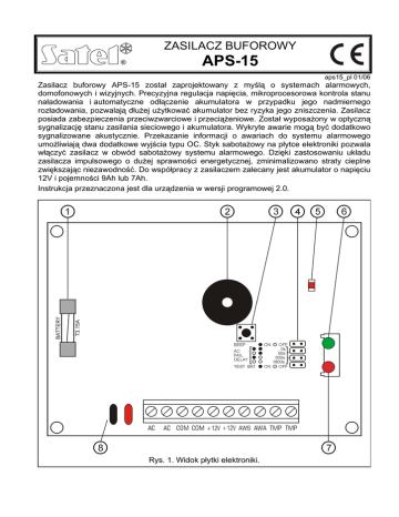 ZASILACZ BUFOROWY ® APS-15 aps15_pl 01/06 Zasilacz buforowy APS-15 został zaprojektowany z myślą o systemach alarmowych, domofonowych i wizyjnych. Precyzyjna regulacja napięcia, mikroprocesorowa kontrola stanu naładowania i automatyczne odłączenie akumulatora w przypadku jego nadmiernego rozładowania, pozwalają dłużej użytkować akumulator bez ryzyka jego zniszczenia. Zasilacz posiada zabezpieczenia przeciwzwarciowe i przeciążeniowe. Został wyposażony w optyczną sygnalizację stanu zasilania sieciowego i akumulatora. Wykryte awarie mogą być dodatkowo sygnalizowane akustycznie. Przekazanie informacji o awariach do systemu alarmowego umożliwiają dwa dodatkowe wyjścia typu OC. Styk sabotażowy na płytce elektroniki pozwala włączyć zasilacz w obwód sabotażowy systemu alarmowego. Dzięki zastosowaniu układu zasilacza impulsowego o dużej sprawności energetycznej, zminimalizowano straty cieplne zwiększając niezawodność. Do współpracy z zasilaczem zalecany jest akumulator o napięciu 12V i pojemności 9Ah lub 7Ah. Instrukcja przeznaczona jest dla urządzenia w wersji programowej 2.0. Rys. 1. Widok płytki elektroniki. 2 SATEL APS-15 Objaśnienia do rysunku 1: 1 – bezpiecznik T3.15A. Zabezpiecza obwód akumulatora. 1 – brzęczyk. Sygnalizuje awarie. 3 – styk sabotażowy. 4 – kołki do ustawiania parametrów pracy zasilacza. Symbol na płytce elektroniki oznacza założoną zworkę. Symbol oznacza zdjętą zworkę. Fabrycznie na wszystkie kołki są założone zworki. BEEP – włączenie / wyłączenie brzęczyka. Fabrycznie włączony. AC FAIL DELAY – określenie czasu, który musi upłynąć od momentu wystąpienia awarii zasilania AC, aby awaria ta została zasygnalizowana na wyjściu AWS (0, 60, 600 lub 1800 sekund). Fabrycznie 0 sekund. TEST BAT – włączenie / wyłączenie testu akumulatora. Fabrycznie włączony. 5 – dioda LED (czerwona). Świeci podczas ładowania akumulatora oraz testu stanu naładowania akumulatora. 6 – dioda LED AKUMULATOR (zielona). Sygnalizuje obecność akumulatora. 7 – dioda LED SIEĆ (czerwona). Sygnalizuje obecność napięcia zmiennego na zaciskach AC. 8 – przewody do podłączenia akumulatora (czerwony +; czarny -). Opis zacisków: AC - wejście zasilania (17...20V AC). Zaciski AC służą do podłączenia uzwojenia wtórnego transformatora sieciowego. COM - masa (0V). +12V - wyjścia zasilacza (13,6 - 13,8V DC). AWS - wyjście typu OC sygnalizujące brak napięcia zmiennego na wejściach AC lub awarię zasilania 230V. AWA - wyjście sygnalizujące przepalenie bezpiecznika T 3,15A na płytce elektroniki, niskie napięcie (rozładowanie) lub awarię akumulatora TMP - zaciski styku sabotażowego. 1. Instalacja Przed przystąpieniem do instalacji, należy sporządzić bilans obciążenia zasilacza. Suma prądów pobieranych przez odbiorniki oraz prądu ładowania akumulatora nie może przekroczyć wydajności zasilacza. Zasilacz powinien pracować z podłączeniem do zasilania sieciowego na stałe. W związku z tym, przed przystąpieniem do wykonania okablowania, należy zapoznać się z instalacją elektryczną obiektu. Do zasilania urządzenia należy wybrać obwód, w którym cały czas obecne będzie napięcie, obwód powinien być chroniony właściwym zabezpieczeniem. Przed dołączeniem urządzenia do obwodu, z którego będzie on zasilany, należy wyłączyć w tym obwodzie napięcie. W przypadku używania innej obudowy niż zalecana przez producenta, należy zastosować zasilacz sieciowy AC/AC typu 30VA/18V. 1. Zamontować obudowę zasilacza w wybranym miejscu i doprowadzić przewody połączeniowe. 2. Wyjąć bezpiecznik sieciowy umieszczony w plastikowej obudowie transformatora. APS-15 SATEL 3 3. Przewody zasilania ~230V podłączyć do zacisków AC 230V transformatora. Przewód uziemiający podłączyć do zacisku umieszczonego na tylnej ścianie metalowej obudowy, oznaczonego symbolem uziemienia . 4. Przy pomocy zamontowanych kabli doprowadzić napięcie wyjściowe z transformatora (nominalnie 18V AC) do zacisków AC płytki z elektroniką. 5. Podłączyć przewody odbiorników do złączy +12V i COM kostki zaciskowej na płytce zasilacza. 6. W razie potrzeby podłączyć wyjścia sygnalizacji awarii AWS i AWA do wejść centrali alarmowej. Wyjście sygnalizacyjne podczas prawidłowej pracy zasilacza jest zwarte do masy (0V), natomiast w przypadku wystąpienia awarii wyjście zostaje odcięte od masy. AWS 10k 3.9k 10R BC 847B AWS AWA 10k 3.9k 10R AWA BC 847B Rys. 2. Schematy wyjść AWS i AWA. 7. Przy pomocy zworek ustawić na kołkach oznaczonych AC FAIL DELAY czas, po którym na wyjściu AWS zostanie zasygnalizowana awaria sieci 230V. Możliwe czasy: 0 sekund – Kołki rozwarte Kołki zwarte 60 sekund – 600 sekund – 1800 sekund – 8. Na kołkach BEEP określić, czy brzęczyk ma być włączony (zworka założona), czy nie (zworka zdjęta). 9. Załączyć zasilanie 230V AC i włożyć bezpiecznik sieciowy umiejscowiony w osłonie transformatora (jeżeli wszystkie połączenia zostały wykonane poprawnie, to diody LED SIEĆ i AKUMULATOR powinny się zaświecić). 10. Po podłączeniu zasilacza można zmierzyć napięcie na kablach akumulatorowych. Wartość napięcia ustawiana jest w procesie produkcyjnym, wynosi 13,6 – 13,8V i nie należy jej zmieniać. 11. Podłączyć akumulator zgodnie z oznaczeniami (kolorami). Jeżeli akumulator jest rozładowany, to po około 4 minutach od załączenia zasilania 230V, zacznie migać zielona dioda LED (AKUMULATOR). W przypadku, gdy akumulator został podłączony po tym czasie (zielona dioda LED miga), to stan naładowania akumulatora będzie znany po wykonaniu kolejnego testu przez zasilacz - po około 12 minutach. W czasie testowania procesor obniża napięcie zasilacza do ok. 10,5V, a odbiorniki są zasilane z akumulatora. Kontrola stanu naładowania akumulatora odbywa się co 4 minuty przez czas kilkunastu sekund. Jeżeli napięcie akumulator