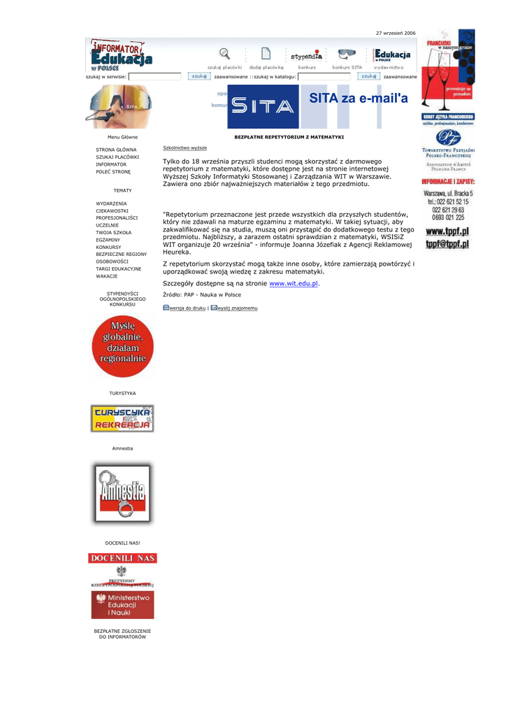 27 wrzesień 2006 zaawansowane ::szukaj w katalogu: szukaj w serwisie: Menu Główne STRONA GŁÓWNA SZUKAJ PLACÓWKI INFORMATOR POLEĆ STRONĘ zaawansowane BEZPŁATNE REPETYTORIUM Z MATEMATYKI Szkolnictwo wyższe Tylko do 18 września przyszli studenci mogą skorzystać z darmowego repetytorium z matematyki, które dostępne jest na stronie internetowej Wyższej Szkoły Informatyki Stosowanej i Zarządzania WIT w Warszawie. Zawiera ono zbiór najważniejszych materiałów z tego przedmiotu. TEMATY WYDARZENIA CIEKAWOSTKI PROFESJONALIŚCI UCZELNIE TWOJA SZKOŁA EGZAMINY KONKURSY BEZPIECZNE REGIONY OSOBOWOŚCI TARGI EDUKACYJNE WAKACJE "Repetytorium przeznaczone jest przede wszystkich dla przyszłych studentów, który nie zdawali na maturze egzaminu z matematyki. W takiej sytuacji, aby zakwalifikować się na studia, muszą oni przystąpić do dodatkowego testu z tego przedmiotu. Najbliższy, a zarazem ostatni sprawdzian z matematyki, WSISiZ WIT organizuje 20 września" - informuje Joanna Józefiak z Agencji Reklamowej Heureka. Z repetytorium skorzystać mogą także inne osoby, które zamierzają powtórzyć i uporządkować swoją wiedzę z zakresu matematyki. Szczegóły dostępne są na stronie www.wit.edu.pl. STYPENDYŚCI OGÓLNOPOLSKIEGO KONKURSU TURYSTYKA Amnestia DOCENILI NAS! BEZPŁATNE ZGŁOSZENIE DO INFORMATORÓW Źródło: PAP - Nauka w Polsce wersja do druku | wyslij znajomemu Konkurs Stypendialny 2006 Informator Drukowany Patron medialny: Wykonanie: Pasikonik Reklama i PR Uwagi: Webmaster Kontakt: Redakcja O Wydawcy