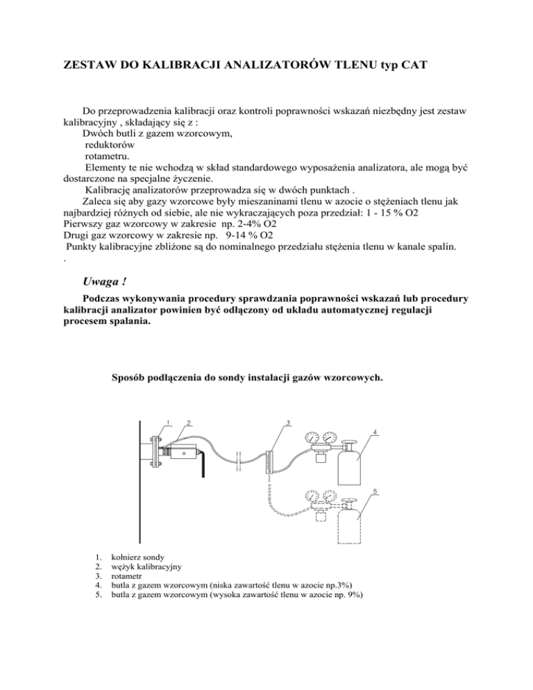ZESTAW DO KALIBRACJI ANALIZATORÓW TLENU typ CAT Do przeprowadzenia kalibracji oraz kontroli poprawności wskazań niezbędny jest zestaw kalibracyjny , składający się z : Dwóch butli z gazem wzorcowym, reduktorów rotametru. Elementy te nie wchodzą w skład standardowego wyposażenia analizatora, ale mogą być dostarczone na specjalne życzenie. Kalibrację analizatorów przeprowadza się w dwóch punktach . Zaleca się aby gazy wzorcowe były mieszaninami tlenu w azocie o stężeniach tlenu jak najbardziej różnych od siebie, ale nie wykraczających poza przedział: 1 - 15 % O2 Pierwszy gaz wzorcowy w zakresie np. 2-4% O2 Drugi gaz wzorcowy w zakresie np. 9-14 % O2 Punkty kalibracyjne zbliżone są do nominalnego przedziału stężenia tlenu w kanale spalin. . Uwaga ! Podczas wykonywania procedury sprawdzania poprawności wskazań lub procedury kalibracji analizator powinien być odłączony od układu automatycznej regulacji procesem spalania. Sposób podłączenia do sondy instalacji gazów wzorcowych. 1. 2. 3. 4. 5. kołnierz sondy wężyk kalibracyjny rotametr butla z gazem wzorcowym (niska zawartość tlenu w azocie np.3%) butla z gazem wzorcowym (wysoka zawartość tlenu w azocie np. 9%)