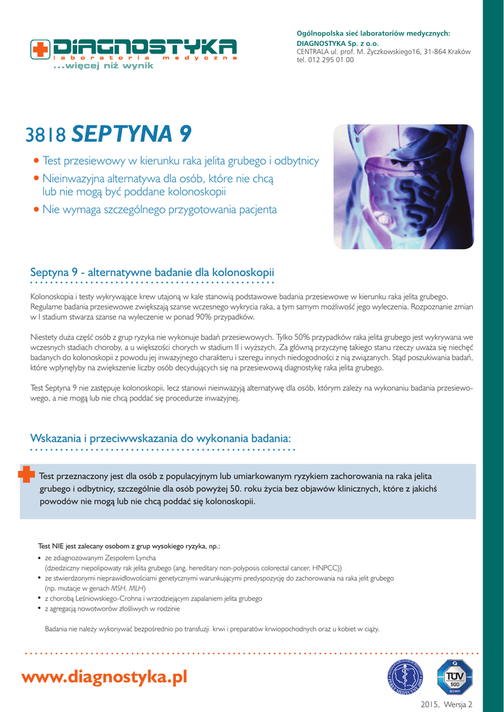 Ogólnopolska sieć laboratoriów medycznych: DIAGNOSTYKA Sp. z o.o. Centrala ul. prof. M. Życzkowskiego16, 31-864 Kraków tel. 012 295 01 00 3818 SEPTYNA 9 Test przesiewowy w kierunku raka jelita grubego i odbytnicy Nieinwazyjna alternatywa dla osób, które nie chcą lub nie mogą być poddane kolonoskopii Nie wymaga szczególnego przygotowania pacjenta Septyna 9 - alternatywne badanie dla kolonoskopii Kolonoskopia i testy wykrywające krew utajoną w kale stanowią podstawowe badania przesiewowe w kierunku raka jelita grubego. Regularne badania przesiewowe zwiększają szanse wczesnego wykrycia raka, a tym samym możliwość jego wyleczenia. Rozpoznanie zmian w I stadium stwarza szanse na wyleczenie w ponad 90% przypadków. Niestety duża część osób z grup ryzyka nie wykonuje badań przesiewowych. Tylko 50% przypadków raka jelita grubego jest wykrywana we wczesnych stadiach choroby, a u większości chorych w stadium II i wyższych. Za główną przyczynę takiego stanu rzeczy uważa się niechęć badanych do kolonoskopii z powodu jej inwazyjnego charakteru i szeregu innych niedogodności z nią związanych. Stąd poszukiwania badań, które wpłynęłyby na zwiększenie liczby osób decydujących się na przesiewową diagnostykę raka jelita grubego. Test Septyna 9 nie zastępuje kolonoskopii, lecz stanowi nieinwazyją alternatywę dla osób, którym zależy na wykonaniu badania przesiewowego, a nie mogą lub nie chcą poddać się procedurze inwazyjnej. Wskazania i przeciwwskazania do wykonania badania: Test przeznaczony jest dla osób z populacyjnym lub umiarkowanym ryzykiem zachorowania na raka jelita grubego i odbytnicy, szczególnie dla osób powyżej 50. roku życia bez objawów klinicznych, które z jakichś powodów nie mogą lub nie chcą poddać się kolonoskopii. Test NIE jest zalecany osobom z grup wysokiego ryzyka, np.: ze zdiagnozowanym Zespołem Lyncha (dziedziczny niepolipowaty rak jelita grubego (ang. hereditary non-polyposis colorectal cancer, HNPCC)) ze stwierdzonymi nieprawidłowościami genetycznymi warunkującymi predyspozycję do zachorowania na raka jelit grubego (np. mutacje w genach MSH, MLH) z chorobą Leśniowskiego-Crohna i wrzodziejącym zapalaniem jelita grubego z agregacją nowotworów złośliwych w rodzinie Badania nie należy wykonywać bezpośrednio po transfuzji krwi i preparatów krwiopochodnych oraz u kobiet w ciąży. www.diagnostyka.pl 2015, Wersja 2 Mutacja genu SEPT9 (Septyny 9) – genetyczny biomarker raka jelita grubego Gen SEPT9 jest genem regulującym proliferację komórek. Koduje białka: septyny, uczestniczące w podziałach komórek i pełniące funkcję supresora niekontrolowanego podziału komórek. Metylacja DNA promotora genu SEPT9 prowadzi do utraty kontroli wzrostu komórek i rozwoju nowotworu. We krwi chorych na raka jelita grubego odnotowuje się zwiększoną ilość wolnego, zmetylowanego DNA genu septyny 9, w porównaniu z osobami zdrowymi. Test służy do wykrywania obecności zmetylowanego DNA genu septyny 9 we krwi. Czułość i swoistość testu wynosi, odpowiednio: 71% i 99% dla wszystkich stadiów nowotworu, z najniższą czułością (52%) dla stadium I, i najwyższą (100%) – dla stadium IV. Laboratoria DIAGNOSTYKI oferują badanie wykonywane metodą real-time PCR (RT-PCR). Test posiada certyfikat CE-IVD (może być wykorzystywany do diagnostyki in vitro na terenie Unii Europejskiej). Interpretacja wyniku badania: Ujemny wynik testu Septyna 9 oznacza, że prawdopodobieństwo występowania raka jelita grubego i odbytnicy jest bardzo niskie. Test Septyna 9 należy powtarzać w regularnych odstępach czasu. Osobom z ujemnym wynikiem badania, bez niepokojących objawów, sugeruje się powtarzanie testu co 1-2 lata. U osób z dodatnim wynikiem testu prawdopodobieństwo choroby nowotworowej jest bardzo wysokie. Wynik dodatni stanowi przesłankę do kontynuowania diagnostyki, w tym kolonoskopii dla weryfikacji wyniki Testu Septyna 9. Piśmiennictwo: Potemski P. 2010. Onkologia w Praktyce Klinicznej. 2010:6:6: 283–289., Warren J.D i wsp. 2011. BMC Medicine.9:133- 1, Levin B. i wsp.2008. CA Cancer. J.Clin.58:3:130-160. Wykorzystano materiały informacyjne producenta testu: Abbott RealTime mS9 Colorectal Cancer. 2009., Lofton-Day C. i wsp.2008. Clin. Chem. 54:414, Grutzmann R. i wsp. 2008. PLoS ONE. 2008;3(11):e3759., DeVos T. i wsp. 2009. Clin.Chem.55:7:1337-1346 Szczegółowych informacji udzielają Przedstawiciele Medyczni DIAGNOSTYKI. KONTAKT Z DZIAŁEM OBSŁUGI KLIENTA DIAGNOSTYKI: www.diagnostyka.pl