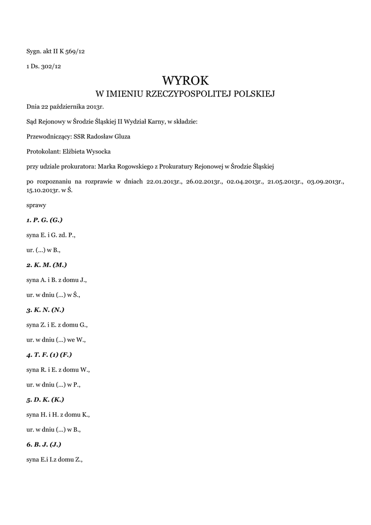 Sygn. akt II K 569/12 1 Ds. 302/12 WYROK W IMIENIU RZECZYPOSPOLITEJ POLSKIEJ Dnia 22 października 2013r. Sąd Rejonowy w Środzie Śląskiej II Wydział Karny, w składzie: Przewodniczący: SSR Radosław Gluza Protokolant: Elżbieta Wysocka przy udziale prokuratora: Marka Rogowskiego z Prokuratury Rejonowej w Środzie Śląskiej po rozpoznaniu na rozprawie w dniach 22.01.2013r., 26.02.2013r., 02.04.2013r., 21.05.2013r., 03.09.2013r., 15.10.2013r. w Ś. sprawy 1. P. G. (G.) syna E. i G. zd. P., ur. (...) w B., 2. K. M. (M.) syna A. i B. z domu J., ur. w dniu (...) w Ś., 3. K. N. (N.) syna Z. i E. z domu G., ur. w dniu (...) we W., 4. T. F. (1) (F.) syna R. i E. z domu W., ur. w dniu (...) w P., 5. D. K. (K.) syna H. i H. z domu K., ur. w dniu (...) w B., 6. B. J. (J.) syna E.i I.z domu Z., ur. w dniu (...) w Ś., 7. A. K. (1) (K.) syna K. i B. z domu K. ur. w dniu (...) w B. oskarżonych o to, że: I. w dniu 29 lutego 2012 r. w M., działając wspólnie i w porozumieniu, dopuścili się czynnej napaści na funkcjonariuszy Komendy Powiatowej Policji w Ś. sierż. R. M. i st. sierż. T. P., podczas i w związku z pełnieniem przez nich obowiązków służbowych w ten sposób, że w czasie przeprowadzonej przez w/w funkcjonariuszy policji interwencji domowej bili ich pięściami i kopali nogami po całym ciele, przy czym sierż. R. M. w wyniku napaści doznał stłuczenia głowy okolicy czołowo – ciemieniowej, rany okolicy czołowej, rany małżowiny usznej prawej, skręcenia kręgosłupa szyjnego, urazu nadgarstka lewego, stłuczenia uda lewego, stłuczenia karku i barku lewego, które to obrażenia naruszyły czynności narządów jego ciała na okres nie dłuższy niż siedem dni, zaś st. sierż. T. P. doznał obrażeń ciała w postaci urazu twarzoczaszki, stłuczenia okolicy jarzmowej prawej i policzka prawego, stłuczenia okolicy skroniowej lewej, skręcenia kręgosłupa szyjnego, rany śluzówki wargi górnej po stronie lewej, które to obrażenia naruszyły czynności jego ciała na okres nie dłuższy niż siedem dni, tj. o przestępstwo z art. 223 § 1 k.k. i art. 157 § 2 k.k. w zw. z art. 11 § 2 k.k.; a nadto K. N. oskarżonego o to, że: II. w dniu 28 lutego 2012 r. w L., podczas egzaminu na prawo jazdy, groził pobiciem egzaminatorowi K. S. (1), używając przy tym słów wulgarnych, przy czym groźba ta wzbudziła w pokrzywdzonym uzasadnioną obawę, że zostanie spełniona oraz czym jednocześnie znieważył egzaminatora K. S. (1), podczas i w związku z pełnieniem przez niego obowiązków służbowych, tj. o przestępstwo z art. 190 § 1 k.k. i art. 226 § 1 k.k. w zw. z art. 11 § 2 k.k.; orzeka: I. na podstawie art. 17 § 1 pkt 1 k.p.k. uniewinnia oskarżonych A. K. (1) i B. J. od zarzucanego im czynu, opisanego w pkt. I części wstępnej wyroku; II. uznaje oskarżonych K. N., K. M., D. K., P. G. i T. F. (1) za winnych tego, że w dniu 29 lutego 2012 r. w mieszkaniu przy ul. (...) w M., działając wspólnie i w porozumieniu oraz wspólnie i w porozumieniu z nieustalonymi osobami, dopuścili się czynnej napaści na funkcjonariuszy Komendy Powiatowej Policji w Ś. sierż. R. M. i st. sierż. T. P., podczas i w związku z pełnieniem przez nich obowiązków służbowych, w ten sposób, że w czasie przeprowadzonej przez w/w funkcjonariuszy policji interwencji, bili ich pięściami i kopali po całym ciele oraz zadawali ciosy pałką policyjną, tj. popełnienia przestępstwa z art. 223 § 1 k.k. i za to, na podstawie tego przepisu, wymierza każdemu z oskarżonych karę 1 (jednego) roku i 7 (siedmiu) miesięcy pozbawienia wolności; III. na podstawie art. 46 § 2 k.k. orzeka od oskarżonych K. N., K. M., D. K., P. G. i T. F. (1), nawiązki: - na rzecz pokrzywdzonego R. M., w wysokości po 1000 zł (tysiąc złotych), - na rzecz pokrzywdzonego T. P., w wysokości po 500 zł (pięćset złotych); IV. uznaje oskarżonego K. N. za winnego tego, że w dniu 28 lutego 2012r. w L., w trakcie egzaminu na prawo jazdy, znieważył egzaminatora z Wojewódzkiego Ośrodka Ruchu Drogowego w L. – K. S. (1), podczas i w związku z pełnieniem przez niego obowiązków służbowych, w ten sposób, że kierował pod jego adresem słowa wulgarne powszechnie uznane za obelżywe, tj. popełnienia przestępstwa z art. 226 § 1 k.k. i za to, na podstawie tego przepisu, wymierza mu karę 4 (czterech) miesięcy ograniczenia wolności, z obowiązkiem wykonywania nieodpłatnej, kontrolowanej pracy na cele społeczne, w wymiarze 30 (trzydziestu) godzin w stosunku miesięcznym; V. na podstawie art. 85 k.k., art. 86 § 1 k.k. i art. 87 k.k. łączy kary jednostkowe pozbawienia wolności i ograniczenia wolności wymierzone oskarżonemu K. N. w pkt II i IV części dyspozytywnej wyroku i wymierza mu karę łączną 1 (jednego) roku i 8 (ośmiu) miesięcy pozbawienia wolności; VI. na podstawie art. 69 § 1 i § 2 k.k. oraz art. 70 § 1 pkt 1 k.k. warunkowo zawiesza oskarżonemu T. F. (1) wykonanie wymierzonej mu kary pozbawienia wolności na okres 4 (czterech) lat próby; VII. na podstawie art. 71 § 1 k.k. wymierza oskarżonemu T. F. (1) karę grzywny w wysokości 270 (dwustu siedemdziesięciu) stawek dziennych, ustalając wysokość jednej stawki dziennej grzywny na kwotę 10 zł (dziesięciu złotych); VIII. na podstawie art. 63 § 1 k.k. zalicza oskarżonym K. N., P. G., K. M. i D. K., na poczet wymierzonych im kar pozbawienia wolności, okresy ich rzeczywistego pozbawienia wolności w sprawie: 1. K. N., od dnia 29.02.2012r. do dnia 25.09.2012r., 2. P. G., od dnia 14.08.2012r. do dnia 27.10.2012r., 3. K. M., od dnia 29.02.2012r. do dnia 25.05.2012r., 4. D. K., od dnia 29.02.2012r. do dnia 11.06.2012r.; IX. na podstawie art. 63 § 1 k.k. zalicza oskarżonemu T. F. (1), na poczet wymierzonej mu kary grzywny, okres jego rzeczywistego pozbawienia wolności w sprawie od dnia 29.02.2012r. do dnia 13.09.2012r., co odpowiada 270 stawkom dziennym orzeczonej kary grzywny; X. na podstawie art. 29 ust. 1