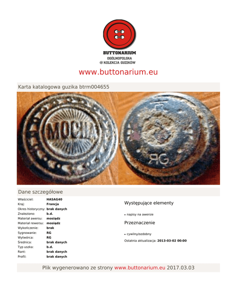 www.buttonarium.eu Karta katalogowa guzika btrm004655 Dane szczegółowe Właściciel: HASAG40 Kraj: Francja Występujące elementy Okres historyczny: brak danych Znaleziono: b.d. Materiał awersu: mosiądz Materiał rewersu: mosiądz Wykończenie: brak Sygnowanie: RG Wytwórca: RG Średnica: brak danych Typ uszka: b.d. Rant: brak danych Profil: brak danych ● napisy na awersie Przeznaczenie ● cywilny/ozdobny Ostatnia aktualizacja: 2013-03-02 00:00 Plik wygenerowano ze strony www.buttonarium.eu 2017.03.03 Opis guzika btrm004655 Guzik z napisem MOCHA na awersie, rewers sygnowany: (znak graficzny zawierający literę T) (motyw geometryczny) RG - litera R zwrócona w lewą stronę (motyw geometryczny). Jest to guzik wyprodukowany przez firmę Raymond (obecnie A Raymond, czyli AlbertPierre Raymond) z Grenoble, miejscowości we francuskich Alpach. Litery RG mogą oznaczać Raymond Grenoble lub Raymond Güttin współwłaściciel firmy w początkowym okresie (1865-1892). Firma została założona w 1865 roku i istnieje do dzisiaj, jej obiektem zainteresowania są różnego rodzaju produkty do mocowania i łączenia (w tym guziki i zatrzaski). Firma znana jest m.in. w motoryzacji, medycynie, budownictwie, rolnictwie, energetyce i przemyśle. W 1995 roku otworzono punkty sprzedaży wyrobów firmy Raymond w Polsce. Mottem firmy jest: more than fastening, czyli więcej niż mocowanie. Wytwórca: RG Opis tego wytwórcy jest jeszcze w trakcie opracowania. Plik wygenerowano ze strony www.buttonarium.eu 2017.03.03