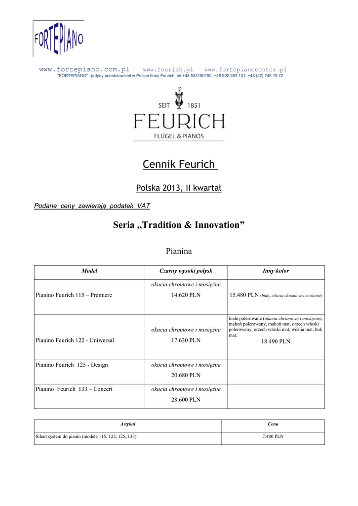 www.fortepiano.com.pl www.feurich.pl www.fortepianocenter.pl "FORTEPIANO" – jedyny przedstawiciel w Polsce firmy Feurich tel.+48 533150190 +48 502 383 101 +48 (22) 746 19 72 Cennik Feurich Polska 2013, II kwartał Podane ceny zawierają podatek VAT Seria „Tradition & Innovation” Pianina Czarny wysoki połysk Model Inny kolor okucia chromowe i mosiężne Pianino Feurich 115 – Premiere 14.620 PLN okucia chromowe i mosiężne Pianino Feurich 122 - Uniwersal 17.630 PLN 15.480 PLN (biały, okucia chromowe i mosiężne) białe polerowane (okucia chromowe i mosiężne), mahoń polerowany, mahoń mat, orzech włoski polerowany, orzech włoski mat, wiśnia mat, buk mat. 18.490 PLN okucia chromowe i mosiężne Pianino Feurich 125 - Design 20.680 PLN Pianino Feurich 133 – Concert okucia chromowe i mosiężne 28.600 PLN Artykuł Silent system do pianin (modele 115, 122, 125, 133) Cena 7.480 PLN Fortepiany Model Czarny wysoki połysk Czarny wysoki połysk wersja mosiądz wersja chrom Biały wysoki połysk Inny kolor biały polerowany (okucia mosiądz), mahoń polerowany, orzech mat wersja chrom Feurich Grand 161 - Professional I 43.560 PLN 46.596 PLN 44.396 PLN 45.760 PLN wersja chrom Feurich Grand 178 - Professional II 51.920 PLN 54.956 PLN 52.756 PLN 54.120 PLN wersja chrom Feurich Grand 218 – Concert I 87.560 PLN 92.840 PLN 88.440 PLN 91.960 PLN wersja mosiądz 91.960 PLN Artykuł Cena Pedał harmoniczny (czwarty ) do modeli Grand 161, Grand 178, Grand 218 6.600 PLN Silent system do fortepianów (modele 161, 178, 218) 17.600 PLN Seria „Feurich Ree Premium” Pianina Czarny wysoki połysk Model okucia chromowe i mosiężne Pianino Feurich 122 - Uniwersal 33.540 PLN Inny kolor białe polerowane (okucia chromowe i mosiężne), mahoń polerowany, mahoń mat, orzech włoski polerowany, orzech włoski mat, wiśnia mat, buk mat. 34.400 PLN okucia chromowe i mosiężne Pianino Feurich 125 - Design 36.120 PLN Pianino Feurich 133 – Concert okucia chromowe i mosiężne 43.860 PLN Artykuł Silent system do pianin (modele 115, 122, 125, 133) Cena 7.480 PLN Fortepiany Model Czarny wysoki połysk Czarny wysoki połysk wersja mosiądz wersja chrom Inny kolor Biały wysoki połysk biały polerowany (okucia mosiądz), mahoń polerowany, orzech mat wersja chrom Feurich Grand 161 - Professional I 74.820 PLN 75.637 PLN 77.787 PLN 76.970 PLN wersja chrom Feurich Grand 178 - Professional II 79.120 PLN 79.937 PLN 82.087 PLN 81.270 PLN wersja chrom Feurich Grand 218 – Concert I 117.820 PLN 118.680 PLN 122.980 PLN wersja mosiądz 122.120 PLN Artykuł Cena Pedał harmoniczny (czwarty ) do modeli Grand 161, Grand 178, Grand 218 6.600 PLN Silent system do fortepianów (modele 161, 178, 218) 17.600 PLN Akcesoria Artykuł Cena Ława fortepianowa z regulowaną wysokością z pokryciem ze skaju lub weluru (różne kolory) 546 PLN Ława fortepianowa z regulowaną wysokością z pokryciem ze skaju z pojemnikiem na nuty (kolor czarny) 774 PLN Wysokiej klasy ława fortepianowa z pokryciem z jagnięcej skóry (kolor biały, mahoń i czarny) 1.230 PLN Pokrowiec na pianino Feurich model 115 900 PLN Pokrowiec na pianino Feurich model 122/125/133 905 PLN Pokrowiec na fortepian Feurich model 161 910 PLN Pokrowiec na fortepian Feurich model 178 946 PLN Pokrowiec na fortepian Feurich model 218 1.505 PLN System blokujący do pokrowców 774 PLN Podstawki pod kółka pianin 11 PLN Podstawki pod kółka fortepianów 20 PLN Podnóżek z pedałami dla dzieci 770 PLN 5 LAT GWARANCJI SERWIS RATY LEASING Firmy “Fortepiano” i Feurich mają nadzieję na satysfakcjonującą współpracę