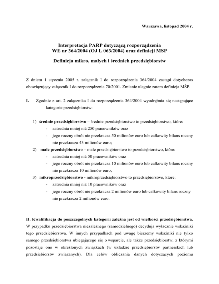 Warszawa, listopad 2004 r. Interpretacja PARP dotyczącą rozporządzenia WE nr 364/2004 (OJ L 063/2004) oraz definicji MSP Definicja mikro, małych i średnich przedsiębiorstw Z dniem 1 stycznia 2005 r. załącznik I do rozporządzenia 364/2004 zastąpi dotychczas obowiązujący załącznik I do rozporządzenia 70/2001. Zmianie ulegnie zatem definicja MŚP. I. Zgodnie z art. 2 załącznika I do rozporządzenia 364/2004 wyodrębnia się następujące kategorie przedsiębiorstw: 1) średnie przedsiębiorstwo – średnie przedsiębiorstwo to przedsiębiorstwo, które: - zatrudnia mniej niż 250 pracowników oraz - jego roczny obrót nie przekracza 50 milionów euro lub całkowity bilans roczny nie przekracza 43 milionów euro; 2) małe przedsiębiorstwo – małe przedsiębiorstwo to przedsiębiorstwo, które: - zatrudnia mniej niż 50 pracowników oraz - jego roczny obrót nie przekracza 10 milionów euro lub całkowity bilans roczny nie przekracza 10 milionów euro; 3) mikroprzedsiębiorstwo - mikroprzedsiębiorstwo to przedsiębiorstwo, które: - zatrudnia mniej niż 10 pracowników oraz - jego roczny obrót nie przekracza 2 milionów euro lub całkowity bilans roczny nie przekracza 2 milionów euro. II. Kwalifikacja do poszczególnych kategorii zależna jest od wielkości przedsiębiorstwa. W przypadku przedsiębiorstwa niezależnego (samodzielnego) decydują wyłącznie wskaźniki tego przedsiębiorstwa. W innych przypadkach pod uwagę bierzemy wskaźniki nie tylko samego przedsiębiorstwa ubiegającego się o wsparcie, ale także przedsiębiorstw, z którymi pozostaje ono w określonych związkach (w układzie przedsiębiorstw partnerskich lub przedsiębiorstw związanych). Dla celów obliczania danych dotyczących poziomu zatrudnienia oraz danych finansowych rozróżnia się przedsiębiorstwa: niezależne, partnerskie i związane. 1. Przedsiębiorstwo niezależne (samodzielne) to przedsiębiorstwo, które nie ma żadnych przedsiębiorstw partnerskich ani związanych - przedsiębiorstwo, o którym mowa w art. 3 ust. 1, a także przedsiębiorstwo, o którym mowa w art. 3 ust. 2 akapit drugi. 2. Przedsiębiorstwa partnerskie to przedsiębiorstwa, które nie są przedsiębiorstwami związanymi i które pozostają w następującym wzajemnym związku: przedsiębiorstwo posiada samodzielnie lub wspólnie z jednym lub kilkoma przedsiębiorstwami związanymi (patrz poniżej pkt 3), 25% lub więcej kapitału lub praw głosu w drugim przedsiębiorstwie. Wyjątek od powyższej reguły - rozporządzenie w art. 3 ust. 2 akapit drugi załącznika I uznaje jednak za samodzielne przedsiębiorstwa, w których powyższa wartość 25% została osiągnięta lub przekroczona przez następujące podmioty: 1) publiczne korporacje inwestycyjne, spółki kapitałowe podwyższonego ryzyka, osoby fizyczne lub grupy osób prowadzące regularną działalność inwestycyjną podwyższonego ryzyka, które inwestują kapitał własny w firmy nienotowane na giełdzie, pod warunkiem że cała kwota inwestycji tych inwestorów w to samo przedsiębiorstwo nie przekroczy 1 250 000 euro; 2) uniwersytety1 lub niedochodowe ośrodki badawcze2; 3) inwestorów instytucjonalnych3 łącznie z regionalnymi funduszami rozwoju; 4) samorządy lokalne z rocznym budżetem nie przekraczającym 10 milionów euro oraz liczbą mieszkańców poniżej 5 000 - jeżeli podmioty te nie są związane, indywidualnie lub wspólnie, z przedsiębiorstwem, w którym posiadają 25% lub więcej kapitału lub prawa głosu. 1 należy rozumieć szerzej - uczelnie; typu non profit, czyli nie działające dla zysku; 3 pod tym pojęciem należy rozumieć podmioty, które nie prowadzą działalności gospodarczej za pośrednictwem posiadanych przedsiębiorstw na zasadzie powiązania spółka-matka – spółki –córki, co prowadziłoby w rezultacie do korzystania z pomocy publicznej dla MŚP przez duże przedsiębiorstwa nie mieszczące się w definicji MŚP. Inwestorzy instytucjonalni to podmioty, które posiadają pozycje kapitałowe w wielu przedsiębiorstwach (akcje/ udziały/prawa głosu) w spółkach, ale nie w celu prowadzenie poprzez nie działalności gospodarczej, ale w ramach. zarządzania środkami finansowymi. W tej kategorii mieścić się będą np. fundusze inwestycyjne, fundusze emerytalne; 2 3. Przedsiębiorstwa związane to przedsiębiorstwa, które pozostają w jednym z poniższych związków: 1) przedsiębiorstwo posiada większość praw głosu w innym przedsiębiorstwie; lub 2) przedsiębiorstwo posiada prawo do powoływania lub odwoływania większości członków organu administracyjnego, zarządzającego lub nadzorczego innego przedsiębiorstwa; lub 3) przedsiębiorstwo posiada dominujący wpływ na działalność innego przedsiębiorstwa (wpływ dominujący nie istnieje, jeżeli podmioty wymienione w art. 3 ust. 2 akapit drugi załącznika I nie angażują się bezpośrednio lub pośrednio w zarządzanie przedsiębiorstwem)lub; 4) przedsiębiorstwo kontroluje większość praw głosu w innym przedsiębiorstwie. Za przedsiębiorstwa związane uważa się przedsiębiorstwa pozostające w takim związku z: 1) jednym lub kilkoma przedsiębiorstwami; 2) podmiotami, o których mowa w art. 3 ust. 2 akapit drugi załącznika I; 3) osobą fizyczną lub grupą osób fizycznych działających wspólnie, jeżeli wykonują swoją działalność lub część swojej działalności na tym samym odpowiadającym rynku lub rynkach pokrewnych. UWAGA ! Z kategorii MŚP wyłączone są przedsiębiorstwa, których 25% lub więcej kapitału lub praw głosu jest kontrolowane bezpośrednio lub pośrednio, wspólnie lub indywidualnie przez jedno lub kilka organów państwowych4. Wyłączenie to nie dotyczy to sytuacji, gdy ta wartość progowa zostanie osiągnięta lub przekroczona przez podmioty, o których mowa w art. 3 ust. 2 akapit drugi załącznika I, jeżeli podmioty te nie są związane, indywidualnie lub wspólnie z przedsiębiorstwem, w który