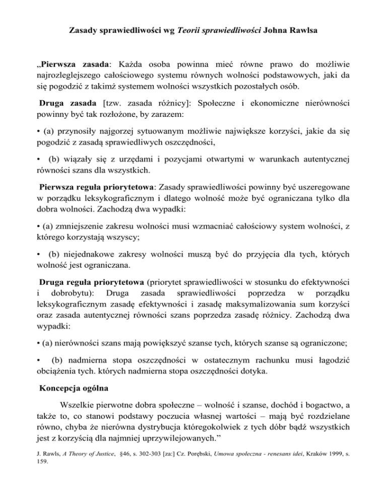 Zasady sprawiedliwości wg Teorii sprawiedliwości Johna Rawlsa „Pierwsza zasada: Każda osoba powinna mieć równe prawo do możliwie najrozleglejszego całościowego systemu równych wolności podstawowych, jaki da się pogodzić z takimż systemem wolności wszystkich pozostałych osób. Druga zasada [tzw. zasada różnicy]: Społeczne i ekonomiczne nierówności powinny być tak rozłożone, by zarazem: • (a) przynosiły najgorzej sytuowanym możliwie największe korzyści, jakie da się pogodzić z zasadą sprawiedliwych oszczędności, • (b) wiązały się z urzędami i pozycjami otwartymi w warunkach autentycznej równości szans dla wszystkich. Pierwsza reguła priorytetowa: Zasady sprawiedliwości powinny być uszeregowane w porządku leksykograficznym i dlatego wolność może być ograniczana tylko dla dobra wolności. Zachodzą dwa wypadki: • (a) zmniejszenie zakresu wolności musi wzmacniać całościowy system wolności, z którego korzystają wszyscy; • (b) niejednakowe zakresy wolności muszą być do przyjęcia dla tych, których wolność jest ograniczana. Druga reguła priorytetowa (priorytet sprawiedliwości w stosunku do efektywności i dobrobytu): Druga zasada sprawiedliwości poprzedza w porządku leksykograficznym zasadę efektywności i zasadę maksymalizowania sum korzyści oraz zasada autentycznej równości szans poprzedza zasadę różnicy. Zachodzą dwa wypadki: • (a) nierówności szans mają powiększyć szanse tych, których szanse są ograniczone; • (b) nadmierna stopa oszczędności w ostatecznym rachunku musi łagodzić obciążenia tych. których nadmierna stopa oszczędności dotyka. Koncepcja ogólna Wszelkie pierwotne dobra społeczne – wolność i szanse, dochód i bogactwo, a także to, co stanowi podstawy poczucia własnej wartości – mają być rozdzielane równo, chyba że nierówna dystrybucja któregokolwiek z tych dóbr bądź wszystkich jest z korzyścią dla najmniej uprzywilejowanych.” J. Rawls, A Theory of Justice, §46, s. 302-303 [za:] Cz. Porębski, Umowa społeczna - renesans idei, Kraków 1999, s. 159.