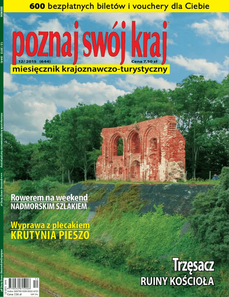 600 bezpłatnych biletów i vouchery dla Ciebie 12 / 2015 (644) 12/ 2015 (644) Cena 7,50 zł miesięcznik krajoznawczo-turystyczny www. poznaj-swoj-kraj .pl Rowerem na weekend nadmorskim szlakiem Wyprawa z plecakiem Krutynia pieszo 12/ 2015 (644) [email protected] Trzęsacz 12 9 770032 615206 Index 369799 ISSN 0032-6151 Cena 7,50 zł VAT 5% ruiny koŚcioła Prenumerata Redakcyjna 2016 Prenumerata 2016 wysyłka pocztą ekonomiczną priorytetową 60 zł 68 zł Prenumerata 2016 zabezpieczona przed pogięciem i zalaniem wysyłka pocztą ekonomiczną priorytetową 72 zł 80 zł Prenumerata 2016 Prenumerata 2016 elektroniczna zagraniczna 159 zł (2 egz. 219 zł) 49 zł Rocznik 2015– 60 zł komplet, 12 wydań Rocznik 2014 – 35 zł Rocznik 2013 – 38 zł Rocznik 2012 – 19 zł Rocznik 2011– 29 zł Rocznik 2010 – 19 zł Rocznik 2009 – 19 zł Rocznik 2008 – 19 zł Rocznik 2007 – 19 zł 9 wydań, bez numeru 1-3 komplet, 4 wydania komplet, 11 wydań komplet, 4 wydania komplet, 4 wydania komplet, 4 wydania komplet, 7 wydań komplet, 4 wydania Wprowadziliśmy możliwość wysyłki prenumeraty za pobraniem, czyli płatności u listonosza. Polega ona na tym, że pierwszą przesyłkę wysyłamy tym właśnie sposobem, a konkretnie tzw. „Paczką24”, za którą trzeba będzie zapłacić listonoszowi 75 zł. Pozostałe numery będziemy wysyłać pocztą zwykłą, chyba, że ktoś dopłaci za tzw. „priorytet”. Wówczas cena tej usługi będzie wynosić 82 zł. Wszystkie podane tu ceny obejmują również koszt wysyłki listem zwykłym ekonomicznym, a przesyłki gabarytowe i te o ciężarze większym od pół kilograma, listem poleconym. Wszystkie przesyłki polecone zabezpieczamy przed uszkodzeniem i zalaniem. Dziś nie publikujemy jak zwykle listy Obiektów Rekomendowanych. Jesteśmy w trakcie weryfikacji uzgodnień z każdym dotychczasowym Partnerem tej akcji. Na dziś wiemy na pewno, że działać będziemy ze Schroniskiem na Śnieżniku, Schroniskiem na Przełęczy Okraj i Schroniskiem Orzeł w Górach Sowich. Prawdopodobnie będziemy kontynuować współpracę z pozostałymi Obiektami, być może przybędą nowe. Przyszłość pokaże. Nową listę opublikujemy w następnym numerze. Karta Prenumeratora – Regulamin Imienna Karta Prenumeratora z indywidualnym numerem to dowód tego, że osoba, na którą Karta jest wystawiona jest naszym Redakcyjnym Prenumeratorem. Karta upoważnia do szeregu korzyści. 1. Brania udziału w konkursie „Znasz-li ten kraj” 2. B rania udziału w klasyfikacji rocznej dla konkursów „Znasz-li ten kraj” oraz „Fotozagadka” 3. Brania udziału w programie „Poznaj Taniej” czyli: a) losowaniu bezpłatnych wejściówek/voucherów dla Prenumeratorów b) udziału w konkursach tylko dla Prenumeratorów 4. Otrzymaniu bezpłatnych wejściówek/voucherów za a) ufundowanie prenumeraty szkole, bibliotece b) udział w Imprezach Patronackich Poznaj Swój Kraj c) noclegi w naszych Obiektach Rekomendowanych, niezależnie od otrzymywanych tam zniżek 5. Zniżki w wysokości 30% na nocleg w naszych Obiektach Rekomendowanych. 6. Zakupów ze zniżką na portalu www.poznaj-swoj-kraj.pl 7. Udziału w innych konkursach organizowanych tylko dla Prenumeratorów. Karta Główna dla osoby opłacającej prenumeratę jest bezpłatna. Istnieje możliwość otrzymania odpłatnie dodatkowej Karty dla współmałżonka lub jednego dziecka. Koszt dodatkowej Karty wynosi tyle, co jeden egzemplarz „Poznaj swój kraj”, na dziś to 7,50zł. Karta jest własnością "Poznaj Swój Kraj" sp. z o.o. i może być unieważniona bez podania przyczyny. Karta jest imienna, ważna z Dowodem Osobistym. Przywileje korzystania z Karty przysługują jedynie jej posiadaczowi. Każdy członek rodziny Prenumeratora może ubiegać się o Kartę Dodatkową, która gwarantuje identyczne przywileje, co Karta Główna. Karta Dodatkowa jest płatna, jej cena równa jest cenie jednego numeru Miesięcznika. Karta upoważnia do korzystania z 30% zniżki w Obiektach Rekomendowanych Poznaj Swój Kraj, zakupów ze zniżką na portalu www.poznaj-swoj-kraj.pl a także korzystania z programów lojalnościowych i innych Poznaj Swój Kraj. Regulamin karty na Karta ważna do 31 stycznia 2017 r. Poznaj Swój Kraj sp. z o.o. 01-445 Warszawa, ul. Ciołka 17 biuro@poznaj-swój-kraj.pl tel. 22-299-70-74 Fotozagadka Co to za obiekt? Odpowiedzi prosimy przysyłać do 24. maja br. na kartkach pocztowych z numerem Karty Prenumeratora na adres: Redakcja „Poznaj swój kraj”, 01-445 Warszawa, ul. Ciołka 17. Można wysyłać odpowiedzi również na adres: [email protected] podając numer Karty Prenumeratora. Wśród autorów prawidłowych odpowiedzi rozlosujemy nagrody. Odpowiedzi do każdego konkursu prosimy przysyłać w oddzielnych emailach lub na oddzielnych kartkach w jednym liście. To nam znakomicie ułatwi segregację i zmniejszy prawdopodobieństwo błędnego zaszeregowania odpowiedzi. Na widokówki czy kartki pocztowe czekamy od tych z Państwa, którzy biorą udział tylko w jednym z konkursów. N Moi mili owy sezon turystyczny przed nami. Znów wyjedziemy w góry, nad morze, nad jeziora. Zwiedzimy nowe zamki, ruiny, miasta, muzea. Poznamy nowe trasy rowerowe, szlaki górskie, przepłyniemy kajakiem nowe rzeki. Długi weekend majowy otwiera letni sezon. I my więc zapraszamy na szlaki. Ponownie rowerem nad morze, tym razem wzdłuż całego wybrzeża, od Świnoujścia do Krynicy Morskiej, piechurów zapraszamy na szlak (prawie) wzdłuż Krutyni. I cóż, że ta rzeka kojarzy się wszystkim ze spływami? Jak się okazuje, ciekawa jest również w „wersji pieszej”. Miłośników zamków i ruin zapraszamy do Sosnowca. Tam w nietypowym sąsiedztwie, wśród bloków i sklepów stoi sobie ...średniowieczny zamek. Warto zajrzeć do muzeum Kossaków na Śląsku, a będąc tam, zjechać 355 metrów pod ziemię w kopalni-muzeum Guido w Zabrzu. Kto dawno nie był w Bydgoszczy – niech zrobi sobie tam wycieczk