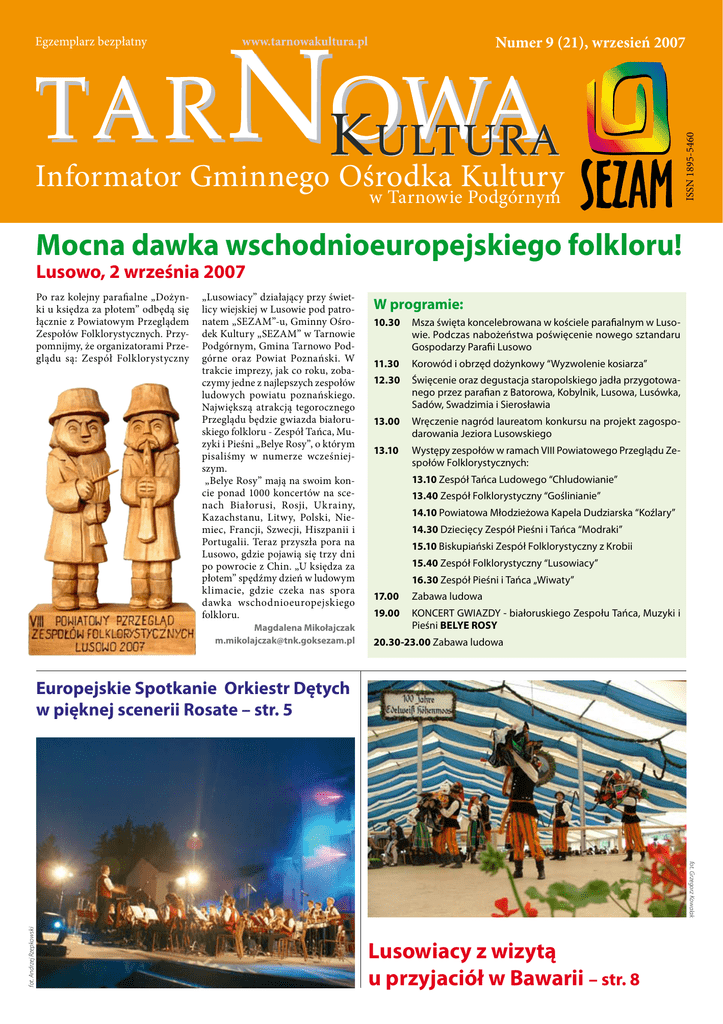 Numer 9 (21), wrzesień 2007 www.tarnowakultura.pl Informator Gminnego Ośrodka Kultury w Tarnowie Podgórnym ISSN 1895-5460 Egzemplarz bezpłatny Mocna dawka wschodnioeuropejskiego folkloru! Lusowo, 2 września 2007 Po raz kolejny parafialne „Dożynki u księdza za płotem” odbędą się łącznie z Powiatowym Przeglądem Zespołów Folklorystycznych. Przypomnijmy, że organizatorami Przeglądu są: Zespół Folklorystyczny „Lusowiacy” działający przy świetlicy wiejskiej w Lusowie pod patronatem „SEZAM”-u, Gminny Ośrodek Kultury „SEZAM” w Tarnowie Podgórnym, Gmina Tarnowo Podgórne oraz Powiat Poznański. W trakcie imprezy, jak co roku, zobaczymy jedne z najlepszych zespołów ludowych powiatu poznańskiego. Największą atrakcją tegorocznego Przeglądu będzie gwiazda białoruskiego folkloru - Zespół Tańca, Muzyki i Pieśni „Belye Rosy”, o którym pisaliśmy w numerze wcześniejszym. „Belye Rosy” mają na swoim koncie ponad 1000 koncertów na scenach Białorusi, Rosji, Ukrainy, Kazachstanu, Litwy, Polski, Niemiec, Francji, Szwecji, Hiszpanii i Portugalii. Teraz przyszła pora na Lusowo, gdzie pojawią się trzy dni po powrocie z Chin. „U księdza za płotem” spędźmy dzień w ludowym klimacie, gdzie czeka nas spora dawka wschodnioeuropejskiego folkloru. Magdalena Mikołajczak [email protected] W programie: 10.30 M sza święta koncelebrowana w kościele parafialnym w Lusowie. Podczas nabożeństwa poświęcenie nowego sztandaru Gospodarzy Parafii Lusowo 11.30 Korowód i obrzęd dożynkowy “Wyzwolenie kosiarza” 12.30 Ś więcenie oraz degustacja staropolskiego jadła przygotowanego przez parafian z Batorowa, Kobylnik, Lusowa, Lusówka, Sadów, Swadzimia i Sierosławia 13.00 W ręczenie nagród laureatom konkursu na projekt zagospodarowania Jeziora Lusowskiego 13.10 W ystępy zespołów w ramach VIII Powiatowego Przeglądu Zespołów Folklorystycznych: 13.10 Zespół Tańca Ludowego “Chludowianie” 13.40 Zespół Folklorystyczny “Goślinianie” 14.10 Powiatowa Młodzieżowa Kapela Dudziarska “Koźlary” 14.30 Dziecięcy Zespół Pieśni i Tańca “Modraki” 15.10 Biskupiański Zespół Folklorystyczny z Krobii 15.40 Zespół Folklorystyczny “Lusowiacy” 16.30 Zespół Pieśni i Tańca „Wiwaty” 17.00 Zabawa ludowa 19.00 K ONCERT GWIAZDY - białoruskiego Zespołu Tańca, Muzyki i Pieśni BELYE ROSY 20.30-23.00 Zabawa ludowa Europejskie Spotkanie Orkiestr Dętych w pięknej scenerii Rosate – str. 5 fot. Andrzej Rzepkowski fot. Grzegorz Kowalak Lusowiacy z wizytą u przyjaciół w Bawarii – str. 8 TARNOWA KULTURA • WRZESIEŃ 2007 Wiele atrakcji Z okazji, a nie przy okazji Przy okazji zbliżającego się sezonu kulturalnego, zapytaliśmy Joannę Nowak, wicedyrektor Teatru Polskiego w Poznaniu, o plany na najbliższe miesiące. Najważniejszą inicjatywą zbliżającego się sezonu teatralnego 2007/2008 będzie niewątpliwie organizowany w dniach 19 – 23 października 2007 r. przez Teatr Polski w Poznaniu międzynarodowy festiwal teatrów repertuarowych – EUROPEJSKIE SPOTKANIA TEATRALNE „BLISCY NIEZNAJOMI” (European Theatre Encounters „Close Strangers”). Jest to nasza inicjatywa wpisująca się w starania Miasta Poznań o uzyskanie tytułu Europejskiej Stolicy Kultury w roku 2016 – uznaliśmy bowiem, że nie ma jeszcze w Polsce międzynarodowego festiwalu teatralnego, który w kolejnych edycjach w pełni prezentowałby osiągnięcia sceniczne nie tylko ciekawe artystycznie, lecz również mówił o aktualnych problemach z zakresu historii, kultury i wzajemnych relacji między narodami Europy. Chcemy, aby kolejne edycje Spotkań przybliżały nam problemy narodów, z którymi koegzystujemy we wspólnej, zjednoczonej Europie. Tegoroczny festiwal nosi tytuł „Blizny historii”. Pragniemy poświęcić go problematyce rozrachunków z historią, wciąż aktualnych w Europie XXI wieku. Stawiając trudne pytania dotyczące tożsamości, świadomości narodowej, grzechów i win wobec siebie i innych, przywołamy obraz Holocaustu, przesiedleń po II wojnie światowej, wojen domowych w centrum cywilizowanej Europy, przemocy i terroru, waśni narodowych i religijnych. Stąd w programie naszego festiwalu spektakle – pokażemy próby artystycznych rozliczeń z własną historią dokonywane przez Polaków, Niemców, Turków, Węgrów, Rumunów. W programie tegorocznych „Bliskich nieznajomych” znajdą się m.in. „Germania. Stücke” Heinera Müllera w reżyserii Dymitra Gotscheffa z Deutsches Theater w Berlinie, „Transfer!” w reżyserii Jana Klaty z Teatru Współczesnego we Wrocławiu, „Norymberga” Wojciecha Tomczyka w reżyserii Agnieszki Glińskiej z Teatru Narodowego w Warszawie, „Jeden dzień z życia Nicolae Ceausescu” w reżyserii Alexandru Tocilescu z Teatrul MIC w Bukareszcie oraz teatry z Budapesztu i Istambułu. Spektaklom towarzyszyć będą spotkania z twórcami i dyskusje na temat poruszanych w ich dziełach problemów. Teatr Polski w Poznaniu zaprasza też na dwie swoje najnowsze premiery. Pierwszą z nich będzie prapremierowa inscenizacja sztuki znakomitego dramaturga belgijskiego Toma Lanoye „Mamma Medea”. Realizacji tego dzieła podjęła się Monika Dobrowlańska, młoda polska reżyserka, mieszkająca stale w Berlinie, współpracująca z teatrami rosyjskimi, białoruskimi, niemieckimi, absolwentka moskiewskiego GITIS-u. Autorką scenografii i kostiumów jest Petra Korink, holenderska scenografka, współpracująca z teatrami dramatycznymi i operowymi w Niemczech, Austrii i Holandii, między innymi z Schauspielhaus Bochum, Kampnagel w Hamburgu, Volksbühne w Berlinie, Staatstheater Kassel, natomiast ruch sceniczny opracowuje znany hiszpański choreograf Andreu Carandell Gottschewsky. Prezentacja dramatu Toma Lanoye w poznańskim teatrze będzie pierwszym spotkaniem polskich widzów z twórczością tego artysty i, mamy nadzieję, ważnym krokiem na drodze promocji dramaturgii belgij