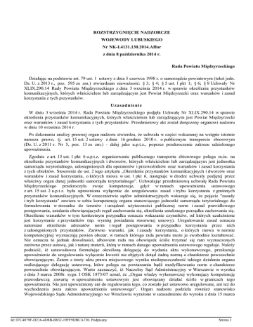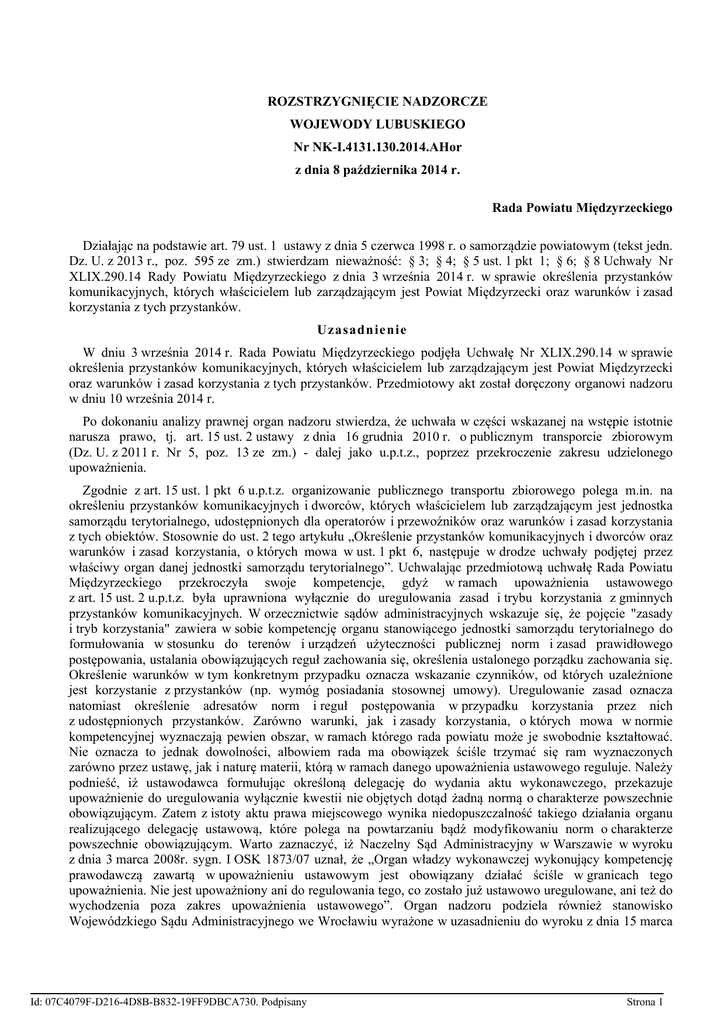 ROZSTRZYGNIĘCIE NADZORCZE WOJEWODY LUBUSKIEGO Nr NK-I.4131.130.2014.AHor z dnia 8 października 2014 r. Rada Powiatu Międzyrzeckiego Działając na podstawie art. 79 ust. 1 ustawy z dnia 5 czerwca 1998 r. o samorządzie powiatowym (tekst jedn. Dz. U. z 2013 r., poz. 595 ze zm.) stwierdzam nieważność: § 3; § 4; § 5 ust. 1 pkt 1; § 6; § 8 Uchwały Nr XLIX.290.14 Rady Powiatu Międzyrzeckiego z dnia 3 września 2014 r. w sprawie określenia przystanków komunikacyjnych, których właścicielem lub zarządzającym jest Powiat Międzyrzecki oraz warunków i zasad korzystania z tych przystanków. Uzasadnienie W dniu 3 września 2014 r. Rada Powiatu Międzyrzeckiego podjęła Uchwałę Nr XLIX.290.14 w sprawie określenia przystanków komunikacyjnych, których właścicielem lub zarządzającym jest Powiat Międzyrzecki oraz warunków i zasad korzystania z tych przystanków. Przedmiotowy akt został doręczony organowi nadzoru w dniu 10 września 2014 r. Po dokonaniu analizy prawnej organ nadzoru stwierdza, że uchwała w części wskazanej na wstępie istotnie narusza prawo, tj. art. 15 ust. 2 ustawy z dnia 16 grudnia 2010 r. o publicznym transporcie zbiorowym (Dz. U. z 2011 r. Nr 5, poz. 13 ze zm.) - dalej jako u.p.t.z., poprzez przekroczenie zakresu udzielonego upoważnienia. Zgodnie z art. 15 ust. 1 pkt 6 u.p.t.z. organizowanie publicznego transportu zbiorowego polega m.in. na określeniu przystanków komunikacyjnych i dworców, których właścicielem lub zarządzającym jest jednostka samorządu terytorialnego, udostępnionych dla operatorów i przewoźników oraz warunków i zasad korzystania z tych obiektów. Stosownie do ust. 2 tego artykułu „Określenie przystanków komunikacyjnych i dworców oraz warunków i zasad korzystania, o których mowa w ust. 1 pkt 6, następuje w drodze uchwały podjętej przez właściwy organ danej jednostki samorządu terytorialnego”. Uchwalając przedmiotową uchwałę Rada Powiatu Międzyrzeckiego przekroczyła swoje kompetencje, gdyż w ramach upoważnienia ustawowego z art. 15 ust. 2 u.p.t.z. była uprawniona wyłącznie do uregulowania zasad i trybu korzystania z gminnych przystanków komunikacyjnych. W orzecznictwie sądów administracyjnych wskazuje się, że pojęcie "zasady i tryb korzystania" zawiera w sobie kompetencję organu stanowiącego jednostki samorządu terytorialnego do formułowania w stosunku do terenów i urządzeń użyteczności publicznej norm i zasad prawidłowego postępowania, ustalania obowiązujących reguł zachowania się, określenia ustalonego porządku zachowania się. Określenie warunków w tym konkretnym przypadku oznacza wskazanie czynników, od których uzależnione jest korzystanie z przystanków (np. wymóg posiadania stosownej umowy). Uregulowanie zasad oznacza natomiast określenie adresatów norm i reguł postępowania w przypadku korzystania przez nich z udostępnionych przystanków. Zarówno warunki, jak i zasady korzystania, o których mowa w normie kompetencyjnej wyznaczają pewien obszar, w ramach którego rada powiatu może je swobodnie kształtować. Nie oznacza to jednak dowolności, albowiem rada ma obowiązek ściśle trzymać się ram wyznaczonych zarówno przez ustawę, jak i naturę materii, którą w ramach danego upoważnienia ustawowego reguluje. Należy podnieść, iż ustawodawca formułując określoną delegację do wydania aktu wykonawczego, przekazuje upoważnienie do uregulowania wyłącznie kwestii nie objętych dotąd żadną normą o charakterze powszechnie obowiązującym. Zatem z istoty aktu prawa miejscowego wynika niedopuszczalność takiego działania organu realizującego delegację ustawową, które polega na powtarzaniu bądź modyfikowaniu norm o charakterze powszechnie obowiązującym. Warto zaznaczyć, iż Naczelny Sąd Administracyjny w Warszawie w wyroku z dnia 3 marca 2008r. sygn. I OSK 1873/07 uznał, że „Organ władzy wykonawczej wykonujący kompetencję prawodawczą zawartą w upoważnieniu ustawowym jest obowiązany działać ściśle w granicach tego upoważnienia. Nie jest upoważniony ani do regulowania tego, co zostało już ustawowo uregulowane, ani też do wychodzenia poza zakres upoważnienia ustawowego”. Organ nadzoru podziela również stanowisko Wojewódzkiego Sądu Administracyjnego we Wrocławiu wyrażone w uzasadnieniu do wyroku z dnia 15 marca Id: 07C4079F-D216-4D8B-B832-19FF9DBCA730. Podpisany Strona 1 2007 r., sygn. akt II SA/Wr 745/06, iż „Zakres i treść prawa miejscowego uwarunkowana jest normami ustalonymi w aktach wyższego rzędu. Podstawą prawną stanowienia aktów prawa miejscowego jest bowiem upoważnienie zawarte w ustawie co przesądza o ich zależnej pozycji w hierarchii źródeł prawa. Każdorazowo zatem, w akcie rangi ustawowej, musi być zawarte upoważnienie (delegacja) dla rady gminy dla podjęcia aktu prawa miejscowego. (...) Narusza prawo nie tylko akt prawa miejscowego, który wykracza poza upoważnienie zawarte w delegacji ustawowej, ale również taki, który zawiera ustalenia w kwestiach ustawowo przekazanych do regulacji umownej”. Zdaniem organu nadzoru zapisy § 3; § 4; § 5 ust. 1 pkt 1; § 6; § 8 badanej uchwały nie mieszczą się w ramach normy kompetencyjnej przyznanej radzie powiatu przez ustawodawcę. W związku z tym uznać należy, iż zostały podjęte z przekroczeniem delegacji ustawowej i częściowo stanowią niedopuszczalną modyfikacje przepisów ustawy o publicznym transporcie zbiorowym. Zgodnie z § 3 badanej uchwały „Korzystanie z przystanków komunikacyjnych uzależnione jest od uzyskania zgody Zarządu Dróg Powiatowych w Międzyrzeczu”. Natomiast w § 4 ust. 1 Rada Powiatu Międzyrzeckiego uchwaliła, iż wydanie zgody na korzystanie z przystanków komunikacyjnych następuje na pisemny wniosek operatora lub przewoźnika oraz szczegółowo wskazała co powinien zawierać taki wniosek, w ust. 2 tego artykułu wskazała natomiast jakie dokumenty należy dołączyć do wniosku