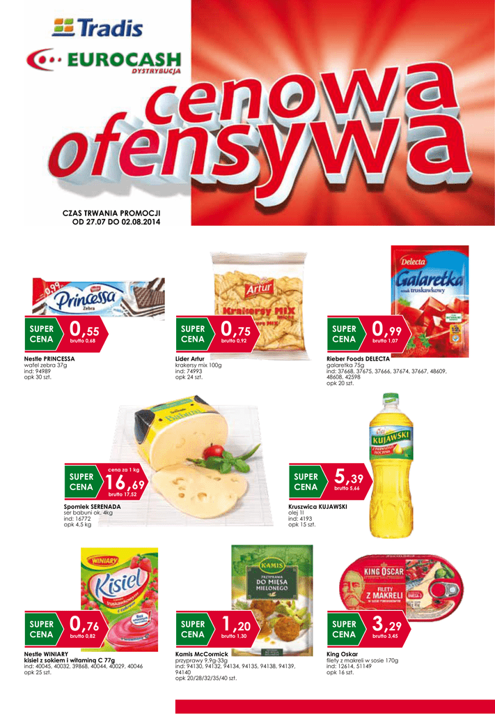 CZAS TRWANIA PROMOCJI OD 27.07 DO 02.08.2014 0,55 SUPER CENA SUPER CENA bbrutto 0,68 Nestle PRINCESSA cena za 1 kg 16,69 bbrutto 0,82 Nestle WINIARY kisiel z sokiem i witaminą C 77g ind: 40045, 40032, 39868, 40044, 40029, 40046 opk 25 szt. 5,39 bbrutto 5,66 Kruszwica KUJAWSKI ser babuni ok. 4kg ind: 16772 opk 4,5 kg 0,76 bbrutto 1,07 galaretka 75g ind: 37668, 37675, 37666, 37674, 37667, 48609, 48608, 42598 opk 20 szt. SUPER CENA bbrutto 17,52 0,99 Rieber Foods DELECTA krakersy mix 100g ind: 74993 opk 24 szt. Spomlek SERENADA SUPER CENA SUPER CENA bbrutto 0,92 Lider Artur wafel zebra 37g ind: 94989 opk 30 szt. SUPER CENA 0,75 olej 1l ind: 4193 opk 15 szt. SUPER CENA 1,20 bbrutto 1,30 Kamis McCormick przyprawy 9,9g-33g ind: 94130, 94132, 94134, 94135, 94138, 94139, 94140 opk 20/28/32/35/40 szt. SUPER CENA King Oskar 3,29 bbrutto 3,45 filety z makreli w sosie 170g ind: 12614, 51149 opk 16 szt. bbrutto 15,98 Wawel FRESH&FRUITY galaretki z nadzieniem 1kg ind: 94192 opk 5 szt. SUPER CENA 4,75 bbrutto 4,99 Animex KRAKUS konserwa mięsna 300g ind: 61161, 61163, 64790 opk 6 szt. SUPER CENA 3,27 bbrutto 3,53 Agros-Nova ŁOWICZ SUPER CENA 3,79 bbrutto 4,66 Mondelez ALPEN GOLD czekolada nussbeisser 100g ind: 3567, 80609 opk 20 szt. SUPER CENA 1,15 bbrutto 1,41 Roleski 1,19 bbrutto 1,25 Agros-Nova TARCZYN sok/napój/nektar 300ml ind: 5341, 5344, 15439, 32415 opk 15 szt. SUPER CENA 2,89 bbrutto 3,12 Agros Nova KOTLIN musztarda 180g ind: 22943, 22921, 22940 opk 10 szt. SUPER CENA SUPER CENA ketchup 450g ind: 11043, 11042, 94287, 91146 opk 6/10 szt. 2,15 bbrutto 2,64 Grupa Żywiec ŻYWIEC piwo full light 500ml puszka ind: 8241 opk 24 szt. SUPER CENA 1,89 bbrutto 2,32 Grupa Żywiec TATRA piwo pils 500ml puszka ind: 14016 opk 24 szt. Informacja handlowa Informacja handlowa syrop 440ml ind: 34143, 34144, 34145, 34146, 34147, 85933, 91696, 94683 opk 9 szt. SUPER CENA Informacja handlowa 12,99 Informacja handlowa SUPER CENA 22,39 bbrutto 27,54 Stock ŻOŁĄDKOWA GORZKA wódka de luxe 40% 700ml ind: 53492 opk 12 szt. Niniejsza informacja handlowa obejmuje produkty dostępne w wydzielonej jednostce biznesowej Eurocash S.A. - Eurocash Dystrybucja. Zakup w/w produktów wlicza się jedynie do obrotu dokonanego z jednostką biznesową Eurocash Dystrybucja i stanowi podstawę do przyznania ewentualnych upustów, rabatów, bonusów, premii i innych świadczeń wyłącznie w ramach jednostki biznesowej Eurocash Dystrybucja, a równocześnie nie będzie uwzględniany przy ustalaniu upustów, rabatów, bonusów, premii i innych świadczeń przyznawanych przez pozostałe jednostki biznesowe EUROCASH S.A. SUPER CENA 14,79 bbrutto 18,19 Sobieski EXTRA ŻYTNIA wódka 500ml ind: 87433 ind: 94281* +oranżada 0,5l opk 6/12 szt. SUPER CENA 1,45 bbrutto 1,78 Benckiser VANISH odplamiacz 100ml ind: 30121 opk 24 szt. *do wyczerpania zapasów Makroregion Południowy Zachód Kąty Wrocławskie, Nowa Wieś Wrocławska, ul. Chomicza 13b, tel. 71 385 82 01 do 04 Makroregion Północ Gdańsk 80-298, ul. Bysewska 18, tel. 58 521 05 95 Makroregion Południe Będzin, ul. Zagórska 76, tel. 516 012 749 Makroregion Północny Zachód Stargard Szczeciński, ul. Przemysłowa 5, tel. 91 577 85 50, Komorniki k/Poznania, ul. Towarowa 20, tel. 61 890 53 43 Makroregion Centrum Piorunów k/ Błonia, Prologis Park Błonie II, S. Batorego 6 Pass Makroregion Południowy Wschód Lublin, ul. Metalurgiczna 30, tel. 81 746 33 33 Makroregion Północny Wschód Porosły 70, Choroszcz, tel. 85 664 56 02 Ilość produktów w promocji ograniczona. Eurocash Dystrybucja zastrzega sobie możliwość limitowania sprzedaży dla jednego kontrahenta. Nie wszystkie produkty dostępne są w każdym oddziale. Eurocash Dystrybucja nie odpowiada za błędy w druku.