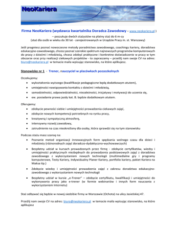Firma NeoKariera (wydawca kwartalnika Doradca Zawodowy – www.neokariera.pl ) – poszukuje dwóch stażystów na płatny staż do 6 m-cy (staż dla osób w wieku do 30 lat - zarejestrowanych w Urzędzie Pracy m. st. Warszawy) Jeśli pragniesz poznać nowoczesne metody poradnictwa zawodowego, coachingu kariery, doradztwa edukacyjno-zawodowego, chcesz poznać szerokie spektrum najnowszych programów komputerowych do pracy z dziećmi i młodzieżą, chcesz zdobyć praktyczne i konkretne doświadczenie w pracy w tym obszarze oraz przy realizacji ciekawych projektów - to zapraszamy – prześlij nam swoje CV na adres: [email protected] w temacie maila wpisując stanowisko, na które aplikujesz. Stanowisko nr 1 - Trener, nauczyciel w placówkach pozaszkolnych Oczekujemy: wykształcenia wyższego (kwalifikacje pedagogiczne będą dodatkowym atutem), umiejętności nawiązywania kontaktu z dziećmi i młodzieżą, samodzielności, odpowiedzialności, niezależności, inicjatywy i motywacji do uczenia się, ew. posiadanie prawa jazdy kat. B. będzie dodatkowym atutem. Oferujemy: zdobycie pewności siebie i umiejętności prowadzenia ciekawych zajęć, zdobycie nowych kompetencji potrzebnych na rynku pracy, kreatywną i sympatyczną atmosferę, intensywny rozwój zawodowy, zatrudnienie na czas nieokreślony dla osoby, która sprawdzi się na tym stanowisku Podczas stażu masz szansę na: Poznanie metod organizacji innowacyjnych form spędzania wolnego czasu dla dzieci i młodzieży (różnorodnych zajęć doradczo-dydaktyczno-wychowawczych) Bezpłatny udział w kursach prowadzonych przez firmę - zdobycie certyfikatów, wiedzy i umiejętności praktycznych niezbędnych do prowadzenia podstawowych zajęć z doradztwa zawodowego z wykorzystaniem nowych technologii (multimedialne gry i programy komputerowe, Testy Kariery, Indywidualny Planer Kariery, portfolio kariery, pakiet Kariera na Maksa itp.) Zdobycie wiedzy i umiejętności prowadzenia zajęć z zakresu doradztwa edukacyjnozawodowego z wykorzystaniem nowych technologii Bezpłatny udział w kursie „e-Trener” – zdobycie certyfikatu, kwalifikacji i umiejętności do wykonywania pracy jako e-trener (w formie webinariów i innych form nauczania z wykorzystaniem Internetu) Staż odbywać się będzie w nowej siedzibie firmy w Warszawie (Ochota) na ulicy Jasielskiej 47. Prześlij nam swoje CV na adres: [email protected] w temacie maila wpisując stanowisko, na które aplikujesz