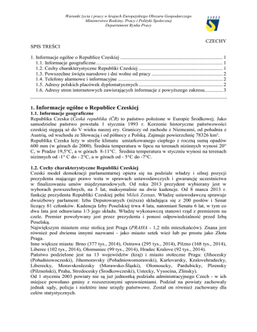 Warunki życia i pracy w krajach Europejskiego Obszaru Gospodarczego Ministerstwo Rodziny, Pracy i Polityki Społecznej Departament Rynku Pracy CZECHY SPIS TREŚCI 1. Informacje ogólne o Republice Czeskiej ............................................................................... 1 1.1. Informacje geograficzne .................................................................................................. 1 1.2. Cechy charakterystyczne Republiki Czeskiej ................................................................. 1 1.3. Powszechne święta narodowe i dni wolne od pracy ....................................................... 2 1.4. Telefony alarmowe i informacyjne ................................................................................. 2 1.5. Adresy polskich placówek dyplomatycznych ................................................................. 2 1.6. Adresy stron internetowych zawierających informacje z powyższego zakresu.............. 3 1. Informacje ogólne o Republice Czeskiej 1.1. Informacje geograficzne Republika Czeska (Česká republika (ČR) to państwo położone w Europie Środkowej. Jako samodzielne państwo powstała 1 stycznia 1993 r. Korzenie historyczne państwowości czeskiej sięgają aż do V wieku naszej ery. Graniczy od zachodu z Niemcami, od południa z Austrią, od wschodu ze Słowacją i od północy z Polską. Zajmuje powierzchnię 78326 km². Republika Czeska leży w strefie klimatu umiarkowanego ciepłego z roczną sumą opadów 600 mm (w górach do 2000). Średnia temperatura w lipcu na terenach nizinnych wynosi 20° C, w Pradze 19,5°C, a w górach 8-11°C. Średnia temperatura w styczniu wynosi na terenach nizinnych od -1° C do - 2°C, a w górach od - 5°C do -7°C. 1.2. Cechy charakterystyczne Republiki Czeskiej Czeski model demokracji parlamentarnej opiera się na podziale władzy i silnej pozycji prezydenta mającego prawo weta w sprawach ustawodawczych i gwarancję uczestnictwa w finalizowaniu umów międzynarodowych. Od roku 2013 prezydent wybierany jest w wyborach powszechnych, na 5 lat, maksymalnie na dwie kadencje. Od 8 marca 2013 r. funkcję prezydenta Republiki Czeskiej pełni Miloš Zeman. Władzę ustawodawczą sprawuje dwuizbowy parlament: Izba Deputowanych (niższa) składająca się z 200 posłów i Senat liczący 81 członków. Kadencja Izby Poselskiej trwa 4 lata, natomiast Senatu 6 lat, w tym co dwa lata jest odnawiana 1/3 jego składu. Władzę wykonawczą stanowi rząd z premierem na czele. Premier powoływany jest przez prezydenta i ponosi odpowiedzialność przed Izbą Poselską. Największym miastem oraz stolicą jest Praga (PRAHA - 1,2 mln mieszkańców). Znana jest również pod dwiema innymi nazwami - jako miasto setek wież lub po prostu jako Złota Praga. Inne większe miasta: Brno (377 tys., 2014), Ostrawa (295 tys., 2014), Pilzno (168 tys., 2014), Liberec (102 tys., 2014), Ołomuniec (99 tys., 2014), Hradec Kralove (92 tys., 2014). Państwo podzielone jest na 13 województw (kraj) i miasto stołeczne Praga: (Jihocesky (Południowoczeski), Jihomoravsky (Południowomorawski), Karlovarsky, Kralovehradecky, Liberecky, Moravskoslezsky (Morawsko-Śląski), Olomoucky, Pardubicky, Plzensky (Pilzneński), Praha, Stredocesky (Środkowczeski), Ustecky, Vysocina, Zlinsky). Od 1 stycznia 2003 powiaty nie są już jednostką podziału administracyjnego Czech - w ich miejsce powołano gminy z rozszerzonymi uprawnieniami. Podział na powiaty zachowały jednak sądy, policja i niektóre inne urzędy państwowe. Został on również zachowany dla celów statystycznych. Warunki życia i pracy w krajach Europejskiego Obszaru Gospodarczego Ministerstwo Rodziny, Pracy i Polityki Społecznej Departament Rynku Pracy Czechy zamieszkuje 10,5 miliona obywateli. Czesi stanowią 81,2% populacji. Następni są Morawianie, stanowią 13,2%, Słowacy 3,1% i 2,5% - Niemcy, Polacy, Cyganie i Węgrzy. Najwięcej mieszkańców Republiki Czeskiej (65%) wyznaje chrześcijaństwo. Inne religie to protestantyzm i judaizm. Oficjalnym językiem Republiki Czeskiej jest język czeski. Walutą obowiązującą w Republice Czeskiej jest Korona (Kč) dzieląca się na 100 halerzy. Więcej informacji m.in. na stronach: http://www.turistik.cz http://pl.wikipedia.org/wiki/Czechy - informacje o Czechach w Wikipedii http://www.czso.cz - czeski urząd statystyczny 1.3. Powszechne święta narodowe i dni wolne od pracy Święta państwowe w Republice Czeskiej 1 stycznia - Powstanie Państwa Czeskiego i Nowy Rok Wielkanoc - (święto ruchome) 1 maja - Święto Pracy - obecnie jest to dzień wolny od pracy 8 maja - Dzień Zwycięstwa - jeszcze kilka lat temu obchodzone 9 maja 5 lipca - Dzień Apostołów Słowiańskich Cyryla i Metodego - Dzień Apostołów Słowiańskich i rocznica przyjęcia przez Republikę Czeską chrztu z rąk misjonarzy Cyryla i Metodego, przysłanych z Bizancjum (863 r.) 6 lipca - rocznica śmierci Jana Husa - jest to dzień upamiętniający śmierć Jana Husa na stosie w Konstancji 28 września - dzień św. Wacława - patrona Czech i dzień państwowości czeskiej 28 października - dzień Odzyskania Niepodległości - jest to odpowiednik polskiego Święta Niepodległości 17 listopada - dzień walki o wolność i demokrację - jest to rocznica studenckiej manifestacji w 1989 r., która zapoczątkowała aksamitną rewolucję, ostatecznie podważając ustrój komunistyczny 24-26 grudnia - Wigilia (Štědrý den) i Boże Narodzenie 1.4. Telefony alarmowe i informacyjne 150 - straż pożarna 155 - pogotowie ratunkowe 156 - straż miejska 158 - policja 1230, 1240 - pomoc drogowa 112 - zintegrowany system pomocy 1180, 1181 - informacja o numerach telefonicznych (płatna) Numer kierunkowy do Republiki Czeskiej: (+ 420 lub 00420 ) 1.5. Adresy polskich placówek dyplomatycznych Ambasada RP w Pradze ul. Valdstejnská 8 118 00 Praha 1 tel. (00420) 257 099 500 fax. (00420) 257 530 399 e-mail: [email protected] http://www.praga.msz.gov.pl/pl