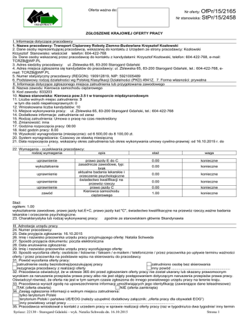 Oferta ważna do: Nr oferty: OfPr/15/2165 Nr stanowiska: StPr/15/2458 ZGŁOSZENIE KRAJOWEJ OFERTY PRACY I. Informacje dotyczące pracodawcy 1. Nazwa pracodawcy: Transport Ciężarowy Roboty Ziemno-Budowlane Krzysztof Kozłowski 2. Dane osoby reprezentującej pracodawcę, wskazanej do kontaktu z Urzędem ze strony pracodawcy: Kozłowski Krzysztof Stanowisko: właściciel telefon: 604-422-768 2a. Dane osoby wskazanej przez pracodawcę do kontaktu z kandydatami: Krzysztof Kozłowski, telefon: 604-422-768, e-mail: [email protected] 3. Adres siedziby pracodawcy: ul. Zblewska 65, 83-200 Starogard Gdański 4. Adres miejsca zgłoszenia się kandydatów do pracodawcy: ul. Zblewska 65, 83-200 Starogard Gdański, tel.: 604-422-768, email: [email protected] 5. Numer statystyczny pracodawcy (REGON): 190912819, NIP: 5921005489 6. Podstawowy rodzaj działalności wg Polskiej Klasyfikacji Działalności (PKD) 4941Z. 7. Forma własności: prywatna II. Informacje dotyczące zgłoszonego miejsca zatrudnienia lub przygotowania zawodowego 8. Nazwa zawodu: Kierowca samochodu ciężarowego 9. Kod zawodu: 833203 10. Nazwa stanowiska: Kierowca pow.3.5 t w transporcie międzynarodowym 11. Liczba wolnych miejsc zatrudnienia: 3 w tym dla osób niepełnosprawnych: 0 12. Wnioskowana liczba kandydatów: 10 13. Miejsce wykonywania pracy: ul. Zblewska 65, 83-200 Starogard Gdański, tel.: 604-422-768 14. Dodatkowe informacje: zatrudnienie od zaraz 15. Rodzaj zatrudnienia: Umowa o pracę na czas nieokreślony 16. Zmianowość: inna 17. Godzina rozpoczęcia pracy: 08:00 18. Ilość godzin pracy: 8.00 19. Wysokość wynagrodzenia (miesięcznie): od 6 500,00 do 8 100,00 zł. 20. System wynagradzania: Czasowy ze stawką miesięczną 21. Data rozpoczęcia pracy, wskazany okres zatrudnienia lub okres wykonywania umowy cywilno-prawnej: od 16.10.2015 r. do ................................. r. 22. Wymagania - oczekiwania pracodawcy: rodzaj wymagania opis staż waga uprawnienie wykształcenie uprawnienie uprawnienie uprawnienie zawód prawo jazdy E do C zasadnicze zawodowe, typ: brak aktualne badania lekarskie i orzeczenie psychologiczne świadectwo kwalifikacji na przewóz rzeczy prawo jazdy C Kierowca samochodu ciężarowego 0.00 konieczne 0.00 konieczne 0.00 konieczne 0.00 konieczne 0.00 konieczne 1.00 konieczne Staż: ogółem: 1.00 wykształcenie zawodowe, prawo jazdy kat.E+C, prawo jazdy kat:"C", świadectwo kwalifikacyjne na przewóz rzeczy,ważne badania lekarskie i orzeczenie psychologiczne. 23. Charakterystyka lub rodzaj wykonywanej pracy: zgodnie ze stanowiskiem głównie Skandynawia III. Adnotacje urzędu pracy 24. Numer pracodawcy: 25. Data przyjęcia zgłoszenia: 16.10.2015 26. Imię i nazwisko pracownika urzędu pracy przyjmującego ofertę: Natalia Schweda 27. Sposób przyjęcia dokumentu: poczta elektroniczna 28. Data anulowania zgłoszenia: 29. Imię i nazwisko pracownika urzędu pracy wycofującego ofertę: 30. Sposób wycofania oferty: osobiście / listownie / faksem / e-mailem / telefonicznie / przez pracownika po upływie terminu ważności oferty / przez pracownika na podstawie wpisu na skierowaniu do pracodawcy 31. Powód wycofania oferty pracy: zatrudnienie osoby bezrobotnej/poszukującej pracy zatrudniono osobę bez skierowania rezygnacja pracodawcy z realizacji oferty inny powód ........................................................ 32. Pracodawca oświadczył, że w okresie 365 dni przed zgłoszeniem oferty pracy nie został ukarany lub skazany prawomocnym wyrokiem za naruszenie przepisów prawa pracy albo nie jest objęty postępowaniem dotyczącym naruszenia przepisów prawa pracy. Oświadczył również, że oferta nie jest w tym samym czasie zgłoszona do innego powiatowego urzędu pracy na terenie kraju. 33. Pracodawca wyraził zgodę na upowszechnienie informacji umożliwiających jego identyfikację (zawierające dane teleadresowe): TAK (oferta otwarta) NIE (oferta zamknięta) 34. Zasięg ogłaszania informacji o wolnym miejscu zatrudnienia: tylko terytorium Polski terytorium Polski i państwa UE/EOG (należy uzupełnić dodatkowy załącznik: „oferta pracy dla obywateli EOG”) inny powiatowy urząd pracy ………………………..............................................................……. 35. Pracodawca wnioskował o kontakt z urzedem pracy w sprawie realizacji oferty pracy (raz w tygodniu/co dwa tygodnie/ inny termin Syriusz: 22130 - Starogard Gdański - wyk. Natalia Schweda dn. 16.10.2015 Strona 1 ...........................................................................) 36. Inne informacje: Praca na terenie Europy- głównie Skandynawia Syriusz: 22130 - Starogard Gdański - wyk. Natalia Schweda dn. 16.10.2015 Strona 2