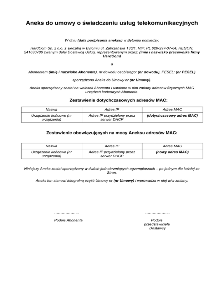 Aneks do umowy o świadczeniu usług telekomunikacyjnych W dniu (data podpisania aneksu) w Bytomiu pomiędzy: HardCom Sp. z o.o. z siedzibą w Bytomiu ul. Zabrzańska 136/1, NIP: PL 626-297-37-64, REGON: 241630786 zwanym dalej Dostawcą Usług, reprezentowanym przez: (imię i nazwisko pracownika firmy HardCom) a Abonentem (imię i nazwisko Abonenta), nr dowodu osobistego: (nr dowodu), PESEL: (nr PESEL) sporządzono Aneks do Umowy nr (nr Umowy). Aneks sporządzony został na wniosek Abonenta i ustalono w nim zmiany adresów fizycznych MAC urządzeń końcowych Abonenta. Zestawienie dotychczasowych adresów MAC: Nazwa Adres IP Adres MAC Urządzenie końcowe (nr urządzenia) Adres IP przydzielony przez serwer DHCP (dotychczasowy adres MAC) Zestawienie obowiązujących na mocy Aneksu adresów MAC: Nazwa Adres IP Adres MAC Urządzenie końcowe (nr urządzenia) Adres IP przydzielony przez serwer DHCP (nowy adres MAC) Niniejszy Aneks został sporządzony w dwóch jednobrzmiących egzemplarzach – po jednym dla każdej ze Stron. Aneks ten stanowi integralną część Umowy nr (nr Umowy) i wprowadza w niej w/w zmiany. ……………….. ……………….. Podpis Abonenta Podpis przedstawiciela Dostawcy