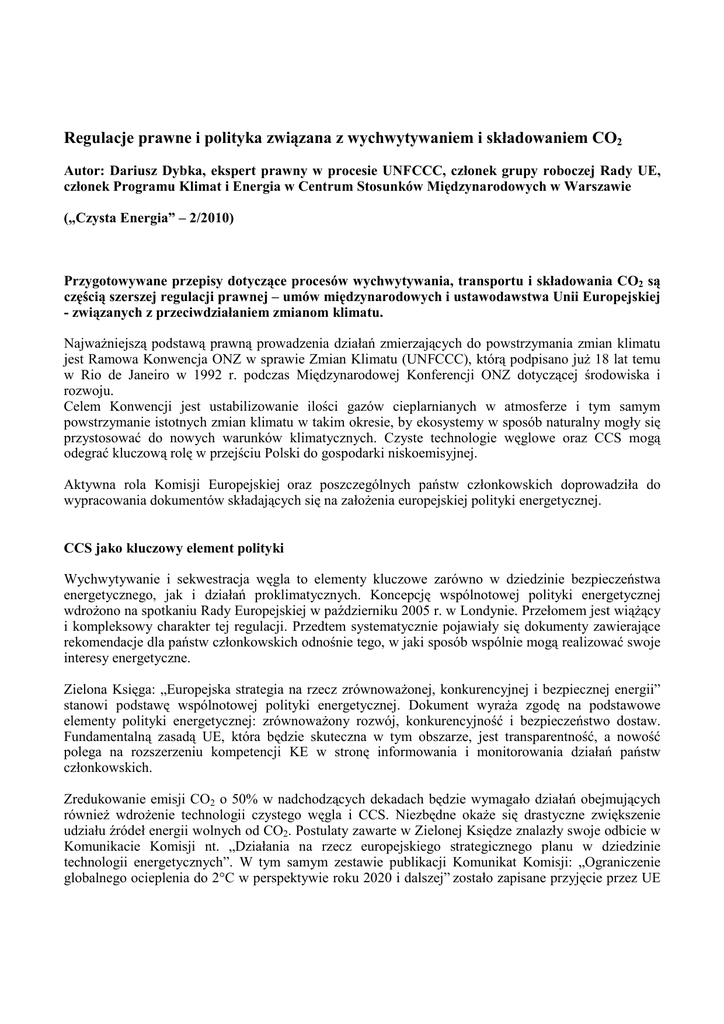 Regulacje prawne i polityka związana z wychwytywaniem i składowaniem CO2 Autor: Dariusz Dybka, ekspert prawny w procesie UNFCCC, członek grupy roboczej Rady UE, członek Programu Klimat i Energia w Centrum Stosunków Międzynarodowych w Warszawie („Czysta Energia” – 2/2010) Przygotowywane przepisy dotyczące procesów wychwytywania, transportu i składowania CO2 są częścią szerszej regulacji prawnej – umów międzynarodowych i ustawodawstwa Unii Europejskiej - związanych z przeciwdziałaniem zmianom klimatu. Najważniejszą podstawą prawną prowadzenia działań zmierzających do powstrzymania zmian klimatu jest Ramowa Konwencja ONZ w sprawie Zmian Klimatu (UNFCCC), którą podpisano już 18 lat temu w Rio de Janeiro w 1992 r. podczas Międzynarodowej Konferencji ONZ dotyczącej środowiska i rozwoju. Celem Konwencji jest ustabilizowanie ilości gazów cieplarnianych w atmosferze i tym samym powstrzymanie istotnych zmian klimatu w takim okresie, by ekosystemy w sposób naturalny mogły się przystosować do nowych warunków klimatycznych. Czyste technologie węglowe oraz CCS mogą odegrać kluczową rolę w przejściu Polski do gospodarki niskoemisyjnej. Aktywna rola Komisji Europejskiej oraz poszczególnych państw członkowskich doprowadziła do wypracowania dokumentów składających się na założenia europejskiej polityki energetycznej. CCS jako kluczowy element polityki Wychwytywanie i sekwestracja węgla to elementy kluczowe zarówno w dziedzinie bezpieczeństwa energetycznego, jak i działań proklimatycznych. Koncepcję wspólnotowej polityki energetycznej wdrożono na spotkaniu Rady Europejskiej w październiku 2005 r. w Londynie. Przełomem jest wiążący i kompleksowy charakter tej regulacji. Przedtem systematycznie pojawiały się dokumenty zawierające rekomendacje dla państw członkowskich odnośnie tego, w jaki sposób wspólnie mogą realizować swoje interesy energetyczne. Zielona Księga: „Europejska strategia na rzecz zrównoważonej, konkurencyjnej i bezpiecznej energii” stanowi podstawę wspólnotowej polityki energetycznej. Dokument wyraża zgodę na podstawowe elementy polityki energetycznej: zrównoważony rozwój, konkurencyjność i bezpieczeństwo dostaw. Fundamentalną zasadą UE, która będzie skuteczna w tym obszarze, jest transparentność, a nowość polega na rozszerzeniu kompetencji KE w stronę informowania i monitorowania działań państw członkowskich. Zredukowanie emisji CO2 o 50% w nadchodzących dekadach będzie wymagało działań obejmujących również wdrożenie technologii czystego węgla i CCS. Niezbędne okaże się drastyczne zwiększenie udziału źródeł energii wolnych od CO2. Postulaty zawarte w Zielonej Księdze znalazły swoje odbicie w Komunikacie Komisji nt. „Działania na rzecz europejskiego strategicznego planu w dziedzinie technologii energetycznych”. W tym samym zestawie publikacji Komunikat Komisji: „Ograniczenie globalnego ocieplenia do 2°C w perspektywie roku 2020 i dalszej” zostało zapisane przyjęcie przez UE jednostronnego zobowiązania do zredukowania swoich emisji o 20% do 2020 r. Przyjęcie tego dokumentu zobowiązało państwa członkowskie do zdecydowanych wysiłków redukcyjnych. Komisja zakłada, że ok. 2020 r. technologie CCS mogą być na tyle zaawansowane, że będzie je można stosować w skali komercyjnej. Wsparcie dla komercjalizacji CCS W celu wsparcia komercjalizacji technologii CCS w 2005 r., z inicjatywy Komisji Europejskiej, powołano Europejską Platformę Technologiczną ZEP – Zero Emission Fossil Fuel Power Plants, skupiającą reprezentantów przemysłu, jednostek badawczych, organizacji pozarządowych i innych. W 2006 r. Platforma ZEP opracowała m.in. dokumenty, mające wpływ na prace nad regulacjami dotyczącymi CCS, tzw. ZEP Flagship Programme, który promuje budowę zakładów CCS o dużej skali. W listopadzie 2007 r. Komisja Europejska opublikowała Komunikat „Europejski Strategiczny Plan w dziedzinie technologii energetycznych. Droga do niskoemisyjnych technologii przyszłości”. W planie między innymi zaznaczono, że jednym z głównych wyzwań technologicznych, z którymi UE musi się uporać w ciągu najbliższej dekady, aby móc zrealizować cele wyznaczone na 2020 r., jest umożliwienie komercyjnego wykorzystania technologii wychwytywania, transportu i składowania CO2. W planie zakłada się, że zastosowanie CCS w wytwarzaniu energii jest jedną z dziedzin, w ramach której należy rozwijać technologie w Europie. W toku prac nad regulacją zagadnień związanych z wychwytywaniem i składowaniem CO2 rozważano m.in.: • • • • • • stworzenie warunków do komercjalizacji technologii CCS, w szczególności zagadnienie jej wpływu na ceny energii, budowę zaufania publicznego – społeczeństwo powinno być informowane o wszelkich kwestiach związanych z CCS, zwłaszcza o bezpieczeństwie składowisk, wyznaczenie składowisk – rozważano zasady związane z wyborem składowisk, jak również z optymalnymi procedurami ich monitorowania, kwestie regulacyjne, takie jak obowiązujące umowy międzynarodowe związane z ochroną mórz i klimatu, kwestie odpowiedzialności za wyciek CO2, jak również własności składowanego CO2, oddziaływanie składowania CO2 na środowisko. „Pakiet klimatyczno – energetyczny” reguluje kwestie związane z CCS i bezpośrednio wyróżnia następujące zagadnienia: wybór składowiska i pozwoleń na poszukiwanie miejsca, wydawanie pozwoleń na składowanie, eksploatację składowiska, jego zamknięcie i zobowiązania po zamknięciu, zapewnienie odpowiedniego zabezpieczenia finansowego. Ponadto dostęp stron trzecich do sieci służących do transportu CO2 i do składowisk w celach geologicznego składowania wychwyconego CO2, określenie właściwych organów odpowiedzialnych za realizację obowiązków wynikających z dyrektywy, sprawę współpracy transgranicznej oraz sprawozdawczości państw cz