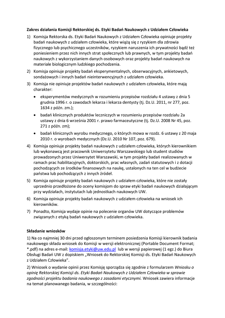 Zakres działania Komisji Rektorskiej ds. Etyki Badań Naukowych z Udziałem Człowieka 1) Komisja Rektorska ds. Etyki Badań Naukowych z Udziałem Człowieka opiniuje projekty badań naukowych z udziałem człowieka, które wiążą się z ryzykiem dla zdrowia fizycznego lub psychicznego uczestników, ryzykiem naruszenia ich prywatności bądź też poniesieniem przez nich innych strat społecznych lub prawnych, w tym projekty badań naukowych z wykorzystaniem danych osobowych oraz projekty badań naukowych na materiale biologicznym ludzkiego pochodzenia. 2) Komisja opiniuje projekty badań eksperymentalnych, obserwacyjnych, ankietowych, sondażowych i innych badań nieinterwencyjnych z udziałem człowieka. 3) Komisja nie opiniuje projektów badań naukowych z udziałem człowieka, które mają charakter: • eksperymentów medycznych w rozumieniu przepisów rozdziału 4 ustawy z dnia 5 grudnia 1996 r. o zawodach lekarza i lekarza dentysty (tj. Dz.U. 2011, nr 277, poz. 1634 z późn. zm.); • badań klinicznych produktów leczniczych w rozumieniu przepisów rozdziału 2a ustawy z dnia 6 września 2001 r. prawo farmaceutyczne (tj. Dz.U. 2008 Nr 45, poz. 271 z późn. zm); • badań klinicznych wyrobu medycznego, o których mowa w rozdz. 6 ustawy z 20 maja 2010 r. o wyrobach medycznych (Dz.U. 2010 Nr 107, poz. 679). 4) Komisja opiniuje projekty badań naukowych z udziałem człowieka, których kierownikiem lub wykonawcą jest pracownik Uniwersytetu Warszawskiego lub student studiów prowadzonych przez Uniwersytet Warszawski, w tym projekty badań realizowanych w ramach prac habilitacyjnych, doktorskich, prac własnych, zadań statutowych i z dotacji pochodzących ze środków finansowych na naukę, ustalonych na ten cel w budżecie państwa lub pochodzących z innych źródeł. 5) Komisja opiniuje projekty badań naukowych z udziałem człowieka, które nie zostały uprzednio przedłożone do oceny komisjom do spraw etyki badań naukowych działającym przy wydziałach, instytutach lub jednostkach naukowych UW. 6) Komisja opiniuje projekty badań naukowych z udziałem człowieka na wniosek ich kierowników. 7) Ponadto, Komisja wydaje opinie na polecenie organów UW dotyczące problemów związanych z etyką badań naukowych z udziałem człowieka. Składanie wniosków 1) Na co najmniej 30 dni przed ogłoszonym terminem posiedzenia Komisji kierownik badania naukowego składa wniosek do Komisji w wersji elektronicznej (Portable Document Format; *.pdf) na adres e-mail: [email protected] lub w wersji papierowej (1 egz.) do Biura Obsługi Badań UW z dopiskiem „Wniosek do Rektorskiej Komisji ds. Etyki Badań Naukowych z Udziałem Człowieka”. 2) Wniosek o wydanie opinii przez Komisję sporządza się zgodnie z formularzem Wniosku o opinię Rektorskiej Komisji ds. Etyki Badań Naukowych z Udziałem Człowieka w sprawie zgodności projektu badania naukowego z zasadami etycznymi. Wniosek zawiera informacje na temat planowanego badania, w szczególności: a) tytuł projektu, b) dane kierownika badania oraz członków zespołu badawczego, c) informacje na temat uczestników badania, sposobu ich rekrutowania do udziału w badaniu oraz sposobu ich wynagradzania (jeśli przewidziane), d) jasne określenie celu badania w wymiarze teoretycznym i praktycznym, e) szczegółowy opis procedur badawczych z uwzględnieniem stosowanych metod i technik badawczych oraz ze wskazaniem metod inwazyjnych, f) informację na temat ryzyka związanego z udziałem w badaniu, z uwzględnieniem ryzyka dla zdrowia fizycznego lub psychicznego uczestników, ryzyka naruszenia ich prywatności bądź poniesienie przez nich innych strat społecznych lub prawnych, a także informację na temat przewidywanego dyskomfortu fizycznego i psychicznego dla uczestników oraz ryzyka podważenia zaufania uczestników i innych członków społeczeństwa do badaczy, g) określenie zasad i warunków zbierania, gromadzenia, przetwarzania i ochrony danych osobowych uczestników badania, a także przyjętych metod anonimizacji tych danych lub innych metod zapewnienia anonimowości uczestnikom badania, h) wzór formularza informacji dla potencjalnego uczestnika badania zawierający w szczególności informacje o celu, przebiegu i metodach badania, przewidywanych korzyściach badania, ryzyku i niedogodnościach związanych z udziałem w badaniu oraz o podstawowych prawach uczestnika badania, w tym prawie do rezygnacji z udziału w badaniu na każdym jego etapie i bez żadnych konsekwencji, oraz o prawie do ochrony danych osobowych; jeśli uczestnikami badania mają być osoby małoletnie lub ubezwłasnowolnione należy przygotować wzór formularza informacji dla tych osób, a także wzór formularza informacji dla ich przedstawicieli ustawowych, i) wzór zgody uczestnika badania na udział w badaniu zawierający oświadczenie, że decyzja o udziale w badaniu ma charakter świadomy (tzn. została powzięta w oparciu o uprzednio otrzymane, wyczerpujące i zrozumiałe informacje na temat badania) oraz dobrowolny i że uczestnik ma świadomość możliwości wycofania się z badania na każdym jego etapie i bez żadnych konsekwencji; jeśli uczestnikami badania mają być osoby małoletnie lub ubezwłasnowolnione także wzór zgody ich przedstawicieli ustawowych; j) wzór zgody uczestnika badania na przetwarzanie danych osobowych; jeśli uczestnikami badania mają być osoby małoletnie lub ubezwłasnowolnione także wzór zgody ich przedstawicieli ustawowych; k) określenie zasad przekazywania uczestnikom badania informacji zwrotnej o wynikach badania. 10) Komisja może zwrócić się do wnioskodawcy o przedłożenie dodatkowych informacji lub wyjaśnień dotyczących projektu badania naukowego. 11) Wnioski niekompletne nie będą rozpatrywane. Rozpatrywanie ich jest możliwe po uzupełnieniu brakujących informacji. Opiniowanie wniosków 1) Sekretarz Komisji niezwłocznie przekazuje poprawnie złożony wniosek Przewodniczącemu Komisji. Jeż