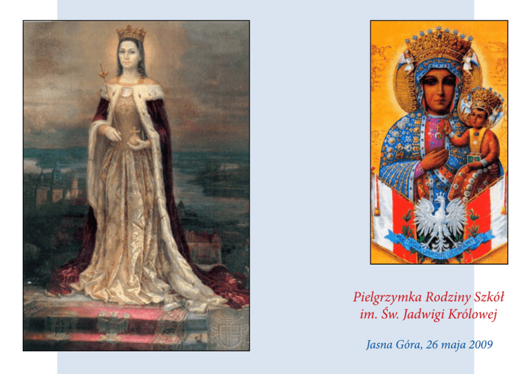 Pielgrzymka Rodziny Szkół im. Św. Jadwigi Królowej Jasna Góra, 26 maja 2009 RODZINA SZKÓŁ IM. ŚW. JADWIGI KRÓLOWEJ Akt zawierzenia Matce Bożej Rodziny Szkół im. Św. Jadwigi Królowej Bądź pozdrowiona, Panno Święta, co Jasnej bronisz Częstochowy i w Ostrej świecisz Bramie! Stają przed Tobą, Polski Królowo, uczniowie szkół, które noszą imię świętej Jadwigi, Królowej Wawelskiej. Jesteśmy królewskim plemieniem z narodu Świętych i Uczonych, a krew nasza dawne bohatery. Gaude Mater Polonia, tak piękne dzieci rodząca! Ciesz się nami Jasnogórska Królowo! Ciesz się święta Jadwigo, nasza Patronko! Stąd, z Jasnej Góry, chcemy wziąć depozyt wiary naszych Ojców i na sztandar święty przysięgamy, że będziemy strzec wiary świętej i wartości, które stanowią naszą tożsamość. I tak chcemy być spełnioną nadzieją, chlubą Kościoła i Ojczyzny. Tak nam dopomóż Bóg! Maryjo Królowo Polski, okaż, że jesteś Matką! Święta Jadwigo, nasza Patronko, czuwaj nad nami. Amen. Pieśń Jadwigo Święta – Polska Królowo, nie ma piękniejszej w świętych pań gronie, o jakaś śliczna z polskim warkoczem z lilią w królewskiej koronie. Ta łza dyskretna w oku Królowej kiedy pod krzyżem Chrysta pytała: Kogo mam kochać miłością szczerą? Polskę Ci kochać kazała. A teraz szkoły Twego imienia miej Najjaśniejsza w swojej obronie duchem i sercem niech będą wielkie szlachetne lilią w koronie. Ślady stóp Twoich znaki pociechy, widzę w kościele cudnym na Piasku. Dla Akademii dałaś klejnoty, by lśniły w świętości blasku. Mądrość i dobroć – święta Jadwigo, ponad polskimi ponieś żakami. Jeszcze będziemy światu potrzebni ze zwycięskimi orłami. Wiersz i Akt zawierzenia Matce Bożej dla Rodziny Szkół Pani Wawelskiej napisał Ks. Biskup Józef Zawitkowski (Ks.Tymoteusz).