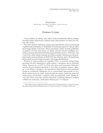 POSTSCRIPTUM POLONISTYCZNE, 2010 • 2 (6) ISSN 1898-1593 ZHAO GANG Beijing Foreign Studies University Pekin Profesor Yi Lijun Coraz rzadziej się zdarza, żeby jedna osoba kształtowała oblicze jakiegoś kierunku badań naukowych w danym kraju. Pani profesor Yi Lijun jest właśnie taką osobą. Nie mam zamiaru umniejszać zasług innych profesorów, którzy tworzyli lub współtworzyli polonistykę na Pekińskim Uniwersytecie Języków Obcych (Beijing Foreign Studies University). Wręcz przeciwnie, trzeba wyraźnie podkreślić, że profesor Yi Lijun była jeszcze za młoda, żeby być chociaż świadkiem momentu powstania polonistyki chińskiej, która narodziła się już w 1954 roku. Ona w tym roku miała właśnie wyjechać do Polski na studia. Zasłużonymi założycielami katedry języka polskiego na PUJO byli Xiao Huimin i prof. Cheng Jizhong, którzy godni są najwyższego szacunku i wiecznego upamiętnienia. Profesor Yi Lijun urodziła się 4 grudnia 1934 r. w powiecie Huang Gang, prowincji Hu Bei. Dzieciństwo miała typowe i nietypowe jak na ówczesne Chiny. Typowe, bo od 1937 do 1945 roku duża część terytorium Chin znajdowała się pod okupacją japońską, w tym także jej rodzinne miasto, i dlatego aż do dzisiaj w pamięci z lat dzieciństwa Pani Profesor tkwią doświadczenia lat wojennych. Nietypowe, bo w owych latach dziewczynki ze zwykłych rodzin raczej nie miały okazji chodzić do szkoły, jednak jej ojciec był oświeconym człowiekiem i zachęcał córkę do pobierania nauki. Dzięki decyzji ojca Chiny mają dziś wybitną tłumaczkę i badaczkę literatury polskiej, a Polska ma zasłużoną „Ambasador Polszczyzny”1 w Chinach. 1 Tytuł Honorowego Ambasadora Polszczyzny poza Granicami Kraju, ustanowiony przez Prezydium Rady Języka Polskiego, Profesor Yi Lijun otrzymała w listopadzie 2008 roku. 26 POSTSCRIPTUM POLONISTYCZNE, 2010 • 2 (6) W roku 1953 Yi Lijun rozpoczęła swoje studia na Wydziale Filologii Chińskiej prestiżowego Uniwersytetu Wuhańskiego, gdzie spędziła tylko rok, bo szybko pojawiła się okazja, która całkowicie zmieniła drogę jej życia. Od 1950 r., czyli rok po powstaniu Chińskiej Republiki Ludowej i nawiązaniu stosunków dyplomatycznych między ChRL a Polską, rząd chiński zaczął wysyłać stypendystów do Polski na studia na przeróżnych kierunkach. W składzie pierwszej siedmioosobowej grupy stypendystów był student Xiao Huimin urodzony w 1924 r. W 1950 r. pojechał do Polski na Uniwersytet Warszawski studiować polonistykę na Wydziale Humanistyki. Kiedy wyjeżdżał z Chin, miał już 26 lat. W 1954 r. po powrocie do kraju zaczął pracować na Uniwersytecie Pekińskim jako wykładowca języka polskiego; współpracował z nim polski lektor, Leszek Cyrzyk. Pierwsza grupa studentów polonistyki pekińskiej liczyła 20 osób. Wśród nich był student – Cheng Jizhong, który został później kierownikiem katedry języka polskiego i przez wiele lat czuwał nad jej rozwojem. Zatem w momencie, kiedy Yi Lijun wybierała się do Polski na studia polonistyczne, w Chinach istniała już możliwość kształcenia specjalistów z zakresu języka polskiego. Sam fakt, że równolegle kształciło się studentów polonistyki w kraju i w Polsce, świadczy o dużym zapotrzebowaniu w owym czasie w Chinach na ludzi znających język polski. W grupie studentów, którzy razem z Yi Lijun wybrali się do Polski, był młody student fizyki atomowej – Yuan Hanrong, przyszły mąż Pani Profesor i ważny partner w późniejszej pracy tłumaczeniowej. W latach 1954–1960 Yi Lijun studiowała na Wydziale Filologicznym Uniwersytetu Warszawskiego, specjalizując się w zakresie filologii polskiej; po zdaniu wszystkich egzaminów i obronie pracy dyplomowej uzyskała tytuł magistra. W czasie studiów przeczytała mnóstwo książek, sześć lat studiów w Polsce przyczyniło się do stworzenia solidnego fundamentu znajomości języka polskiego. Po powrocie do kraju pracowała najpierw w sekcji radziecko-wschodnioeuropejskiej Chińskiego Radia Międzynarodowego jako redaktorka i dziennikarka. W 1962 roku przeniosła się do ówczesnego Pekińskiego Instytutu Języków Obcych (dzisiejszy Pekiński Uniwersytet Języków Obcych) i pracuje tam do dnia dzisiejszego, z jedyną dwuletnią przerwą, kiedy była lektorką języka chińskiego w katedrze sinologii na Uniwersytecie Warszawskim. Profesor Yi Lijun sama przyznaje, że jej zainteresowanie literaturą narodziło się już w okresie dzieciństwa. A rok studiów na kierunku filologii chińskiej na Uniwersytecie Wuhańskim nie tylko pogłębił jej wiedzę o literaturze ZHAO GANG: Profesor Yi Lijun 27 chińskiej, ale jeszcze bardziej podniósł jej umiejętność posługiwania się językiem chińskim, co bardzo sprzyjało w późniejszej pracy nad tłumaczeniem literatury. I dlatego też często powtarza, że dla uczących się obcego języka poziom znajomości swojego ojczystego języka jest szczególnie ważny. Literatura polska zaczęła interesować Chińczyków na początku XX stulecia. Chiny były wówczas zagrożone zagraniczną inwazją. Chińczycy podziwiali odwagę i bohaterstwo okazywane w kolejnych buntach Polaków przeciw zaborcom i zaczęli w literaturze polskiej szukać ducha Polaków, dzięki któremu naród ten ocalał, a jego kultura – została utrwalona. Pierwszym człowiekiem, który zainteresował się literaturą polską i z entuzjazmem przedstawiał ją chińskim czytelnikom, był znany pisarz Lu Xun. Kilka razy pisał o literaturze polskiej i sam ją trochę tłumaczył. Potem w latach dwudziestych i trzydziestych XX wieku, szereg polskich dzieł literackich zostało przetłumaczonych na język chiński, ale za pośrednictwem trzeciego języka. Druga połowa lat trzydziestych i całe lata czterdzieste, jak wiadomo, nie sprzyjały pracy tłumaczeniowej. W latach pięćdziesiątych przełożono niemało polskich dzieł na język chiński, ale głównie z języka 