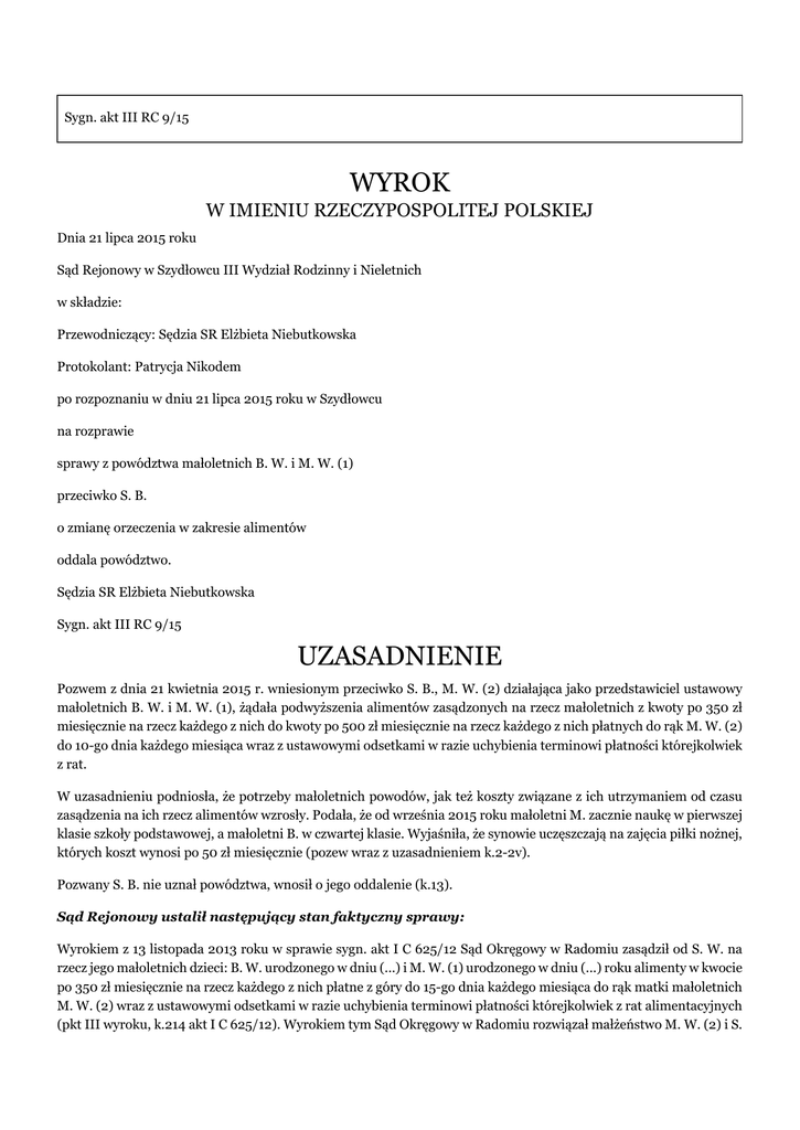Sygn. akt III RC 9/15 WYROK W IMIENIU RZECZYPOSPOLITEJ POLSKIEJ Dnia 21 lipca 2015 roku Sąd Rejonowy w Szydłowcu III Wydział Rodzinny i Nieletnich w składzie: Przewodniczący: Sędzia SR Elżbieta Niebutkowska Protokolant: Patrycja Nikodem po rozpoznaniu w dniu 21 lipca 2015 roku w Szydłowcu na rozprawie sprawy z powództwa małoletnich B. W. i M. W. (1) przeciwko S. B. o zmianę orzeczenia w zakresie alimentów oddala powództwo. Sędzia SR Elżbieta Niebutkowska Sygn. akt III RC 9/15 UZASADNIENIE Pozwem z dnia 21 kwietnia 2015 r. wniesionym przeciwko S. B., M. W. (2) działająca jako przedstawiciel ustawowy małoletnich B. W. i M. W. (1), żądała podwyższenia alimentów zasądzonych na rzecz małoletnich z kwoty po 350 zł miesięcznie na rzecz każdego z nich do kwoty po 500 zł miesięcznie na rzecz każdego z nich płatnych do rąk M. W. (2) do 10-go dnia każdego miesiąca wraz z ustawowymi odsetkami w razie uchybienia terminowi płatności którejkolwiek z rat. W uzasadnieniu podniosła, że potrzeby małoletnich powodów, jak też koszty związane z ich utrzymaniem od czasu zasądzenia na ich rzecz alimentów wzrosły. Podała, że od września 2015 roku małoletni M. zacznie naukę w pierwszej klasie szkoły podstawowej, a małoletni B. w czwartej klasie. Wyjaśniła, że synowie uczęszczają na zajęcia piłki nożnej, których koszt wynosi po 50 zł miesięcznie (pozew wraz z uzasadnieniem k.2-2v). Pozwany S. B. nie uznał powództwa, wnosił o jego oddalenie (k.13). Sąd Rejonowy ustalił następujący stan faktyczny sprawy: Wyrokiem z 13 listopada 2013 roku w sprawie sygn. akt I C 625/12 Sąd Okręgowy w Radomiu zasądził od S. W. na rzecz jego małoletnich dzieci: B. W. urodzonego w dniu (...) i M. W. (1) urodzonego w dniu (...) roku alimenty w kwocie po 350 zł miesięcznie na rzecz każdego z nich płatne z góry do 15-go dnia każdego miesiąca do rąk matki małoletnich M. W. (2) wraz z ustawowymi odsetkami w razie uchybienia terminowi płatności którejkolwiek z rat alimentacyjnych (pkt III wyroku, k.214 akt I C 625/12). Wyrokiem tym Sąd Okręgowy w Radomiu rozwiązał małżeństwo M. W. (2) i S. W. przez rozwód z winy obu stron i wykonywanie władzy rodzicielskiej nad małoletnimi dziećmi powierzył matce, M. W. (2) z prawem ojca S. W. do współdecydowania wspólnie z matką o ważniejszych sprawach dzieci takich jak: wybór szkoły, zawodu, zmiana miejsca zamieszkania, leczenie i wydanie paszportu (pkt II wyroku). Apelację od wysokości zasądzonych alimentów wniosła M. W. (2) (k.231-232 akt I C 625/12). Wyrokiem Sądu Apelacyjnego w Lublinie z 05 czerwca 2014 roku apelacja została oddalona (k.251 akt I C 625/12). Jak wynika z treści odpisu skróconego aktu małżeństwa (k.6 akt I C 625/12 S. B. po zawarciu małżeństwa przyjął nazwisko żony (...), a następnie po orzeczeniu rozwodu powrócił do nazwiska rodowego (...). W dacie zasądzenia alimentów małoletni zamieszkiwali z matką, która wynajmowała mieszkanie za kwotę 700 zł miesięcznie, za które ponosiła opłaty za media w kwocie po 200 zł miesięcznie. M. W. (2) miała 32 lata i pracowała jako pomoc kuchenna z wynagrodzeniem ok. 1 160 zł, otrzymywała też zasiłek rodzinny w wysokości 190 zł. Małoletni uczęszczali na dodatkowe zajęcia sportowe płatne po 50 zł miesięcznie. S. W. pracował jako kierowca z wynagrodzeniem 1 190 zł miesięcznie (uzasadnienie k.223 akt I C 625/12). Aktualnie B. W. ma 10 lat i od września będzie uczniem czwartej klasy szkoły podstawowej. M. W. (1) ma 7 lat i od września będzie uczniem pierwszej klasy. Obydwaj będą uczęszczać do szkoły podstawowej w S.. Małoletni B. już uczęszcza do tej szkoły, w roku szkolnym 2014/2015 do klasy trzeciej, zaś małoletni M. w roku szkolnym 2014/2015 uczęszczał do przedszkola, również w S.. Opłata za obiady w przedszkolue wynosiła 100 zł miesięcznie. B. W. również miał w szkole wykupione obiady za 90 zł miesięcznie i będą one kontynuowane. Małoletni co miesiąc chodzą do fryzjera, co kosztuje łącznie 20 zł miesięcznie. W szkole matka małoletniego B. uiszcza składki na ubezpieczenie – 40 zł oraz składkę na potrzeby klasy w wysokości 50 zł. W roku szkolnym jest jedna dłuższa wycieczka, której koszt jak dotychczas wynosił 150 zł. Małoletni B. uczestniczy też wraz z klasą w wyjściach do kina, do teatru, występach filharmonii, co kosztuje ok. 8 zł jednorazowo. Do szkoły małoletni są odwożeni przez matkę M. W. (2), która pracuje w przedszkolu w S., tego samego, do którego uczęszczał małoletni M., lub przez samą M. W. (2), która pracuje w S. w Zespole (...) w S. na stanowisku pomoc kucharki z przeciętnym wynagrodzeniem miesięcznym 1 992,89 zł netto (zaświadczenie k.12). M. W. (2) użytkuje samochód, którego miesięczny koszt użytkowania wynosi ok.500-600 zł. Na kwotę tę składają się jej dojazdy do pracy i dowozy dzieci do szkoły i przedszkola, wyjazdy na zakupy, jak również dojazdy popołudniowe do S. z powodu uczęszczania tam syna B. na zajęcia z piłki nożnej. Koszt zajęć z piłki nożnej to 50 zł miesięcznie. Zajęcia odbywają się trzy razy w tygodniu. Małoletni ponadto uczestniczy w turniejach piłki nożnej, w sezonie jest ich ok. 10. Czasami wystarczy dowieźć syna do S., skąd zabiera go wynajęty bus, a czasami trzeba go zawieźć bezpośrednio na miejsce odbywania się turnieju. M. W. (2) wraz z synami ponownie zamieszkała w Z. w domu należącym wspólnie do niej i byłego męża, pod koniec sierpnia zeszłego roku. Zajmuje wraz z synami piętro budynku. Jak dotychczas zapłaciła 140 zł za wodę (wtórnik operacji k.11) i 426 zł za prąd (wtórnik operacji k.10) i były to pierwsze opłaty, które uiściła po przeprowadzce. Poprzednio opłaty uiszczał S. B.. M. W. (2) uiszcza ponadto opłatę za Internet wynoszącą 30 zł miesięcznie. Koszt wywozu nieczystości wynosi 50 zł miesięcznie. Do tego kosztu