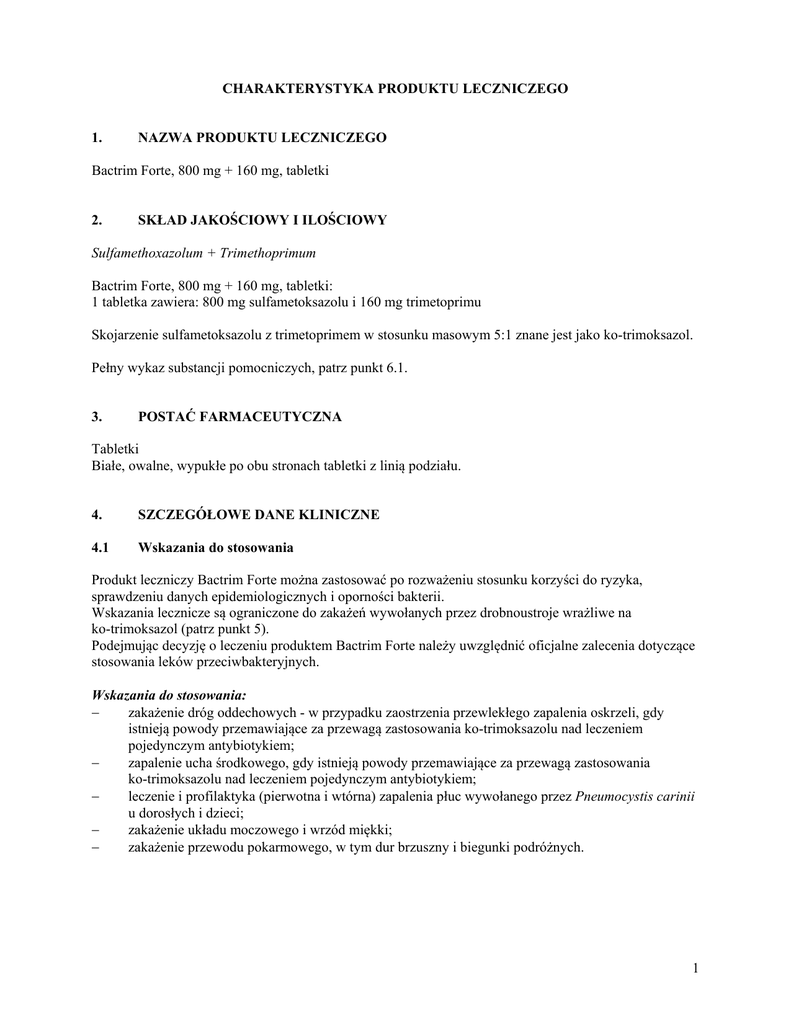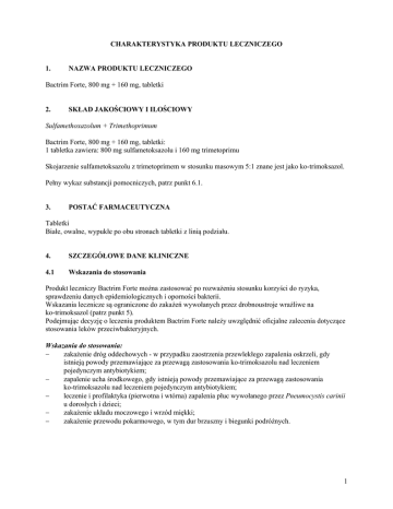 CHARAKTERYSTYKA PRODUKTU LECZNICZEGO 1. NAZWA PRODUKTU LECZNICZEGO Bactrim Forte, 800 mg + 160 mg, tabletki 2. SKŁAD JAKOŚCIOWY I ILOŚCIOWY Sulfamethoxazolum + Trimethoprimum Bactrim Forte, 800 mg + 160 mg, tabletki: 1 tabletka zawiera: 800 mg sulfametoksazolu i 160 mg trimetoprimu Skojarzenie sulfametoksazolu z trimetoprimem w stosunku masowym 5:1 znane jest jako ko-trimoksazol. Pełny wykaz substancji pomocniczych, patrz punkt 6.1. 3. POSTAĆ FARMACEUTYCZNA Tabletki Białe, owalne, wypukłe po obu stronach tabletki z linią podziału. 4. SZCZEGÓŁOWE DANE KLINICZNE 4.1 Wskazania do stosowania Produkt leczniczy Bactrim Forte można zastosować po rozważeniu stosunku korzyści do ryzyka, sprawdzeniu danych epidemiologicznych i oporności bakterii. Wskazania lecznicze są ograniczone do zakażeń wywołanych przez drobnoustroje wrażliwe na ko-trimoksazol (patrz punkt 5). Podejmując decyzję o leczeniu produktem Bactrim Forte należy uwzględnić oficjalne zalecenia dotyczące stosowania leków przeciwbakteryjnych. Wskazania do stosowania: zakażenie dróg oddechowych - w przypadku zaostrzenia przewlekłego zapalenia oskrzeli, gdy istnieją powody przemawiające za przewagą zastosowania ko-trimoksazolu nad leczeniem pojedynczym antybiotykiem; zapalenie ucha środkowego, gdy istnieją powody przemawiające za przewagą zastosowania ko-trimoksazolu nad leczeniem pojedynczym antybiotykiem; leczenie i profilaktyka (pierwotna i wtórna) zapalenia płuc wywołanego przez Pneumocystis carinii u dorosłych i dzieci; zakażenie układu moczowego i wrzód miękki; zakażenie przewodu pokarmowego, w tym dur brzuszny i biegunki podróżnych. 1 4.2 Dawkowanie i sposób podawania Uwaga: Jeśli w celu uzyskania zalecanej dawki konieczne jest jednorazowe podanie połowy tabletki produktu Bactrim Forte lub jeszcze mniejszej dawki, zwłaszcza u dzieci, można zastosować produkt Bactrim, 400 mg + 80 mg, tabletki lub Bactrim, (200 mg + 40 mg)/5 ml, syrop. Dawkowanie Dorośli i dzieci powyżej 12 lat z prawidłową czynnością nerek 1 tabletka produktu Bactrim Forte podawana co 12 godzin. W przypadku ciężkich zakażeń dawkę tę można zwiększyć do 1,5 tabletki produktu Bactrim Forte podawane co 12 godzin. Dawka minimalna w przypadku długotrwałego leczenia (powyżej 14 dni) to ½ tabletki Bactrim Forte podawane co 12 godzin. W przypadku ostrych zakażeń Bactrim Forte należy podawać przez co najmniej 5 dni lub do momentu, gdy u pacjenta przez co najmniej 2 dni nie będą już występowały objawy zakażenia. Jeśli po 7-dniowym leczeniu nie nastąpi kliniczna poprawa, należy ponownie ocenić stan pacjenta. Leczenie wrzodu miękkiego 1 tabletka produktu Bactrim Forte podawana dwa razy na dobę. Jeśli po 7 dniach nie będzie widocznych oznak poprawy, należy rozważyć podawanie leku przez kolejne 7 dni. Jednak należy zdawać sobie sprawę, iż brak reakcji na leczenie może oznaczać, że choroba jest wywołana przez szczepy oporne. Leczenie dawką pojedynczą w niepowikłanym, ostrym zapaleniu dróg moczowych u kobiet 2 do 3 tabletek produktu Bactrim Forte stosowanych jednorazowo, przyjmowanych w miarę możliwości wieczorem po kolacji lub przed snem. Dawkowanie u osób poddawanych hemodializom Po podaniu zwykłych dawek nasycających, należy podawać co 24-48 godzin połowę lub jedną trzecią dawki początkowej jako dawki podtrzymujące. Zapalenie płuc wywołane przez Pneumocystis carinii W leczeniu należy stosować dawkę nie wyższą niż 100 mg/kg mc./dobę sulfametoksazolu i 20 mg/kg mc./dobę trimetoprimu w równych dawkach podzielonych podawanych co 6 godzin, przez 14 dni. Tabela 1. Maksymalne dawki produktu Bactrim Forte w zależności od masy ciała pacjentów z zapaleniem płuc wywołanym przez Pneumocystis carinii. Masa ciała Dawka podawana co 6 godzin [kg] [tabletki] 16 -* 24 -* 32 1 40 -* 48 1i½ 64 2 80 2i½ * W celu uzyskania odpowiedniej maksymalnej dawki można zastosować produkt Bactrim, 400 mg + 80 mg, tabletki lub Bactrim, (200 mg + 40 mg)/5 ml, syrop. 2 W profilaktyce zapalenia płuc wywołanego przez Pneumocystis carinii zalecana dawka u młodzieży i dorosłych to 1 tabletka produktu Bactrim Forte raz na dobę. Wyniki badania przeprowadzonego u pacjentów zakażonych wirusem HIV wskazują również na skuteczność zastosowania ½ tabletki produktu Bactrim Forte raz na dobę. Nie określono optymalnej dawki profilaktycznej produktu. Do stosowania u dzieci przeznaczony jest produkt Bactrim w postaci tabletek lub syropu. Szczegółowe dawkowanie – patrz Charakterystyka Produktu Leczniczego Bactrim, 400 mg + 80 mg, tabletki lub Bactrim, (200 mg + 40 mg)/5 ml, syrop. Dawkowanie u osób z niewydolnością nerek Zalecany schemat dawkowania u pacjentów z niewydolnością nerek: Klirens kreatyniny > 30 ml/min: standardowe dawkowanie. Klirens kreatyniny 15 – 30 ml/min: połowa standardowej dawki. Klirens kreatyniny < 15 ml/min: nie zaleca się stosowania produktu Bactrim Forte. Dawkowanie u osób w podeszłym wieku U pacjentów w podeszłym wieku z prawidłową czynnością nerek należy stosować takie dawki, jak zalecane u dorosłych. Sposób podawania Podanie doustne. Najkorzystniej jest przyjmować produkt po posiłku z odpowiednią ilością płynów. 4.3 Przeciwwskazania Bactrim Forte jest bezwzględnie przeciwwskazany: u pacjentów z nadwrażliwością na substancje czynne lub na którąkolwiek substancję pomocniczą wymienioną w punkcie 6.1; u pacjentów z istotnym uszkodzeniem miąższu wątroby; u pacjentów z ciężką niewydolnością nerek, kiedy nie można monitorować stężenia leku w osoczu krwi; w skojarzeniu z dofetylidem (patrz punkt 4.5); u dzieci do 6. tygodnia życia. 4.4 Specjalne ostrzeżenia i środki ostrożności dotyczące stosowania W razie pojawienia się wysypki skórnej lub innych ciężkich działań niepożądanych, należy natychmiast przerwać stosowanie leku. Należy zachować szczególną ostrożność podczas stosowania 