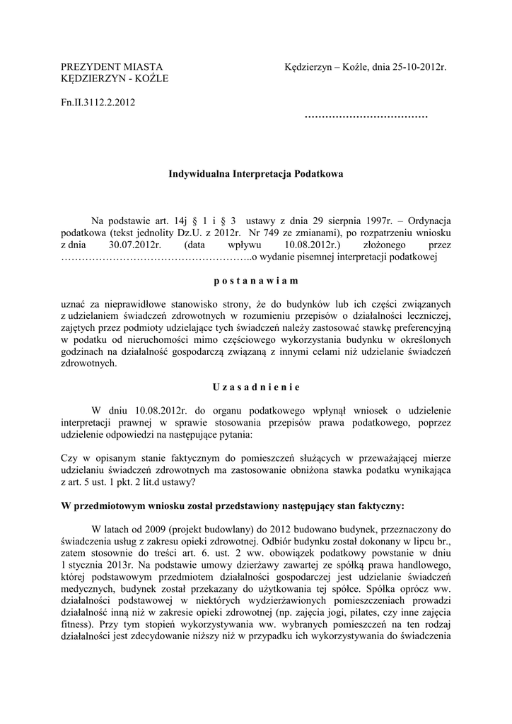 PREZYDENT MIASTA KĘDZIERZYN - KOŹLE Kędzierzyn – Koźle, dnia 25-10-2012r. Fn.II.3112.2.2012 ……………………………… Indywidualna Interpretacja Podatkowa Na podstawie art. 14j § 1 i § 3 ustawy z dnia 29 sierpnia 1997r. – Ordynacja podatkowa (tekst jednolity Dz.U. z 2012r. Nr 749 ze zmianami), po rozpatrzeniu wniosku z dnia 30.07.2012r. (data wpływu 10.08.2012r.) złożonego przez ………………………………………………..o wydanie pisemnej interpretacji podatkowej postanawiam uznać za nieprawidłowe stanowisko strony, że do budynków lub ich części związanych z udzielaniem świadczeń zdrowotnych w rozumieniu przepisów o działalności leczniczej, zajętych przez podmioty udzielające tych świadczeń należy zastosować stawkę preferencyjną w podatku od nieruchomości mimo częściowego wykorzystania budynku w określonych godzinach na działalność gospodarczą związaną z innymi celami niż udzielanie świadczeń zdrowotnych. Uzasadnienie W dniu 10.08.2012r. do organu podatkowego wpłynął wniosek o udzielenie interpretacji prawnej w sprawie stosowania przepisów prawa podatkowego, poprzez udzielenie odpowiedzi na następujące pytania: Czy w opisanym stanie faktycznym do pomieszczeń służących w przeważającej mierze udzielaniu świadczeń zdrowotnych ma zastosowanie obniżona stawka podatku wynikająca z art. 5 ust. 1 pkt. 2 lit.d ustawy? W przedmiotowym wniosku został przedstawiony następujący stan faktyczny: W latach od 2009 (projekt budowlany) do 2012 budowano budynek, przeznaczony do świadczenia usług z zakresu opieki zdrowotnej. Odbiór budynku został dokonany w lipcu br., zatem stosownie do treści art. 6. ust. 2 ww. obowiązek podatkowy powstanie w dniu 1 stycznia 2013r. Na podstawie umowy dzierżawy zawartej ze spółką prawa handlowego, której podstawowym przedmiotem działalności gospodarczej jest udzielanie świadczeń medycznych, budynek został przekazany do użytkowania tej spółce. Spółka oprócz ww. działalności podstawowej w niektórych wydzierżawionych pomieszczeniach prowadzi działalność inną niż w zakresie opieki zdrowotnej (np. zajęcia jogi, pilates, czy inne zajęcia fitness). Przy tym stopień wykorzystywania ww. wybranych pomieszczeń na ten rodzaj działalności jest zdecydowanie niższy niż w przypadku ich wykorzystywania do świadczenia usług medycznych (zajęcia na cele inne niż udzielanie świadczeń zdrowotnych może wynosić w różnych okresach od kilku do kilkunastu, maksymalnie ok. 20% czasu pracy). Przedstawiając własne stanowisko w sprawie wnioskodawca wskazuje na treść art. 5 ust. 1 pkt 2 lit. d ustawy z dnia 12.01.1991r. o podatkach i opłatach lokalnych, który stanowi, że od budynków lub ich części, związanych z udzielaniem świadczeń zdrowotnych w rozumieniu przepisów o działalności leczniczej, zajętych przez podmioty udzielające tych świadczeń pobiera się obniżoną stawkę podatku od nieruchomości. Powołując się na wykładnię gramatyczną przepisu wnioskodawca stwierdził, iż sporadyczne lub nawet powtarzalne, lecz nieistotne czy wręcz marginalne czasowo wykorzystanie na inne cele niż świadczenie usług zdrowotnych pozbawia podatnika prawa do obniżonej stawki, wobec czego należy przyjąć że ta obniżona stawka ma tu zastosowanie. Następnie wnioskodawca stwierdza, iż przepis nie wymaga by takie pomieszczenia musiały być związane tylko i wyłącznie z udzielaniem świadczeń zdrowotnych ani by podmiot zajmujący te pomieszczenia prowadził działalność wyłącznie w zakresie udzielania tych świadczeń. Za takim stanowiskiem zdaniem wnioskodawcy przemawia również wykładnia celowościowa przepisu. Gdyby bowiem sporadycznie wykorzystanie budynków lub ich części służących zasadniczo udzielaniu świadczeń zdrowotnych, choćby w minimalnym stopniu, do innych celów miało pozbawić prawa do obniżonej stawki, nie zostałby osiągnięty cel przyświecający ustawodawcy, jakim było niewątpliwie stwarzanie warunków do poszerzania bazy świadczenia usług zdrowotnych, tym samym ochrony zdrowia obywateli. Utrata korzyści w postaci obniżonej stawki podatku od nieruchomości byłaby bowiem de facto nieprzymierzoną sankcją za uzupełniające wykorzystanie budynku lub jego części do innych celów. Dokonując oceny prawnej stanowiska wnioskodawcy, organ podatkowy zważył co następuje: Zasady opodatkowania podatkiem od nieruchomości reguluje ustawa o podatkach i opłatach lokalnych. Opodatkowaniu podatkiem według najwyższych stawek (dla przedmiotów opodatkowania związanych z prowadzeniem działalności gospodarczej) podlegają wszystkie grunty, budynki i budowle znajdujące się w posiadaniu przedsiębiorcy (art. 1a ust. 1 pkt 3 u.p.o.l.). Według opisanego stanu faktycznego mamy do czynienia niewątpliwie z przedsiębiorcą. Na podstawie art. 5 ust. 1 pkt 2 lit. d), budynki lub ich części, związane z udzielaniem świadczeń zdrowotnych w rozumieniu przepisów o działalności leczniczej, zajęte przez podmioty udzielające tych świadczeń korzystają z odrębnej stawki podatku od nieruchomości. Ta stawka podatkowa jest "preferencyjna" w stosunku do generalnej stawki obowiązującej przedsiębiorców zawartej w art. 5 ust. 1 pkt 2 lit. b) ustawy o podatkach i opłatach lokalnych - budynki związane z prowadzeniem działalności gospodarczej. W obecnym brzmieniu art. 5 ust. 1 pkt 2 lit. d) aby skorzystać z preferencyjnej stawki podatku od nieruchomości muszą zostać spełnione łącznie dwie przesłanki. Pierwsza dotyczy posiadania uprawnień do udzielania świadczeń zdrowotnych, druga natomiast dotyczy przedmiotu opodatkowania, który powinien być związany z prowadzeniem działalności gospodarczej w zakresie udzielania świadczeń zdrowotnych, zajętych przez podmioty udzielające tych świadczeń. Dla wyjaśnienia jakie części budynku mogą korzystać z ww. preferencji niezbędne jest wskazanie co należy 