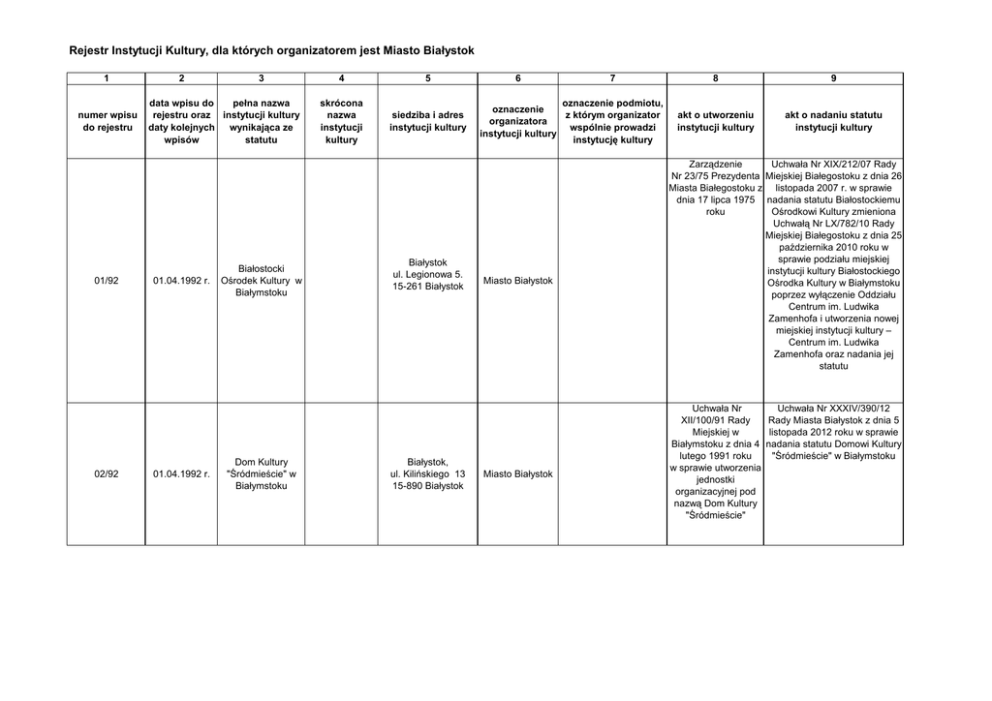 Rejestr Instytucji Kultury, dla których organizatorem jest Miasto Białystok 1 numer wpisu do rejestru 01/92 02/92 2 3 pełna nazwa data wpisu do rejestru oraz instytucji kultury wynikająca ze daty kolejnych wpisów statutu 01.04.1992 r. 01.04.1992 r. Białostocki Ośrodek Kultury w Białymstoku Dom Kultury "Śródmieście" w Białymstoku 4 5 skrócona nazwa instytucji kultury siedziba i adres instytucji kultury Białystok ul. Legionowa 5. 15-261 Białystok Białystok, ul. Kilińskiego 13 15-890 Białystok 6 7 oznaczenie podmiotu, oznaczenie z którym organizator organizatora wspólnie prowadzi instytucji kultury instytucję kultury Miasto Białystok Miasto Białystok 8 9 akt o utworzeniu instytucji kultury akt o nadaniu statutu instytucji kultury Zarządzenie Nr 23/75 Prezydenta Miasta Białegostoku z dnia 17 lipca 1975 roku Uchwała Nr XIX/212/07 Rady Miejskiej Białegostoku z dnia 26 listopada 2007 r. w sprawie nadania statutu Białostockiemu Ośrodkowi Kultury zmieniona Uchwałą Nr LX/782/10 Rady Miejskiej Białegostoku z dnia 25 października 2010 roku w sprawie podziału miejskiej instytucji kultury Białostockiego Ośrodka Kultury w Białymstoku poprzez wyłączenie Oddziału Centrum im. Ludwika Zamenhofa i utworzenia nowej miejskiej instytucji kultury – Centrum im. Ludwika Zamenhofa oraz nadania jej statutu Uchwała Nr XXXIV/390/12 Uchwała Nr Rady Miasta Białystok z dnia 5 XII/100/91 Rady listopada 2012 roku w sprawie Miejskiej w Białymstoku z dnia 4 nadania statutu Domowi Kultury "Śródmieście" w Białymstoku lutego 1991 roku w sprawie utworzenia jednostki organizacyjnej pod nazwą Dom Kultury "Śródmieście" 03/92 25.05.1992 r. Galeria im. Sleńdzińskich w Białymstoku Białystok ul. Waryńskiego 24 a Miasto Białystok 15-461Białystok 04/94 01.01.1994 r. Muzeum Wojska w Białymstoku Białystok ul. Kilińskiego 7 15-089 Białystok Miasto Białystok 05/94 01.01.1994 r. Galeria „Arsenał” w Białymstoku Białystok ul. Mickiewicza 2 15-222 Białystok Miasto Białystok 06/99 01.01.1999 r. Białostocki Teatr Lalek BTL Białystok ul. Kalinowskiego 1 15-875 Białystok Miasto Białystok Uchwała Nr XXXV/342/92 Rady Miejskiej w Białymstoku z dnia 25 maja 1992 roku w sprawie powołania Galerii im. Sleńdzińskich Zarządzenie Wojewody Białostockiego nr 34/76 z 30.06.1976 r. Uchwała Nr LX/784/10 Rady Miejskiej Białegostoku z dnia 25 października 2010 r. w sprawie nadania statutu Galerii im. Sleńdzińskich w Białymstoku Uchwała Nr XLVII/586/09 Rady Miejskiej Białegostoku z dnia 26 października 2009 roku w sprawie nadania statutu Muzeum Wojska w Białymstoku zmieniona Uchwałą nr XVIII/163/11 Rady Miejskiej Białegostoku z dnia 28 listopada 2011 r.w sprawie zmiany statutu Muzeum Wojska w Białymstoku Uchwała Prezydium Uchwała nr XIX/213/07 Rady WRN nr 14/95/65 z Miejskiej Białegostoku z dnia 26 listopada 2007 r. w sprawie dnia 14.04.1965 roku nadania statutu Galerii Arsenał w Białymstoku Zarządzenie nr 75/59 Uchwała Nr XXV/255/12 Rady Prezydium WRN w Miejskiej Białegostoku z dnia 26 Białymstoku z dnia marca 2012 roku w sprawie 30.12.1959 r. nadania statutu Białostockiemu Teatrowi Lalek w Białymstoku 07/11 01.01.2011 r. Centrum im. Ludwika Zamenhofa w Białymstoku Białystok ul. Warszawska 19 15-062 Białystok Miasto Białystok Uchwała nr LX/782/10 Rady Miejskiej Białegostoku z dnia 25 października 2010 r. w sprawie podziału miejskiej instytucji kultury Białostockiego Ośrodka Kultury w Białymstoku poprzez wyłączenie Oddziału Centrum im. Ludwika Zamenhofa i utworzenia nowej miejskiej instytucji kultury - Centrum im. Ludwika Zamenhofa oraz nadania jej statutu Uchwała nr LX/782/10 Rady Miejskiej Białegostoku z dnia 25 października 2010 r. w sprawie podziału miejskiej instytucji kultury Białostockiego Ośrodka Kultury w Białymstoku poprzez wyłączenie Oddziału Centrum im. Ludwika Zamenhofa i utworzenia nowej miejskiej instytucji kultury - Centrum im. Ludwika Zamenhofa oraz nadania jej statutu