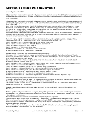 Spotkanie z okazji Dnia Nauczyciela środa, 16 października 2013 15 października w miechowskim magistracie odbyło się uroczyste spotkania z okazji Dnia Edukacji Narodowej z dyrektorami, gronem pedagogicznym gminnych placówek oświatowych. W spotkaniu uczestniczyli również przedstawiciele niepublicznych szkół i przedszkoli. 15 października w miechowskim magistracie odbyło się uroczyste spotkania z okazji Dnia Edukacji Narodowej z dyrektorami, gronem pedagogicznym gminnych placówek oświatowych. W spotkaniu uczestniczyli również przedstawiciele niepublicznych szkół i przedszkoli. Jerzy Pułka, dyrektor Samorządowego Zespołu Edukacji powitał zebranych gości wśród których znaleźli się m.in. Dariusz Marczewski, Burmistrz Gminy i Miasta Miechów, Zenon Czekaj – V-ce Przewodniczący Rady Miejskiej , Helena Kruszec -Przewodnicząca Komisji Oświaty Rady Miejskiej, Czesław Gamrat, szef miechowskiej delegatury „Solidarność” oraz Adam Pituch, przedstawiciel Związku Nauczycieli Rzeczypospolitej. Dariusz Marczewski podziękował wszystkim osobom, które budują miechowską oświatę za codzienną troskę o rozwój dzieci i młodzieży, za zaangażowanie które obserwuje na co dzień oraz za podnoszenie jakości kształcenia – Można stwierdzić, że nauczanie jest powołaniem i służbą – mówił. Burmistrz wręczył nagrody nauczycielom, którzy w sposób szczególny wyróżniają się swoją pracą i osiągają sukcesy zawodowe: Gimnazjum Nr 1 w Miechowie: Dorota Gajos, Dorota Małodobry, Stanisław Kara Szkoła Podstawowa Nr 1 w Miechowie: Ewelina Kobylec, Jadwiga Płaszewska Szkoła Podstawowa Nr 2 w Miechowie : Wioletta Zielonka, Jacek Banasik Szkoła Podstawowa w Jaksicach : Beata Krochmal Szkoła Podstawowa w Pojałowicach : Beata Kluza Przedszkole Samorządowe Nr 1 w Miechowie : Beata Szlachowska Przedszkole Samorządowe Nr 3 w Miechowie : Anna Korwat Dyrektorzy szkół i przedszkoli wręczyli nagrody następującym osobom: Gimnazjum Nr 1 w Miechowie: Jolanta Bogacz, Agnieszka Czarnecka, Danuta Dudzik –Pycia, Ewelina Faracik, Wioletta Ignatowicz, Jacek Jurkowski, Małgorzata Kałwa, Alina Kmita, Piotr Król, Marek Podyma, Dariusz Skrzyniarz, Urszula Stańczyk, Anna Stępień, Marta Szarek, Maria Włosek Szkoła Podstawowa Nr 1 w Miechowie: Barbara Adamska, Lidia Baranowska, Anna Gortal, Bożena Kowalczyk, Urszula Kurczych-Stawiarska, Krzysztof Świerczek, Szkoła Podstawowa Nr 2 w Miechowie: Mirosław Czekaj, Elżbieta Łojan, Mariola Naziemiec, Anna Horyń, Andrzej Manterys, Szkoła Podstawowa w Jaksicach: Beata Makowska, Renata Zięba Szkoła Podstawowa w Pojałowicach: Urszula Suss, Krystyna Wypych, Iwona Czekaj Szkoła Podstawowa w Bukowskiej Woli: Halina Stasiurka, Marta Śliwińska, Małgorzata Zawartka Szkoła Podstawowa w Pstroszycach: Agata Płuciennik, Małgorzata Bogusz, Jan Górzyński, Przedszkole Samorządowe Nr 1 w Miechowie: Wioletta Dziodzio, Wiesława Książęk, Przedszkole Samorządowe Nr 2 w Miechowie: Aneta Hałas, Lidia Nowakowska Przedszkole Samorządowe Nr 3 w Miechowie: Agata Zegan, Aleksandra Mazur – Kosińska, Agnieszka Siejka Gratulacje otrzymały osoby odznaczone nagrodami państwowymi: - medalem za długoletnią służbę w 2013 r.: Mirosława Otwinowska pracownik Gimnazjum Nr 1 w Miechowie - medal złoty, Mariola Sosnowska nauczyciel Gimnazjum Nr 1 w Miechowie – medal srebrny. - Brązowym Krzyżem Zasługi w 2013 r. : Mateusz Sobecki - nauczyciel Gimnazjum Nr 1 w Miechowie, Maria Włosek nauczyciel Gimnazjum Nr 1 w Miechowie. Nagrodę Małopolskiego Kuratora Oświaty w 2013 r. otrzymał Pan Mateusz Sobecki – nauczyciel Gimnazjum Nr 1 w Miechowie. Podczas spotkania odbyło się ślubowanie nauczycieli, którzy zdali egzamin na stopień awansu zawodowego na nauczyciela mianowanego. Akty nadania otrzymali: Anna Stępień –nauczyciel Gimnazjum Nr 1 w Miechowie, Joanna Dróżdż – nauczyciel Gimnazjum Nr 1 w Miechowie. Na zakończenie spotkania uczniowie zaprezentowali program artystyczny. Wystąpili: - Antoni Kawecki uczeń 6 klasy Szkoły Podstawowej nr 2 w Miechowie i 6 klasy Państwowej Szkoły Muzycznej I stopnia w Miechowie. Laureat konkursów ogólnopolskich i międzynarodowych. Od 2011 roku podopieczny Krajowego Funduszu na rzecz Dzieci. Jest stypendystą Fundacji BieleckiArt. W maju 2014r. będzie zdawał egzamin wstępny do Szkoły Talentów im. Zenona Brzeskiego w Warszawie. - Patrycja Słodowska, Kamila Krzykawska i Patryk Zielonka z Sz.P.Nr 1, Finaliści festiwali wojewódzkich, ogólnopolskich i międzynarodowych. Opiekun wokalny Pani Lidia Baranowska. Urząd Gminy i Miasta ul. H. Sienkiewicza 25, 32 - 200 Miechów Strona 1 z 2 - Uczniowie Gimnazjum Nr 1 występują w przedstawieniu wokalno muzycznym i teatralnym pod opieką Doroty Małodobry. W bieżącym roku szkolny na terenie Gminy i Miasta Miechów funkcjonuje 10 placówek oświatowych dla których organem prowadzącym jest gmina Miechów : sześć szkół podstawowych, jedno gimnazjum, trzy przedszkola samorządowe oraz 6 placówek niepublicznych. W placówkach dla których organem prowadzącym jest Gmina zatrudnionych jest 243 nauczycieli, 1501 uczniów i 409 przedszkolaków. Oświata to również główna pozycja w budżecie samorządu. Ogółem w 2012 roku wydano prawie 19 mln zł. W bieżącym roku w ramach pozyskanej dotacji ze środków europejskich wyposażono pracownie komputerowe gminnych szkół w nowoczesny sprzęt. Od grudnia ubiegłego roku Gmina umożliwiła dzieciom z przedszkoli, szkół podstawowych i gimnazjum lekcje nauki pływania w ramach zajęć wychowania fizycznego. Łącznie ponad 1500 dzieci w każdym tygodniu odwiedza pływalnię. Tekst pochodzi ze strony: http://www.miechow.eu/miasto-i-gmina/aktualnosci/spotkanie-z-okazji-dnia-nauczyciela_3986/ Urząd Gminy i Miasta ul. H. Sienkiewicza 25, 32 - 200 Miechów Strona 2 z 2