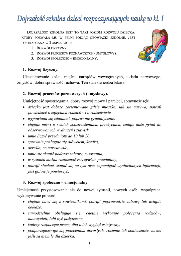 DOJRZAŁOŚĆ SZKOLNA JEST TO TAKI POZIOM ROZWOJU DZIECKA, KTÓRY POZWALA MU W PEŁNI PODJĄĆ OBOWIĄZKI SZKOLNE. JEST POSTRZEGANA W 3 ASPEKTACH: 1. ROZWÓJ FIZYCZNY. 2. ROZWÓJ PROCESÓW POZNAWCZYCH (UMYSŁOWY). 3. ROZWÓJ SPOŁECZNO – EMOCJONALNY. 1. Rozwój fizyczny. Ukształtowanie kości, mięśni, narządów wewnętrznych, układu nerwowego, zmysłów, dobra sprawność ruchowa. Ten stan stwierdza lekarz. 2. Rozwój procesów poznawczych (umysłowy). Umiejętność spostrzegania, dobry rozwój mowy i pamięci, sprawność ręki: dziecko jest dobrze zorientowane gdzie mieszka, jak się nazywa, potrafi powiedzieć o zajęciach rodziców i o rodzeństwie, wypowiada się zdaniami, poprawnie gramatycznie, chętnie mówi o swoich spostrzeżeniach, przeżyciach, zadaje dużo pytań nt. obserwowanych wydarzeń i zjawisk, umie liczyć przedmioty do 10 lub 20, sprawnie posługuje się ołówkiem, kredką, określa, co narysowało, umie się skupić podczas zabawy, rysowania, w rysunku można rozpoznać rzeczywiste przedmioty, potrafi słuchać, skupić się na tym oraz zapamiętać wysłuchanych informacji, jest gotów je powtórzyć. 3. Rozwój społeczno – emocjonalny. Umiejętność przystosowania się do nowej sytuacji, nowych osób, współpraca, wykonywanie poleceń: chętnie bawi się z rówieśnikami, potrafi poprowadzić zabawę lub ustąpić koledze, samodzielnie obsługuje się, chętnie wykonuje polecenia rodziców, nauczycieli, lubi być pożyteczne, kończy rozpoczęte prace, dba o ich wygląd estetyczny, podporządkowuje się poleceniom dorosłych, rozumie ich konieczność, nawet jeśli są niemiłe dla dziecka, 1 współpracuje z kolegami i prowadzącym zajęcia, jest troskliwy i opiekuńczy wobec innych, staje w obronie pokrzywdzonych, wyjaśnia i tłumaczy zachowanie swoje i innych, jeżeli stały się one przyczyna konfliktów. DZIAŁANIA, JAKIE MOŻNA PODJĄĆ W CELU PODNIESIENIA POZIOMU ROZWOJU DZIECKA LUB UZUPEŁNIENIA BRAKÓW. Rozwój procesów poznawczych. pomoc rodziców w poznawaniu świata na co dzień: w czasie codziennych zajęć, wyjścia do sklepu, wyjazdu do miasta – odpowiadanie na pytania dziecka i wzbudzanie jego zainteresowań; zabawy rozwijające mowę i myślenie: o rozmowy na temat obrazków, historyjek obrazkowych, zagadki, o zabawy w sklep, powtarzanie nazw (klient, kelner), o rysowanie: wyżej, niżej, w lewo, w prawo, o loteryjki obrazkowe, domina, o wyszukiwanie różnic. zabawy, gry, konkursy wdrażające do obserwacji otoczenia, rozwijające spostrzegawczość i koordynację wzrokowo – ruchową: o co się zmieniło (zmiana szczegóły w ubraniu, otoczeniu, położeniu) – ma zauważyć różnicę, o błąd w opowiadaniu (dziecko zna poprawną wersję i ma zauważyć błąd), o analiza treści obrazka (co jest na nim, ile, jak położone względem siebie) , wersja trudniejsza - dziecko ogląda a potem zasłaniamy obrazek, o opowiadanie historyjek obrazkowych, o obserwacja otoczenia podczas spaceru (pytania do tego), o rozpoznawanie dźwięków, śpiewu ptaków, o domina obrazkowo – wyrazowe, o rozpoznawanie przedmiotu za pomocą dotyku. zabawy i gry rozwijające sprawność rąk: o lepienie z plasteliny, o wycinanie, o wydzieranie, o tworzenie szlaczków, o nawlekanie koralików. 2 inne zabawy: o odpowiedzi „jak w szkole?” całym zdaniem, o zabawa w reportera (co się wydarzyło na podwórku, w sklepie, u babci) – poprawność zdań, spostrzegawczość, zgodność z faktami, o układanie wyrazów z wyprawki (zaczynających się od jakiejś litery, z tą literą, z określonej liczby liter), o rozsypanki, sylabowe, wyrazowe, zdaniowe, układanki, mozaiki, puzle, o gry planszowe. Kształtowanie pożytecznych nawyków i przyzwyczajeń stosownie do wieku – konsekwencja postępowania. pozwolić dziecku na podjęcie obowiązków, lub dać obowiązek, jeżeli samo nie wykazuje inicjatywy – nie żałować pochwał: o sprzątanie po sobie ubrań, zabawek, o karmienie zwierzątka domowego, o wycieranie naczyń, o podlewanie kwiatków, o ścieranie kurzu, zamiatanie, o nakrywanie do stołu, o opieka nad młodszym rodzeństwem. o prawidłowy rozkład dnia (sen ok. 12 godz.): o miejsce do nauki i przechowywania swoich rzeczy, o czas wyznaczony na zabawę, naukę, obowiązki, o zapraszanie kolegów do domu, o ograniczony czas oglądanie telewizji, o obecność rodzica przy odrabianiu zadań. pozytywne nastawienie do szkoły i kolegów: o nieporozumienia dorosłych nie powinny rzutować na postawy dzieci względem siebie, o okazywanie uczuć dziecku, tego że jest ważne i kochane, nawet, gdy zasłuży na krytykę, o tłumaczyć normy zachowania, kultury, grzeczności i przestrzegać ich w domu, o uczyć szacunku do innych (starszych i rówieśników). …TAK POWINNO BYĆ KAŻDEGO RANKA! Z RODZICAMI ŻEGNAMY SIĘ JUŻ W SZATNI I SAMODZIELNIE PRZEKRACZAMY PRÓG KLASY. POWODZENIA W PIERWSZEJ KLASIE … 3