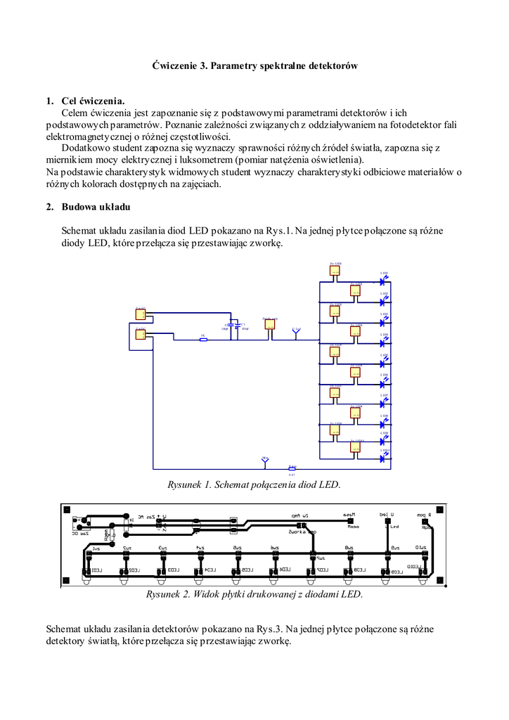 Ćwiczenie 3. Parametry spektralne detektorów 1. Cel ćwiczenia. Celem ćwiczenia jest zapoznanie się z podstawowymi parametrami detektorów i ich podstawowych parametrów. Poznanie zależności związanych z oddziaływaniem na fotodetektor fali elektromagnetycznej o różnej częstotliwości. Dodatkowo student zapozna się wyznaczy sprawności różnych źródeł światła, zapozna się z miernikiem mocy elektrycznej i luksometrem (pomiar natężenia oświetlenia). Na podstawie charakterystyk widmowych student wyznaczy charakterystyki odbiciowe materiałów o różnych kolorach dostępnych na zajęciach. 2. Budowa układu Schemat układu zasilania diod LED pokazano na Rys.1. Na jednej płytce połączone są różne diody LED, które przełącza się przestawiając zworkę. 1 2 Zw LED1 L ED1 1 2 Zw LED2 L ED2 Zw LED3 Z as A C 1 2 2 1 Zw LED4 U Le d 1 2 C1 470uF 1 2 Z as D C 2 1 L ED3 Zworka a mp C2 100pF 1K L ED4 1 2 Zw LED5 L ED5 1 2 Zw LED6 L ED6 1 2 Zw LED7 L ED7 1 2 Zw LED8 L ED8 1 2 Zw LED9 L ED9 1 2 Zw LED10 L ED10 Ma sa R pom 0.47 Rysunek 1. Schemat połączenia diod LED. Rysunek 2. Widok płytki drukowanej z diodami LED. Schemat układu zasilania detektorów pokazano na Rys.3. Na jednej płytce połączone są różne detektory światłą, które przełącza się przestawiając zworkę. Rysunek 3. Schemat połączenia detektorów. Rysunek 4. Widok płytki drukowanej z detektorami. 3. Przygotowanie do zajęć. Przygotowanie do zajęć szacuje się na 1 do 3 godzin. 3.1. Materiały źródłowe. [1] Wykład z Optoelektroniki. [2] A. Pawlaczyk, „Elementy i układy optoelektroniczne”, WKiŁ, Warszawa 1984, strony: 15-21, 60-105. [3] M. Rusek, J. Pasierbiński, „Elementy i układy elektroniczne w pytaniach i odpowiedziach”, WNT, Warszawa, 1991, strony: 181-201. [4] U. Tietrze, Ch. Schenk, Układy półprzewodnikowe, WNT, Warszawa, 1996, strony: 128-129. [5] K. Booth, S. Hill, Optoelektronika, WKiŁ, Warszawa, 2001, strony: 16-20, 158-189, 238-240. [6] B. Ziętek, Optoelektronika, WUMK, Toruń 2005, strony: 443-477 3.2. Pytania kontrolne. 1. Rozkład widmowy promieniowania elektromagnetycznego, długość fali a częstotliwość 2. Podstawowe jednostki świetlne i energetyczne promieniowania: Natężenie napromieniowania, Natężenie promieniowania, Strumień świetlny, Natężenie oświetlenia, Światłość, Luminancja (jasność) 3. Zależność prądy diody LED od emitowanej mocy fali świetlnej 4. Charakterystyki widmowe diody krzemowej, germanowej i oka ludzkiego. 5. Czułość detektorów a długość fali świetlnej 6. Szybkość działania detektorów a długość fali świetlnej 7. Sprawność różnych źródeł światła 4. Przebieg ćwiczenia 4.1. Dokończyć pomiary z ćwiczenia 2. 4.2. Pomiar sprawności różnych źródeł światła (wszystkie grupy wykonują pomiar na 1 stanowisku – Instrukcja 3A) 4.3. Pomiar charakterystyk odbiciowych dla różnych illuminantów i różnych kolorów (warstw odbijających światło) 5. Wnioski Sprawozdanie powinno zawierać: 1. Tabelę z wynikami pomiarów maksymalnych częstotliwości pracy, czasów narostu i czasów opadania diod LED (Tabela 1.) 2. Tabelę z wynikami pomiarów maksymalnych częstotliwości pracy, czasów narostu i czasów opadania detektorów (Tabela 2.) 3. Charakterystyki widmowe różnych źródeł światła. 4. Charakterystyki odbiciowe dla poszczególnych kolorów przy różnym oświetleniu (różne illuminanty) 5. Wnioski i spostrzeżenia. • Szybkości działania diod • Szybkości działania detektorów • Zakresy spektralne detektorów • Czułości detektorów • Porównanie widm różnych źródeł światła • Porównanie koloru (charakterystyk widmowych) przy różnym oświetleniu Tabela 3. Tabela pomiarowa dla wyznaczenia sprawności różnych źródeł światła. P omiar mocy optycznej Φ e Źródła światła Ż. rtęciowa Ż. sodowa Ż. żarowa Ż. Diodowa Ż. Halogen. Świetl. En.oszczędn a P obierana moc elektryczna [W] Emitancja E=[Lux] Powierz. S=[cm 2 ] Strum. Świetlny Φ=[Lm] Jaskrawość monochr. Km=[Lm/W] Moc optyczna Φe=[W] Sprawność η Ćwiczenie 3A – pomiar sprawności różnych źródeł światła Pomiary przeprowadzamy na oddzielnym stanowisku – czas pomiarów: nie więcej niż 20 minut (stanowisku musi być dostępne dla wszystkich grup laboratoryjnych). 1. Pomiar mocy jaką pobiera źródło światła. 1.1. Zasilanie badanego źródła światła podłączyć przez dostępny na stanowisku „Power Analyzer”. W tym celu włączyć wtyczkę zasilania analizatora do sieci, nałożyć nakładkę „Load Adapter” na miernik. Urządzenie, które chcemy obmierzyć, zasilamy przez gniazdo w „Load Apaptor”. 1.2. Na klawiaturze miernika wybrać KW w celu pomiaru mocy pobieranej przez podłączone urządzenie. 1.3. Odczytać pobieraną moc oraz współczynnik mocy. 2. Pomiar mocy optycznej emitowanej przez źródło. 2.1. Do pomiaru Emitancji użyć Luksometru. Ustawić pomiar w luksach (LUX), nie w stopokandelach (FC). Wybrać odpowiedni zakres (A, B lub C). Detektor miernika ustawić w znanej odległości od źródła światła i odczytać wynik w luksach. Lm 2.2. Wiedząc, że 1 luks jest to 1 lumen na cm2, 1 Lx = i szacując jaka powierzchnia jest cm 2 oświetlana w odległości od źródła, w której wykonywany był pomiar, wyznaczamy Strumień świetlny Φ [Lm] danego źródła. 2.3. By policzyć sprawność energetyczną danego źródła światła musimy wielkość fotometryczną (strumień świetlny - Φ [Lm]) przeliczyć na wielkość radiometryczną (Φe - moc optyczna [W]). Zależność pomiędzy mocą a strumieniem świetlnym dla promieniowania monochromatycznego określa poniższy wzór: Φ[lm] = Km⋅Φe[W], Gdzie, Km(λ) to monochromatyczna jaskrawość wyrażona w [lm/W]. Tabela zależności jaskrawości monochromatycznej od długości fali. λ [ nm ] Km [lm/W] λ [ nm ] Km [lm/W] 420 2.73 570 650 440 15.7 590 517 460 41.0 610 344 480 94.9 630 181